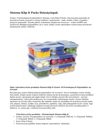 Sistema Klip It Packs Dziesięciopak Zestaw 10 prostokątnych pojemników Sistema z serii Klip It Packs. Innowacyjne pojemniki do przechowywania żywności o różnej wielkości i pojemności - małe, średnie i duże, wygodne i poręczne pojemniki. Wysoka jakość wykonania, bezpieczne tworzywo - wolne od BPA oraz możliwość układania pojemników się w stosy, dzięki czemu optymalnie wykorzystasz przestrzeń kuchennych szafek i lodówki. Opis i charakterystyka produktu Sistema Klip It Zestaw 10 Prostokątnych Pojemników na żywność Rewelacyjny zestaw funkcjonalnych pojemników do żywności. Jest to niezbędny zestaw każdej Pani domu. Dzięki niemu wnętrze lodówki zmieni się nie do poznania, a przechowywanie posiłków będzie proste i przyjemne jak nigdy dotąd. Jest to idealny prezent dla nowożeńców - prezent niezapomniany i niezwykle praktyczny, bo to pojemniki codziennego użytku. Zestaw idealnie sprawdzi się również jako wyprawka dla studenta, stanie się niezbędny do przechowywania masła, soli, pieprzu, dżemu, wędlin, sera, pomidorów, ogórków, zupy, dań jednogarnkowych i ciasta. Jego system piętrowania i idealnego dopasowywania pozwoli zmieścić się nawet na jednej półce w lodówce, co ważne gdy z lodówki korzysta kilka osób. Charakterystyka produktu - Dziesięciopak Sistema Klip It: • Zestaw zawiera 10 pojemników na żywność: 2 x Pojemnik 2000 ml, 3 x Pojemnik 1000ml, 3 x Pojemnik 400ml, 2 x Pojemnik 200ml • Seria: Klip It Packs • Przeźroczyste pudełka, kolory klipsów (zatrzasków): niebieskie JAKOŚĆ SISTEMA to wysokiej klasy tworzywo wolne od szkodliwego dla zdrowia bisfenolu (BPA free) oraz niezawodne zatrzaski, które pozwolą bezpiecznie przewieźć zawartość w podróży. Dodatkowym atutem jest estetyka wykonania oraz ładne, żywe kolory. Właśnie te cechy odróżniają pojemniki SISTEMA od szybko tracących kształt i szczelność tańszych produktów innych firm. Produkt z serii Sistema Klip It przeznaczony jest do mycia w zmywarce, podgrzewania w mikrofalówce i zamrażania! Sistema - system innowacyjnych pojemników na żywność. Prosto z Nowej Zelandii. Sistema to marka innowacyjnych pojemników do żywności projektowanych i produkowanych w Nowej Zelandii. Marka Sistema® powstała 30 lat temu i jej produkty cieszą się ogromnym powodzeniem, szybko stając się domową ikoną, a tym samym zdobywając serca klientów i półki kuchennych szafek w milionach domów na świecie. Nasze produkty wyróżniają się nowatorskimi rozwiązaniami, oryginalnymi wzorami i kształtami a także żywymi kolorami. Plastikowe pojemniki na żywność Sistema, w tym Pojemniki na żywność Dziesięciopak z serii Sistema Klip It Packs są wolne od BPA Wśród konsumentów rośnie obawa, związana z chemikaliami, a w szczególności BPA - który to związek chemiczny może spowodować skażenie lub zanieczyszczenie przechowywanej żywności lub napojów. Pojemniki oraz butelki firmy Sistema zawierają oznaczenie "BPA Free" co oznacza że są wyprodukowane z materiałów wolnych od BPA lub ołowiu oraz ww związki nie były użyte na żadnym z etapów produkcji produktów firmy Sistema. www.kulturystyka.sklep.pl