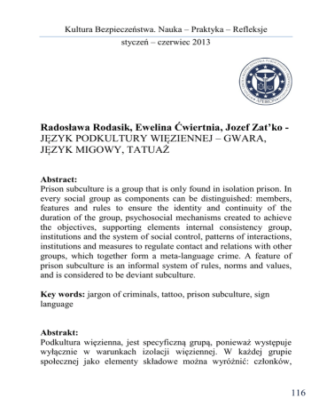 Kultura Bezpieczeństwa. Nauka – Praktyka – Refleksje styczeń – czerwiec 2013 Radosława Rodasik, Ewelina Ćwiertnia, Jozef Zat’ko JĘZYK PODKULTURY WIĘZIENNEJ – GWARA, JĘZYK MIGOWY, TATUAŻ Abstract: Prison subculture is a group that is only found in isolation prison. In every social group as components can be distinguished: members, features and rules to ensure the identity and continuity of the duration of the group, psychosocial mechanisms created to achieve the objectives, supporting elements internal consistency group, institutions and the system of social control, patterns of interactions, institutions and measures to regulate contact and relations with other groups, which together form a meta-language crime. A feature of prison subculture is an informal system of rules, norms and values, and is considered to be deviant subculture. Key words: jargon of criminals, tattoo, prison subculture, sign language Abstrakt: Podkultura więzienna, jest specyficzną grupą, ponieważ występuje wyłącznie w warunkach izolacji więziennej. W każdej grupie społecznej jako elementy składowe można wyróżnić: członków, 116 Kultura Bezpieczeństwa. Nauka – Praktyka – Refleksje styczeń – czerwiec 2013 cechy i zasady gwarantujące identyczność i ciągłość trwania grupy, mechanizmy psychospołeczne wytwarzane dla realizacji celów; elementy podtrzymujące spójność wewnętrzną grupy, instytucje i system kontroli społecznej, wzory wzajemnych oddziaływań, wzory zachowania; instytucje i środki regulowania styczności i stosunków z innymi grupami, które razem tworzą metajęzyk kryminalny. Cechą podkultury więziennej jest nieformalny system zasad, norm i wartości i zaliczana jest do podkultur dewiacyjnych. Słowa klucze: gwara więzienna, tatuaż, subkultura więzienna, język migowy 117 Kultura Bezpieczeństwa. Nauka – Praktyka – Refleksje styczeń – czerwiec 2013 Podkultura więzienna jest zjawiskiem niesformalizowanym, stojącym w opozycji do oficjalnych przepisów zakładu karnego. Określa ona społeczną stratyfikację skazanych dzieląc ich na „grypsujących”, „niegrypsujących” oraz „cweli”. Istnienie zewnętrznego zjawiska podkultury więziennej ma negatywny wpływ na proces administrowania resocjalizacją oraz kulturę bezpieczeństwa w państwie.122 Istnienie „drugiego życia”, będącego pojęciem synonimicznym do zjawiska podkultury, określone jest dla wszystkich organizacji formalnych. Wśród charakterystycznych cech każdej podkultury Matusewicz wymienia swoisty język, swoistą fonację uczuciowo-emocjonalną, specyficzne formy zachowania, specyficzny system wartości123. Wszystkie te elementy istnieją także w podkulturze więziennej, a realizowane są przede wszystkim przez więźniów grypsujących. Formalna organizacja więźniów jest oparta na przepisach prawa, ściśle określających całokształt zachowań więźniów poprzez ustalone nakazy i zakazy. Pod formalnym nurtem, istnieje w więzieniach nurt nieformalny, podziemny. Według Machela społeczność więźniów pozostaje pod wpływem dwóch ośrodków decyzyjnych: pierwszym – oficjalnym i prawnie usankcjonowanym – jest administracja zakładu penitencjarnego, natomiast drugim – struktury podkultury więziennej124. Oprócz jawnych, odgórnie narzuconych norm, istnieje zbiór zasad podskórnych, kolidujący z powszechnie uznawanymi normami i przeciwstawny celom 122 J. Piwowarski, B. Płonka, Etyka w administracji i zarządzaniu publicznym. Motywacje, realizacja, bezpieczeństwo, Kraków 2012, s. 81. 123 Cz. Matusewicz, Psychologia, Warszawa 1975, s. 149. 124 S. Przybyliński, Podkultura więzienna – wielowymiarowość rzeczywistości penitencjarnej, Kraków 2006, s. 20. 118 Kultura Bezpieczeństwa. Nauka – Praktyka – Refleksje styczeń – czerwiec 2013 resocjalizacyjnym. Zjawisko podkultury więziennej traktować jako system, którego głównymi elementami są: należy specyficzna hierarchia wartości i związany z nią system norm postępowania; swoisty styl bycia i zwyczaje; hierarchia społeczna; osobliwe wytwory podkulturowe (m.in. gwara, tatuaże, poezja, piosenki)125. W niniejszych rozważaniach chcemy skupić się na ostatnim z wymienionych elementów w kontekście języka i komunikacji funkcjonujących w podskórnym życiu więziennym. Stanowią one metajęzyk kryminalny, który jest jedynie zrozumiały dzięki identycznej asocjacji między nadawcą a odbiorcą.126 Gwara więzienna (grypsera) Niektóre zjawiska podkultury więziennej znane były już w XIX w. Karol Estreicher w 1867 r. w Gazecie Polskiej pisał na temat języka przestępców: „widać z nazw niektórych, że je obmyślili filuci wyższego stopnia. Uczony filolog daremnie by łamał sobie głowę, aby wywieść pochodzenie wielu wyrazów”127. 125 Ibidem, s. 22. G. W. Matsell, The Secret Language of Crime: Vocabulum or the Rogue's Lexicon, Cosimo Classics, New York 2008; L. M. Solan, P. M. Tiersma, Speaking of Crime. The Language of Criminal Justice, The University of Chicago Press, London 2005. 127 Ibidem, s. 26. 126 119 Kultura Bezpieczeństwa. Nauka – Praktyka – Refleksje styczeń – czerwiec 2013 Gwara więzienna była również przedmiotem zainteresowania Polskiej Policji Państwowej w okresie międzywojennym. „Autorzy publikacji dowodzili, że służba bezpieczeństwa publicznego da z siebie wszystko wtedy, gdy podczas śledztwa zastosowane zostaną szeroko rozumiane środki techniczne, którymi w dniu dzisiejszym w myśl nowych wyników wiedzy kryminogennej dysponuje policja, a jakie przy umyślnym użyciu mogą się przyczynić do ujawnienia prawdy o przestępcy128. Grypsera wywodzi się ze środowiska warszawskiego, a jako miejsce jej powstania podawany jest nieistniejący już Zakład Karny na „Gęsiówce” w Warszawie129. Grypsera rozpowszechniła się na terenie całego kraju, szczególnie w dużych zakładach karnych dla młodocianych. Klemens Stę
