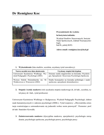 Dr Remigiusz Koc Przynależność do wydziału/instytutu/zakładu: Wydział Studiów Stosowanych, Instytut Nauk Społecznych, Zakład Neuropsychologii, bud K, pokój K05) Adres email: [email protected] 1. Wykształcenie (lata studiów, uczelnia, uzyskany tytuł zawodowy): Nazwa uczelni oraz data ukończenia Uniwersytet Kazimierza Wielkiego. Wydział Pedagogiki i Psychologii (2003) Uzyskany stopień lub dyplom Dzienne studia magisterskie na kierunku: Psychologia; Specjalność: Stosowana Psychologia Społeczna Wyższa Szkoła Dziennikarska im. M. Wańkowicza w Warszawie (2002) Studia licencjackie na kierunku politologia i nauki społeczne; specjalność dziennikarstwo 2. Stopnie i tytuły naukowe (rok uzyskania stopnia naukowego dr, dr hab., uczelnia, tytuł pracy dr i hab., tytuł profesora): Uniwersytet Kazimierza Wielkiego w Bydgoszczy; Wydział Pedagogiki Psychologii; doktor nauk humanistycznych w zakresie psychologii (2008r.). Tytuł rozprawy: „Obywatelska orientacja wartościująca a ustosunkowanie się jednostki wobec norm prawnych”. Promotor: prof. dr hab. Stanisław Kowalik. 3. Zainteresowania naukowe (dyscyplina naukowa, specjalności): psychologia zarządzania, psychologia społeczna, psychologia prawa, psychologia pracy 4. Przynależność do organizacji i towarzystw naukowych (polskich i międzynarodowych): Polskie Towarzystwo Ekonomiczne 5. Pełnione funkcje (obecnie i w przeszłości w Uczelni i poza Uczelnią): --6. Kształcenie kadry naukowej (liczba wypromowanych magistrów, doktorów, recenzje prac dr i hab. oraz wniosków o tytuł profesora): --7. Tematyka naukowo-badawcza (prowadzone badania): • psychologia prawa (kultura prawna w ujęciu psychologicznym, socjalizacja prawna) • psychologia polityczna (determinanty i korelaty obywatelskiej orientacji wartościującej) • zarządzanie organizacją i personelem, metody jakościowe i ilościowe z zarządzaniu • metody rozwoju i diagnozy kompetencji psychospołecznych • psychologia ucznia i nauczyciela • neuropsychologia • neuromarketing 8. Realizowane projekty (naukowo-badawcze, badawczo-rozwojowe, finansowane z programów operacyjnych, z programów ramowych UE): • m.in. udział w realizacji projektów: „Voucher badawczy”, projektów szkoleniowych i doradczych realizowanych w ramach POKL, projektów innowacyjnych (np. opracowanie e-usługi w ramach POIG). 9. Dorobek naukowy (wykaz publikacji): Koc, R. (2014). Wybrane problemy psychologicznego funkcjonowania nauczycielawychowawcy. w: A. Kozubska, R. Koc, P. Ziółkowski, (red.). Nauczyciel w drodze do profesjonalizmu. Bydgoszcz: Wydawnictwo WSG. Koc, R. (2011). Ocena osiągnięć edukacyjnych uczniów, W: S. Kowalik (red.), Psychologia ucznia i nauczyciela, Warszawa: Wydawnictwo Naukowe PWN Koc, R. (2011). Konflikty w środowisku szkolnym, W: S. Kowalik (red.), Psychologia ucznia i nauczyciela, Warszawa: Wydawnictwo Naukowe PWN. Koc, R. (2011). Promocja szkoły i jej współpraca ze środowiskiem lokalnym, W: S. Kowalik (red.), Psychologia ucznia i nauczyciela, Warszawa: Wydawnictwo Naukowe PWN Zirk-Sadowski, M. Gomułowicz, A., Koc, R., Kowalik, S. (2010). Sędzia sądu administracyjnego a idea prawa. Zeszyty Naukowe Sądownictwa Administracyjnego, 2(29). Koc, R. (2008). Poczucie jakości życia a ustosunkowanie się jednostki wobec norm prawnych. W: S. Kowalik (red.), Autorytety w życiu codziennym, Bydgoszcz: Wydawnictwo Uczelniane WSG, (229-256). Koc, R., Mazur, Ł. (2007). Psychologia kobiety czy psychologia dla kobiet – specyfika wiedzy psychologicznej we współczesnej polskiej prasie kobiecej na podstawie treści wybranych tytułów prasowych. W: B. Aouil, W. J. Maliszewski (red.), Media – komunikacja: Zdrowie i psychologia, Toruń: Wydawnictwo A. Marszałek. Koc, R., (2006). Obywatelska orientacja wartościująca a gotowość udziału w wyborach politycznych. W: A. Bronowicka (red.), Wyzwania i zagrożenia demokracji w Polsce w obliczu wyborów parlamentarnych i prezydenckich 2005, Opole: Wydawnictwo Uniwersytetu Opolskiego. Koc, R., (2006). Zjawisko zmęczenia w badaniach międzykulturowych – psychospołeczna analiza intensywności oraz zakresu zmęczenia wśród mieszkańców Polski i Czech. W: R. Kijak, A. Froelich (red.), Dialog o wybranych problemach współczesnego świata, Bydgoszcz: Wydawnictwo Kujawsko-Pomorskiej Szkoły Wyższej. Koc, R. (2006). Podmiotowe i sytuacyjne uwarunkowania personifikacji procesów politycznych. W: J. Klebaniuk (red.), Człowiek wobec masowych zjawisk społecznych. Wrocław: Oficyna Wydawnicza ATUT. 10. Uzyskane patenty (jeżeli są): ---11. Zajęcia dydaktyczne (tytuły przedmiotów i rodzaj zajęć – wykłady, konwersatoria, seminaria): psychologia ogólna, psychologia społeczna, psychologia pracy, wprowadzenie do psychologii osobowości, psychologia zarządzania,