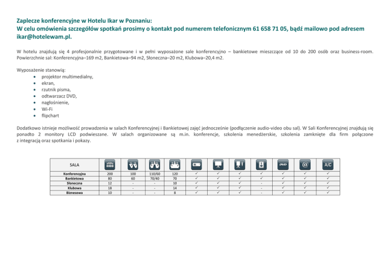 Zaplecze konferencyjne w Hotelu Ikar w Poznaniu: W celu omówienia szczegółów spotkań prosimy o kontakt pod numerem telefonicznym 61 658 71 05, bądź mailowo pod adresem [email protected]. W hotelu znajdują się 4 profesjonalnie przygotowane i w pełni wyposażone sale konferencyjno – bankietowe mieszczące od 10 do 200 osób oraz business-room. Powierzchnie sal: Konferencyjna–169 m2, Bankietowa–94 m2, Słoneczna–20 m2, Klubowa–20,4 m2. Wyposażenie stanowią: projektor multimedialny, ekran, rzutnik pisma, odtwarzacz DVD, nagłośnienie, Wi-Fi flipchart Dodatkowo istnieje możliwość prowadzenia w salach Konferencyjnej i Bankietowej zajęć jednocześnie (podłączenie audio-video obu sal). W Sali Konferencyjnej znajdują się ponadto 2 monitory LCD podwieszane. W salach organizowane są m.in. konferencje, szkolenia menedżerskie, szkolenia zamknięte dla firm połączone z integracją oraz spotkania i pokazy. SALA Konferencyjna Bankietowa Słoneczna Klubowa Biznesowa 200 80 12 18 10 100 60 - 110/60 70/40 - 120 70 10 14 8 -