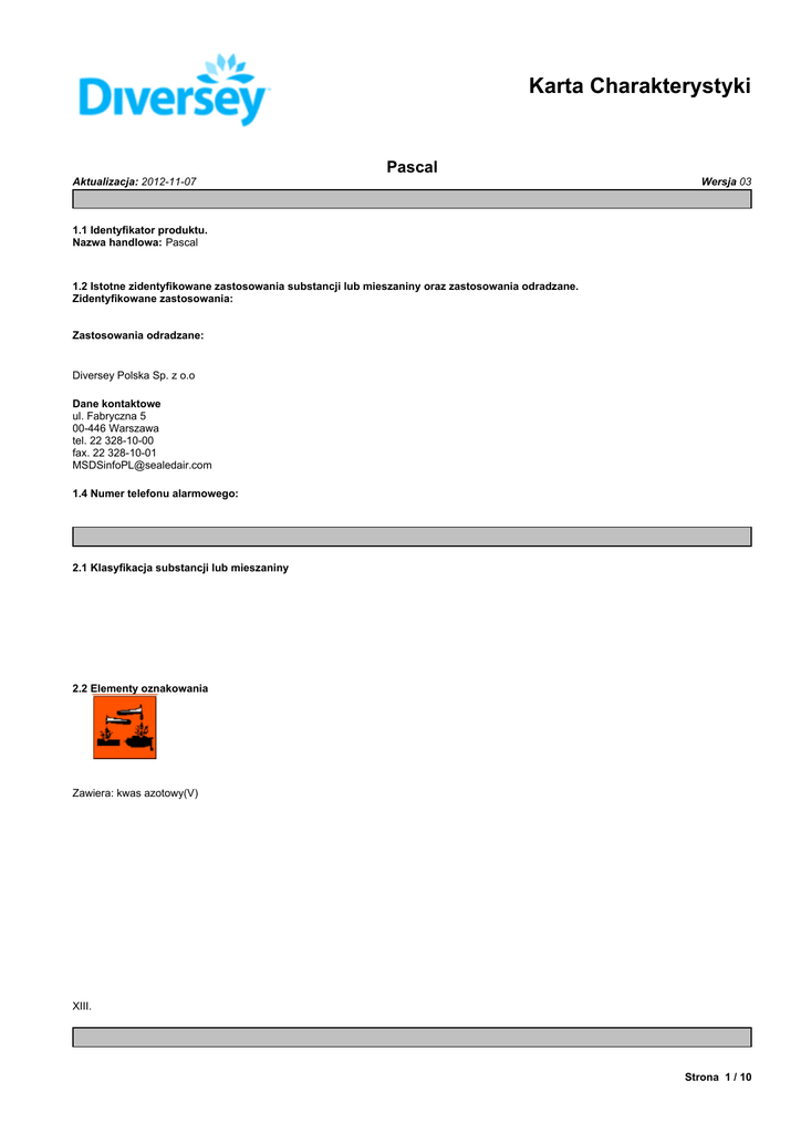 Karta Charakterystyki Pascal Aktualizacja: 2012-11-07 Wersja 03 1.1 Identyfikator produktu. Nazwa handlowa: Pascal 1.2 Istotne zidentyfikowane zastosowania substancji lub mieszaniny oraz zastosowania odradzane. Zidentyfikowane zastosowania: Zastosowania odradzane: Diversey Polska Sp. z o.o Dane kontaktowe ul. Fabryczna 5 00-446 Warszawa tel. 22 328-10-00 fax. 22 328-10-01 [email protected] 1.4 Numer telefonu alarmowego: 2.1 Klasyfikacja substancji lub mieszaniny 2.2 Elementy oznakowania Zawiera: kwas azotowy(V) XIII. Strona 1 / 10 KARTA CHARAKTERYSTYKI Pascal 3.2 Mieszaniny kwas azotowy(V) Numer WE Numer CAS Numer REACH Klasyfikacja 231-714-2 7697-37-2 01-2119487297-23 C,O; R8-35 Klasyfikacja zgodna z Uwagi (WE) 1272/2008 Skin Corr. 1A (H314) Met. Corr. 1 (H290) Ox. Liq. 3 (H272) (EUH071) Procent wagowy 30-50 * Polimer. Informacje ogólne Wdychanie Kontakt z oczami pierwszej pomocy: Wdychanie Kontakt z oczami substancji, patrz sekcja 11. alkoholu. 6.4 Odniesienia do innych sekcji Strona 2 / 10 KARTA CHARAKTERYSTYKI Pascal Zgodnie z przepisami lokalnymi i krajowymi. siarczyny. Podstawowe warunki przechowywania 10.4. kwas azotowy(V) dopuszczalne dopuszczalne 1.4 mg/m3 (NDSCh) 2.6 mg/m3 Zalecane procedury monitorowania: krótkoterminowe skutki miejscowe krótkoterminowe skutki ogólnoustrojowe skutki miejscowe skutki ogólnoustrojowe danych danych danych danych krótkoterminowe skutki miejscowe krótkoterminowe skutki ogólnoustrojowe (mg / kg mc) skutki miejscowe skutki ogólnoustrojowe (mg / kg mc) danych danych danych danych krótkoterminowe skutki miejscowe krótkoterminowe skutki ogólnoustrojowe (mg / kg mc) skutki miejscowe skutki ogólnoustrojowe (mg / kg mc) danych danych danych danych krótkoterminowe skutki miejscowe krótkoterminowe skutki ogólnoustrojowe skutki miejscowe skutki ogólnoustrojowe kwas azotowy(V) kwas azotowy(V) kwas azotowy(V) 3) kwas azotowy(V) 2.6 1.3 danych danych Strona 3 / 10 KARTA CHARAKTERYSTYKI Pascal 3) krótkoterminowe skutki miejscowe kwas azotowy(V) krótkoterminowe skutki ogólnoustrojowe 1.3 skutki miejscowe skutki ogólnoustrojowe 0.65 danych Wody powierzchniowe, (mg / l) danych danych Okresowe (mg / l) Oczyszczalnia danych danych danych Osady morskie (mg / kg) Gleba (mg / kg) W powietrzu (mg/m3) (mg / kg) danych danych danych danych kwas azotowy(V) kwas azotowy(V) produktu: Okulary ochronne lub gogle (EN166). Ochrona oczu / twarzy: Czas przebicia >= 480 min Czas przebicia >= 30 min skóry i/ lub rozbryzgi. Ochrona dróg oddechowych: wód powierzchniowych i wód gruntowych. roztworem roboczym produktu: 3 . Ochrona oczu / twarzy: Strona 4 / 10 KARTA CHARAKTERYSTYKI Pascal Czas przebicia >= 480 min Czas przebicia >= 30 min Ochrona dróg oddechowych: Metoda/ uwaga Barwa Przejrzysty Bezbarwny Zapach Charakterystyczny Próg zapachu Nie dotyczy. pH: Nie dotyczy. Podtrzymuje palenie: Nie dotyczy. 1.31 g/cm³ (20°C) 9.2. Inne informacje Korozja metali (zgodnie z IMDG/ADR): Strona 5 / 10 KARTA CHARAKTERYSTYKI Pascal metalami. SEKCJA 11: Informacje toksykologiczne Mieszaniny Punkt Gatunek: Metoda Czas ekspozycji (h) Gatunek: Metoda Czas ekspozycji (h) Gatunek: Metoda Czas ekspozycji (h) Szczur OECD 403 (EU B.2) (mg / kg) kwas azotowy(V) Brak danych Punkt (mg / kg) kwas azotowy(V) Brak danych Punkt (mg / l) kwas azotowy(V) LC 50 1562.5 Wynik Gatunek Królik Metoda Metody nie podano Czas ekspozycji Wynik Gatunek Metoda Metody nie podano Czas ekspozycji Wynik Gatunek Metoda Czas ekspozycji Gatunek Metoda Czas ekspozycji (h) Gatunek Metoda Czas ekspozycji kwas azotowy(V) kwas azotowy(V) kwas azotowy(V) danych. Wynik kwas azotowy(V) danych Wynik kwas azotowy(V) danych Strona 6 / 10 KARTA CHARAKTERYSTYKI Pascal Punkt Gatunek Metoda Szczur OECD 422, oral Gatunek Metoda Czas ekspozycji (dni) Gatunek Metoda Czas ekspozycji (dni) (mg/kg bw/d) kwas azotowy(V) NOAEL 1500 Punkt (mg/kg bw/d) kwas azotowy(V) Czas ekspozycji (dni) 28 Brak danych Punkt (mg/kg bw/d) kwas azotowy(V) Brak danych Drogi Punkt Gatunek Metoda Czas ekspozycji (dni) (mg/kg bw/d) kwas azotowy(V) Komentarze docelowe Brak danych Dane mieszaniny: Zmiana kwas azotowy(V) Wynik (in vitro) Metoda (in vitro) Wynik (in vivo) Metoda (in vivo) kwas azotowy(V) Punkt kwas azotowy(V) Specyficzny efekt NOAEL Gatunek (mg / kg mc / d) 1500 Metoda Szczur Czas ekspozycji inne skutki OECD 422, oral Potencjalne szkodliwe skutki dla zdrowia i objawy SEKCJA 12: Informacje ekologiczne Mieszaniny Brak danych dla mieszaniny. Punkt Gatunek Metoda Gambusia affinis Metody nie podano Gatunek Metoda Daphnia magna Straus Brak wytycznych do badania (mg / l) kwas azotowy(V) LC 50 72 Punkt (mg / l) kwas azotowy(V) EC 50 8609 Czas ekspozycji (h) 96 Czas ekspozycji (h) 24 Strona 7 / 10 KARTA CHARAKTERYSTYKI Pascal Punkt Gatunek Metoda badawcza Czas ekspozycji (h) Gatunek Metoda Czas ekspozycji (dni) Inokulum Metoda Czas ekspozycji (mg / l) kwas azotowy(V) Brak danych Punkt (mg / l) kwas azotowy(V) Brak danych Punkt (mg / l) Brak kwas azotowy(V) danych Punkt kwas azotowy(V) LD (mg / l) 8226 50 Punkt Gatunek Metoda Oncorhynchus mykiss Metody nie podano Gatunek Metoda (mg / l) Brak kwas azotowy(V) Czas ekspozycji 96 godzin (a) (y) Zaobserwowano efekty Czas ekspozycji Zaobserwowane skutki danych Biodegradacja Inokulum Metoda analityczna DT50 Metoda kwas azotowy(V) Ocena Nie dotyczy (substancji nieorganicznej) Metoda kwas azotowy(V) Ocena Nie dotyczy, nie ulega bioakumulacji Komentarz danych Strona 8 / 10 KARTA CHARAKTERYSTYKI Pascal Gatunek Metoda Ocena Komentarz kwas azotowy(V) danych Adsorpcja / desorpcja w glebie lub osadzie adsorpcji Log Koc desorpcji Log Koc(des) Metoda badawcza Gleba / typ osadu Ocena kwas azotowy(V) danych wodnym 13.1. Metody unieszkodliwiania odpadów 20 01 14* - Kwasy. Katalog odpadów: Puste opakowanie Zalecenie: ADR, RID, ADN, IMO / IMDG, ICAO / IATA 14.1 Numer UN (numer ONZ): 2031 Kwas azotowy , roztwór Nitric acid , solution Klasa: 8 Nalepka (i): 8 14.4 Grupa pakowania: II Nie. Nie. Nieznane. kontenerach do p