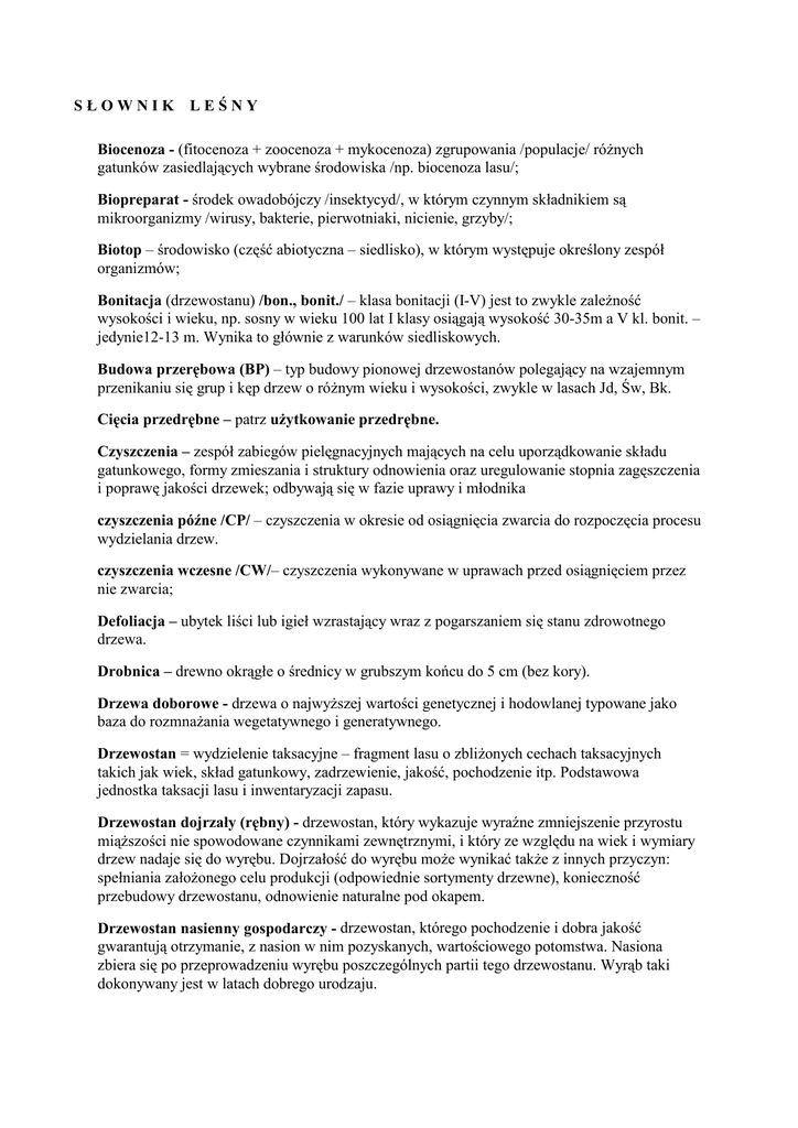 SŁOWNIK LEŚNY Biocenoza - (fitocenoza + zoocenoza + mykocenoza) zgrupowania /populacje/ różnych gatunków zasiedlających wybrane środowiska /np. biocenoza lasu/; Biopreparat - środek owadobójczy /insektycyd/, w którym czynnym składnikiem są mikroorganizmy /wirusy, bakterie, pierwotniaki, nicienie, grzyby/; Biotop – środowisko (część abiotyczna – siedlisko), w którym występuje określony zespół organizmów; Bonitacja (drzewostanu) /bon., bonit./ – klasa bonitacji (I-V) jest to zwykle zależność wysokości i wieku, np. sosny w wieku 100 lat I klasy osiągają wysokość 30-35m a V kl. bonit. – jedynie12-13 m. Wynika to głównie z warunków siedliskowych. Budowa przerębowa (BP) – typ budowy pionowej drzewostanów polegający na wzajemnym przenikaniu się grup i kęp drzew o różnym wieku i wysokości, zwykle w lasach Jd, Św, Bk. Cięcia przedrębne – patrz użytkowanie przedrębne. Czyszczenia – zespół zabiegów pielęgnacyjnych mających na celu uporządkowanie składu gatunkowego, formy zmieszania i struktury odnowienia oraz uregulowanie stopnia zagęszczenia i poprawę jakości drzewek; odbywają się w fazie uprawy i młodnika czyszczenia późne /CP/ – czyszczenia w okresie od osiągnięcia zwarcia do rozpoczęcia procesu wydzielania drzew. czyszczenia wczesne /CW/– czyszczenia wykonywane w uprawach przed osiągnięciem przez nie zwarcia; Defoliacja – ubytek liści lub igieł wzrastający wraz z pogarszaniem się stanu zdrowotnego drzewa. Drobnica – drewno okrągłe o średnicy w grubszym końcu do 5 cm (bez kory). Drzewa doborowe - drzewa o najwyższej wartości genetycznej i hodowlanej typowane jako baza do rozmnażania wegetatywnego i generatywnego. Drzewostan = wydzielenie taksacyjne – fragment lasu o zbliżonych cechach taksacyjnych takich jak wiek, skład gatunkowy, zadrzewienie, jakość, pochodzenie itp. Podstawowa jednostka taksacji lasu i inwentaryzacji zapasu. Drzewostan dojrzały (rębny) - drzewostan, który wykazuje wyraźne zmniejszenie przyrostu miąższości nie spowodowane czynnikami zewnętrznymi, i który ze względu na wiek i wymiary drzew nadaje się do wyrębu. Dojrzałość do wyrębu może wynikać także z innych przyczyn: spełniania założonego celu produkcji (odpowiednie sortymenty drzewne), konieczność przebudowy drzewostanu, odnowienie naturalne pod okapem. Drzewostan nasienny gospodarczy - drzewostan, którego pochodzenie i dobra jakość gwarantują otrzymanie, z nasion w nim pozyskanych, wartościowego potomstwa. Nasiona zbiera się po przeprowadzeniu wyrębu poszczególnych partii tego drzewostanu. Wyrąb taki dokonywany jest w latach dobrego urodzaju. Drzewostan nasienny wyłączony - drzewostan nasienny o najwyższej jakości genetycznej, gdzie zbiór nasion przeprowadza się głównie z drzew stojących (wyłączone z cięć rębnych). Drzewostany zachowawcze – drzewostany wydzielone dla zachowania zagrożonych populacji drzew leśnych rodzimych proweniencji. Dzielnica przyrodniczo-leśna - jednostka w obrębie krainy przyrodniczo-leśnej, jednolita pod względem warunków fizjograficznych. Ekologia nauka zajmująca się badaniem wzajemnych zależności między organizmami oraz między organizmami a środowiskiem, w którym one żyją; Ekorozwój /zwany też rozwojem zrównoważonym/ podporządkowanie potrzeb i aspiracji społeczeństwa /i państwa/ możliwościom środowiska; prowadzenie wszelkiej działalności gospodarczej w harmonii z przyrodą; Ekosystem leśny – podstawowa funkcjonalna jednostka ekologiczna reprezentowana przez względnie jednorodny płat lasu, w obrębie którego siedlisko, świat roślin i zwierząt pozostają ze sobą w stosunkach wzajemnych zależności, tworząc układ dynamicznie utrzymujący się jako całość. Ekotyp utrwalona dziedzicznie forma ekologiczna (rasa) gatunku uwarunkowana specyficznymi (lokalnymi) właściwościami środowiska; Emisje przemysłowe – gazowe związki chemiczne i pyły wydzielane do atmosfery przez zakłady przemysłowe, komunalne i inne. Epifitoza – epidemiczne (masowe) występowanie zachorowań roślin na określonym obszarze, powodowane przez jeden czynnik chorobotwórczy (np. grzyba), którego masowe wystąpienie ułatwił układ warunków sprzyjających jego rozwojowi. Eutrofizacja – gromadzenie się w środowisku, w wyniku procesów naturalnych lub antropogenicznych, substancji pokarmowych w ilościach przekraczających możliwości ich zużycia lub rozkładu przez organizmy. Foliofagi – owady liściożerne. Gradacja - masowe, przybierające wręcz charakter klęski, występowanie szkodliwych owadów w wyniku korzystnego dla danego gatunku układu czynników ekologicznych. Grubizna – (1) miąższość drzewa od wysokości pniaka, do średnicy w cieńszym końcu co najmniej 7 cm w korze (dotyczy zapasu na pniu); (2) drewno okrągłe o średnicy w cieńszym końcu bez kory co najmniej 5 cm (dotyczy drewna pozyskanego); grubizna brutto – w korze; grubizna netto – bez kory. Halizna – powierzchnia pozbawiona drzewostanu przez okres dłuższy niż 2 lata (w sytuacjach poklęskowych 5 lat), bądź uprawa lub młodnik pierwszej klasy wieku o zadrzewieniu niższym niż 0,5. Imisje zanieczyszczeń – zanieczyszczenia gazowe i pyłowe powietrza atmosferycznego oddziałujące na otoczenie, tj. docierające do organizmów lub ekosystemów i wywierające na nie wpływ. Jednostki organizacyjne Lasów Państwowych - Dyrekcja Generalna Lasów Państwowych, Dyrekcja Regionalna Lasów Państwowych, Nadleśnictwo (po 2-3 obręby), Leśnictwo (około 11,5 tys ha lasu) Klasa do odnowienia (KDO) – typ budowy pionowej drzewostanów, w których ma miejsce równoczesne użytkowanie i odnawianie pod osłoną drzewostanu macierzystego, o stanie odnowienia nie spełniającym jeszcze zakładanych wymogów. Klasa odnowienia (KO) – typ budowy pionowej drzewostanów, w których ma miejsce równoczesne użytkowanie i odnawianie pod osłoną