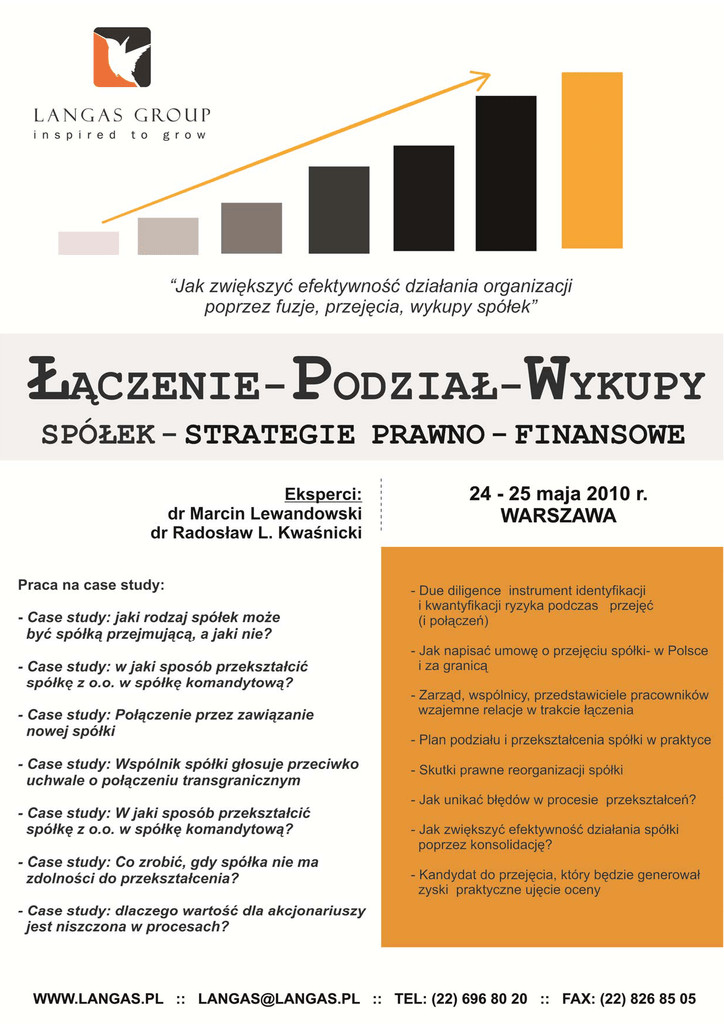 ŁĄCZENIE – PODZIAŁ – WYKUPY SPÓŁEK - strategie prawno-finansowe 100% gwarancji satysfakcji Szanowni Państwo! EKSPERCI Sprawne łączenie, podział i wykupy spółek wymaga interdyscyplinarnego podejścia i praktycznego ujęcia. Prawidłowo przeprowadzona transformacja przedsiębiorstwa, czy dopięta transakcja może znacząco wpłynąć na: − uzyskanie korzyści z dużej skali działania, − dostęp do nowych rynków zbytu, − wzrost efektywności działań, dzięki wykorzystaniu naprawdę dobrych i sprawdzonych produktów, przejętych marek i procesów, − stabilność otoczenie organizacyjnego, przyczyniając się do większej odporności na wstrząsy wynikające z załamania się sytuacji w określonym segmencie rynku. dr RADOSŁAW L. KWAŚNICKI − Radca prawny; doradca prawny w zakresie prawa korporacyjnego, prywatyzacji, połączeń i przejęć (M&A) na rynku krajowym i międzynarodowym; − Uczestnik wielu sporów korporacyjnych i związanych z nimi postępowań; − Przewodniczący i członek Rad Nadzorczych największych Spółek Skarby Państwa − Wykładowca na kursach dla kandydatów na członków rad nadzorczych spółek z udziałem Zapraszamy do udziału w szkoleniu, które stanowi kompleksowe i praktyczne wsparcie dla Państwa wiedzy w zakresie najbardziej strategicznych elementów prawnofinansowych fuzji, przejęć, przekształceń, podziałów i wykupów spółek. Na szkoleniu zostaną przytoczone liczne przykłady z praktyki polskich spółek, wyjaśniające m.in.: − Skarbu Państwa i jednostek samorządu terytorialnego; − Wykładowca na krajowych i międzynarodowych konferencjach i seminariach poświęconych prawu gospodarczemu; − Członek Kolegium Redakcyjnego „Monitora Prawniczego” (C.H. Beck); − skutki prawne i finansowe przejęć i połączeń − istota due diligence – jako instrumentu identyfikacji i oceny ryzyka podczas przejęć i połączeń − w jaki sposób przygotować umowę przejęcia w Polsce jak i zagranicą − wzajemne relacje pomiędzy zarządem a wspólnikami w trakcie reorganizacji przedsiębiorstwa − specyfikę połączeń transgranicznych, ze szczególnym uwzględnieniem tworzenia umów przy tego rodzaju połączeniach − jak dokonać oceny ekonomicznej fuzji i przejęć − w jaki sposób wyceniać wartości w procesach fuzji i przejęć − stosowanie kredytów i innych instrumentów finansowania w wykupie przedsiębiorstwa − jak dokonać wyceny łączących się przedsiębiorstw pochodzących z różnych branż − nowoczesne metody obrony przed wrogim przejęciem − Redaktor oraz główny autor praktycznego podręcznika „Spółka z ograniczoną odpowiedzialnością” (C.H. Beck, Warszawa 2005 r.); − Współautor komentarza do prawa bankowego pod. red. F. Zolla (Zakamycze, Kraków 2005 r.); − Autor ponad dwustu publikacji poświęconych praktycznym aspektom prawa gospodarczego m.in. w czasopismach „Prawo Bankowe”, „Gazeta Prawna”, „Rzeczpospolita”, „Puls Biznesu”. dr MARCIN LEWANDOWSKI − Doradca finansowy, ekonomicznych Przedstawiciele Zarządów Dyrektorzy zarządzający Członkowie Rad Nadzorczych Dyrektorzy finansowi Pracownicy działów prawnych i organizacyjnych Osoby odpowiedzialne za bezpośrednią obsługę spółek Osoby mające do czynienia z procesami transformacyjnymi spółek LANGAS GROUP − Członkiem Założycielem Polskiego Stowarzyszenia Biegłych w Dziedzinie Wycen Przedsiębiorstw (PSBWP). Autor książek i publikacji. − W latach 2000-2001 menedżer w BRE Corporate Finance, gdzie realizował projekty z zakresu prywatyzacji, poszukiwania kapitału, wycen wartości, restrukturyzacji kapitałowej oraz analiz przedinwestycyjnych. W okresie 1994-2000 pracował w firmie F5 Konsulting w Poznaniu. ADRESACI SZKOLENIA − − − − − − − nauk − Prezes Zarządu Antares Corporate Finance Sp. z o.o., jest Zachęcam do zapoznania się ze szczegółową ofertą. W przypadku jakichkolwiek pytań proszę o kontakt: telefoniczny (22) 696 80 20 z zespołem Langas Group, lub za pomocą poczty elektronicznej [email protected] Z poważaniem, Barbara Zielińska Kierownik Projektu doktor :: TEL: (22) 696 80 20 − Uczestniczył w projektach związanych z opracowywaniem strategii rozwojowej spółek, analizami strategicznymi i prywatyzacją, dezinwestycjami, sprzedażą spółek, analizą przedsięwzięć inwestycyjnych, analizami typu due diligence oraz wycenami wartości dla celów przejęć (firmy w sektorze budowlanym) oraz restrukturyzacją grup kapitałowych. Aby zapewnić Cię, że Twoja decyzja o uczestnictwie w naszym szkoleniu, nie jest związana z ryzykiem, dajemy Ci 100% gwarancji satysfakcji. Jeżeli w ciągu 3 pierwszych godzin szkolenia uznasz, że nie spełnia ono Twoich oczekiwań, po prostu zwróć swój podręcznik i materiały w stanowisku obsługi klienta a dostaniesz całkowity zwrot kosztów. Nie masz absolutnie nic do stracenia a wiele do zyskania, więc podejmij decyzję już teraz. Prawdziwym ryzykiem jest brak działania. Zadzwoń lub wejdź na www.langas.pl :: FAX: (22) 826 85 05 :: [email protected] o ŁĄCZENIE – PODZIAŁ – WYKUPY SPÓŁEK - strategie prawno-finansowe 100% gwarancji satysfakcji DZIEŃ I DZIEŃ II PRAWNE UJĘCIE POŁĄCZEŃ I PRZEJĘĆ SPÓŁEK FUZJE I PRZEJĘCIA SPÓŁEK W UJĘCIU FINANSOWYM C.D. TRANSAKCJE M&A – POŁĄCZENIA I PRZEJĘCIA SPÓŁEK − Strategiczne interesy nabywcy a motywy sprzedawcy − Jakie są skutki przejęć i połączeń dla wspólników, wierzycieli, pracowników? − Jaki rodzaj spółek może być spółką przejmującą a jaki nie? − Nabycie przyjazne a wrogie − Jakie są regulacje w zakresie ochrony konkurencji przy połączeniach i przejęciach spółek? − Skutki prawne połączeń i przejęć WYCENA WARTOŚCI W PROCESACH FUZJI I PRZEJĘCIACH − Metody i podejścia do wyceny wartości − Wycenianie wartości materialnych i niematerialnych w procesach M&A − Jak analizować opłacalnoś