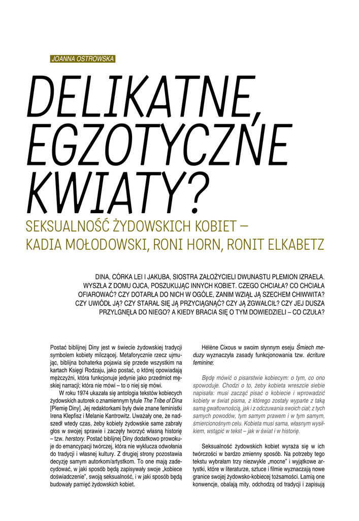 JOANNA OSTROWSKA DELIKATNE, EGZOTYCZNE KWIATY? SEKSUALNOŚĆ ŻYDOWSKICH KOBIET � KADIA MOŁODOWSKI, RONI HORN, RONIT ELKABETZ DINA, CÓRKA LEI I JAKUBA, SIOSTRA ZAŁOŻYCIELI DWUNASTU PLEMION IZRAELA. WYSZŁA Z DOMU OJCA, POSZUKUJĄC INNYCH KOBIET. CZEGO CHCIAŁA? CO CHCIAŁA OFIAROWAĆ? CZY DOTARŁA DO NICH W OGÓLE, ZANIM WZIĄŁ JĄ SZECHEM CHIWWITA? CZY UWIÓDŁ JĄ? CZY STARAŁ SIĘ JĄ PRZYCIĄGNĄĆ? CZY JĄ ZGWAŁCIŁ? CZY JEJ DUSZA PRZYLGNĘŁA DO NIEGO? A KIEDY BRACIA SIĘ O TYM DOWIEDZIELI – CO CZUŁA? Postać biblijnej Diny jest w świecie żydowskiej tradycji symbolem kobiety milczącej. Metaforycznie rzecz ujmując, biblijna bohaterka pojawia się przede wszystkim na kartach Księgi Rodzaju, jako postać, o której opowiadają mężczyźni, która funkcjonuje jedynie jako przedmiot męskiej narracji; która nie mówi – to o niej się mówi. W roku 1974 ukazała się antologia tekstów kobiecych żydowskich autorek o znamiennym tytule The Tribe of Dina [Plemię Diny]. Jej redaktorkami były dwie znane feministki Irena Klepfisz i Melanie Kantrowitz. Uważały one, że nadszedł wtedy czas, żeby kobiety żydowskie same zabrały głos w swojej sprawie i zaczęły tworzyć własną historię – tzw. herstory. Postać biblijnej Diny dodatkowo prowokuje do emancypacji twórczej, która nie wyklucza odwołania do tradycji i własnej kultury. Z drugiej strony pozostawia decyzję samym autorkom/artystkom. To one mają zadecydować, w jaki sposób będą zapisywały swoje „kobiece doświadczenie”, swoją seksualność, i w jaki sposób będą budowały pamięć żydowskich kobiet. Hélène Cixous w swoim słynnym eseju Śmiech meduzy wyznaczyła zasady funkcjonowania tzw. écriture feminine: Będę mówić o pisarstwie kobiecym: o tym, co ono spowoduje. Chodzi o to, żeby kobieta wreszcie siebie napisała: musi zacząć pisać o kobiecie i wprowadzić kobiety w świat pisma, z którego zostały wyparte z taką samą gwałtownością, jak i z odczuwania swoich ciał; z tych samych powodów, tym samym prawem i w tym samym, śmiercionośnym celu. Kobieta musi sama, własnym wysiłkiem, wstąpić w tekst – jak w świat i w historię. Seksualność żydowskich kobiet wyraża się w ich twórczości w bardzo zmienny sposób. Na potrzeby tego tekstu wybrałam trzy niezwykle „mocne” i wyjątkowe artystki, które w literaturze, sztuce i filmie wyznaczają nowe granice swojej żydowsko-kobiecej tożsamości. Łamią one konwencje, obalają mity, odchodzą od tradycji i zapisują 25 TEMAT NUMERU od nowa pozycję kobiety w kulturze, przede wszystkim na poziomie seksualności i cielesności. Nie ma już „delikatnych, egzotycznych kwiatów”, by użyć trafnej formuły, którą Kadia Mołodowski opisywała męskie wyobrażenia o kobiecym pisaniu. Żadnych słów, żadnych aluzji. Tylko to, co mężczyźni czuli i myśleli: jego kobieta, jego żona, ich siostra pohańbiona, ich zbrukany honor. Tylko to, co mężczyźni robili i co chcieli zrobić: branie, siła, przemoc. KADIA MOŁODOWSKI Kadia Mołodowski, urodzona w Berezie Kartuskiej, debiutowała w 1920 roku na łamach kijowskiego almanachu „Ejgns” [Własne]. Pierwszy tomik poetki, o znaczącym tytule Cheszwndike necht [Jesienne noce, dosł. Noce miesiąca cheszwan], został wydany siedem lat później w Warszawie. Otwierający go cykl nosi nazwę Frojen-lider i liczy sobie osiem wierszy. Już sam tytuł jest niezwykle problematyczny ze względu na trudności z jego przekładem. Frojen-lider na angielski tłumaczone jako Women Poems, po polsku oddaje się najczęściej jako Pieśni kobiet albo Kobiece pieśni. Różnorodność tłumaczeń tytułu zmusza do zastanowienia się nad jego brzmieniem. Określenie „pieśni kobiet” automatycznie wskazuje, że dany cykl stanowi coś w rodzaju głosu kobiet, który jest naturalnie mnogi. Mołodowski byłaby w tym momencie rodzajem przekaźnika poglądów pokoleń Żydówek, którym zabroniona była swobodna literacka wypowiedź. Drugie tłumaczenie, czyli Kobiece pieśni, zakłada, że wiersze umieszczone w cyklu stanowią rodzaj twórczości kobiecej traktowanej zgodnie z zasadami charakteryzującymi gatunek. Frojen-lider należą więc do pisarstwa kobiecego przede wszystkim ze względu na praktykę samoidentyfikacji podmiotu piszącego jako płci żeńskiej, a także poprzez specyficzny rodzaj samego tekstu, który stanowi łącznik pomiędzy podmiotem autora a czytelnikiem. W przypadku Kadii Mołodowski jest to o tyle problematyczne, że sama autorka bezpośrednio zaprzeczała idei bycia „poetką kobiecą”: Czy pani zgadza się na powiedzenie o sobie, że jest „poetką kobiecą”? Otóż właśnie się nie zgadzam. Kobiecość i męskość nie są cechami aż tak charakterystycznymi, żeby stanowić mogły zasadę klasyfikacji poetów. Cykl Mołodowski może również odwoływać się do koncepcji ciała jako tekstu, dzięki któremu wspominane wcześniej erotyczne pragnienia szukają ujścia poprzez napięcie twórcze. Tekst jest więc zamkniętą całością, stanowiącą przeniesioną na papier cielesność/seksualność autorki, dzięki której manifestuje ona swoją podmiotowość. W tym momencie przestaje być uzależniona od męskiego fantazmatu, ponieważ sama staje się jednością, podobnie jak jej dzieło. [...] A teraz, gdy sama jestem kobietą I idę ubrana w brązowy jedwab Z odkrytą głową I nagą szyją […] W przypadku Mołodowski zastanawia i fascynuje przede wszystkim jej próba odkrycia i nazwania kobiecej seksualności w sprzężeniu z żydowską tradycją, którą poetka negowała, ale do której odwoływała się w swoich wierszach. Widoczne jest to na poziomie odzyskiwania Pramatek, jako bohaterek i jako podmiotów, które dotychczas stanowiły jedynie tło męskiej historii i tradycji „narodu wybranego”. Negacja miejsca kobiety w żydowskiej kulturze wyzwalała powrót do cielesności, poszukiwanie języka opisu własnej seksualnośc