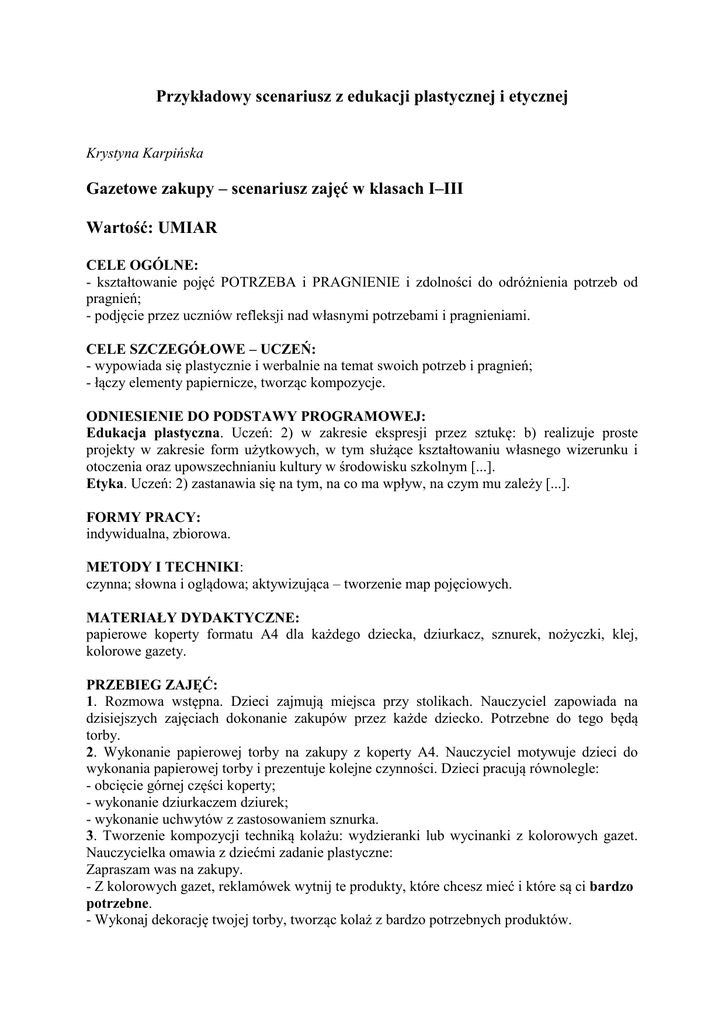 Przykładowy scenariusz z edukacji plastycznej i etycznej Krystyna Karpińska Gazetowe zakupy – scenariusz zajęć w klasach I–III Wartość: UMIAR CELE OGÓLNE: - kształtowanie pojęć POTRZEBA i PRAGNIENIE i zdolności do odróżnienia potrzeb od pragnień; - podjęcie przez uczniów refleksji nad własnymi potrzebami i pragnieniami. CELE SZCZEGÓŁOWE – UCZEŃ: - wypowiada się plastycznie i werbalnie na temat swoich potrzeb i pragnień; - łączy elementy papiernicze, tworząc kompozycje. ODNIESIENIE DO PODSTAWY PROGRAMOWEJ: Edukacja plastyczna. Uczeń: 2) w zakresie ekspresji przez sztukę: b) realizuje proste projekty w zakresie form użytkowych, w tym służące kształtowaniu własnego wizerunku i otoczenia oraz upowszechnianiu kultury w środowisku szkolnym [...]. Etyka. Uczeń: 2) zastanawia się na tym, na co ma wpływ, na czym mu zależy [...]. FORMY PRACY: indywidualna, zbiorowa. METODY I TECHNIKI: czynna; słowna i oglądowa; aktywizująca – tworzenie map pojęciowych. MATERIAŁY DYDAKTYCZNE: papierowe koperty formatu A4 dla każdego dziecka, dziurkacz, sznurek, nożyczki, klej, kolorowe gazety. PRZEBIEG ZAJĘĆ: 1. Rozmowa wstępna. Dzieci zajmują miejsca przy stolikach. Nauczyciel zapowiada na dzisiejszych zajęciach dokonanie zakupów przez każde dziecko. Potrzebne do tego będą torby. 2. Wykonanie papierowej torby na zakupy z koperty A4. Nauczyciel motywuje dzieci do wykonania papierowej torby i prezentuje kolejne czynności. Dzieci pracują równolegle: - obcięcie górnej części koperty; - wykonanie dziurkaczem dziurek; - wykonanie uchwytów z zastosowaniem sznurka. 3. Tworzenie kompozycji techniką kolażu: wydzieranki lub wycinanki z kolorowych gazet. Nauczycielka omawia z dziećmi zadanie plastyczne: Zapraszam was na zakupy. - Z kolorowych gazet, reklamówek wytnij te produkty, które chcesz mieć i które są ci bardzo potrzebne. - Wykonaj dekorację twojej torby, tworząc kolaż z bardzo potrzebnych produktów. - Na drugiej stronie przyklej produkty, które bardzo pragniesz mieć, ale nie są ci one bardzo potrzebne, są niekonieczne. 4. Prezentacja toreb oklejonych ilustracjami pozyskanymi z kolorowych gazet. Omawianie poczynionych zakupów potrzebnych i zakupów upragnionych, ale niekoniecznych. 5. Zorganizowanie wystawy toreb z zakupami. 6. Tworzenie map pojęciowych w kilku zespołach, na dużych arkuszach papieru. 7. Zachęcenie do dyskusji podsumowującej na temat potrzeb i pragnień: - Jakie różnice między potrzebą a pragnieniem udało wam się odkryć? - Jakie znaleźliście podobieństwa? - Czy można mieć nieskończenie wiele potrzeb? - Czy któreś uważacie za ważniejsze od innych? Autoanaliza własnych wyborów, które pojawiły się na torbach. Pytania: Czy gdybyś teraz ozdabiał (ozdabiała) swoją torbę, umieściłabyś coś po innej stronie? Albo po żadnej? Albo wybrał (wybrała) jakąś inną rzecz zamiast jednej z tych, które masz na torbie? Chętni dzielą się refleksjami.
