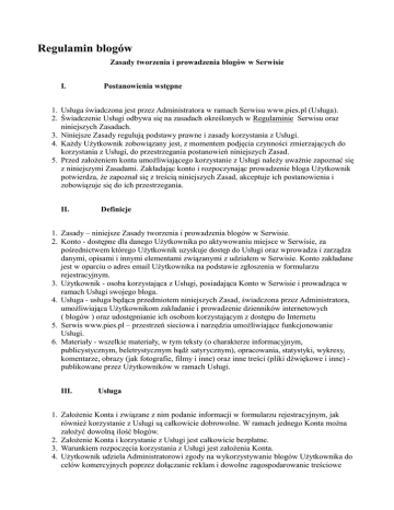 Regulamin blogów Zasady tworzenia i prowadzenia blogów w Serwisie I. Postanowienia wstępne 1. Usługa świadczona jest przez Administratora w ramach Serwisu www.pies.pl (Usługa). 2. Świadczenie Usługi odbywa się na zasadach określonych w Regulaminie Serwisu oraz niniejszych Zasadach. 3. Niniejsze Zasady regulują podstawy prawne i zasady korzystania z Usługi. 4. Każdy Użytkownik zobowiązany jest, z momentem podjęcia czynności zmierzających do korzystania z Usługi, do przestrzegania postanowień niniejszych Zasad. 5. Przed założeniem konta umożliwiającego korzystanie z Usługi należy uważnie zapoznać się z niniejszymi Zasadami. Zakładając konto i rozpoczynając prowadzenie bloga Użytkownik potwierdza, że zapoznał się z treścią niniejszych Zasad, akceptuje ich postanowienia i zobowiązuje się do ich przestrzegania. II. Definicje 1. Zasady – niniejsze Zasady tworzenia i prowadzenia blogów w Serwisie. 2. Konto - dostępne dla danego Użytkownika po aktywowaniu miejsce w Serwisie, za pośrednictwem którego Użytkownik uzyskuje dostęp do Usługi oraz wprowadza i zarządza danymi, opisami i innymi elementami związanymi z udziałem w Serwisie. Konto zakładane jest w oparciu o adres email Użytkownika na podstawie zgłoszenia w formularzu rejestracyjnym. 3. Użytkownik - osoba korzystająca z Usługi, posiadająca Konto w Serwisie i prowadząca w ramach Usługi swojego bloga. 4. Usługa - usługa będąca przedmiotem niniejszych Zasad, świadczona przez Administratora, umożliwiająca Użytkownikom zakładanie i prowadzenie dzienników internetowych ( blogów ) oraz udostępnianie ich osobom korzystającym z dostępu do Internetu 5. Serwis www.pies.pl – przestrzeń sieciowa i narzędzia umożliwiające funkcjonowanie Usługi. 6. Materiały - wszelkie materiały, w tym teksty (o charakterze informacyjnym, publicystycznym, beletrystycznym bądź satyrycznym), opracowania, statystyki, wykresy, komentarze, obrazy (jak fotografie, filmy i inne) oraz inne treści (pliki dźwiękowe i inne) publikowane przez Użytkowników w ramach Usługi. III. Usługa 1. Założenie Konta i związane z nim podanie informacji w formularzu rejestracyjnym, jak również korzystanie z Usługi są całkowicie dobrowolne. W ramach jednego Konta można założyć dowolną ilość blogów. 2. Założenie Konta i korzystanie z Usługi jest całkowicie bezpłatne. 3. Warunkiem rozpoczęcia korzystania z Usługi jest założenia Konta. 4. Użytkownik udziela Administratorowi zgody na wykorzystywanie blogów Użytkownika do celów komercyjnych poprzez dołączanie reklam i dowolne zagospodarowanie treściowe obszarów przeznaczonych do komercyjnego wykorzystania na stronach, na których Użytkownicy prowadzą blogi. 5. Wszelkie działania wymienione w punkcie 4 , będą podejmowane bez ingerencji w treść blogów Użytkowników, w sposób pozwalający na odróżnienie reklam od tych treści. 6. Bezwzględnie zabronione i stanowiące naruszenie Regulaminu oraz niniejszych Zasad, jest umieszczanie w treści bloga grafik, tekstów, nagrań audio i wideo oraz wszelkich innych Materiałów zawierających treści sprzeczne z prawem lub dobrymi obyczajami, naruszających chronione prawem dobra osobiste osób trzecich, w szczególności o charakterze politycznym, propagandowym, rasistowskim, pornograficznym itp. a także propagujących piractwo fonograficzne, komputerowe, upowszechniających techniki łamania danych, wirusy oraz wszelkich innych, podobnych w treści i działaniu materiałów. 7. Użytkownik zobowiązuje się do wykorzystania witryn www, transmisji i dystrybucji materiałów zgodnie z obowiązującymi przepisami prawa, normami społecznymi i obyczajowymi, postanowieniami Regulaminu i niniejszych Zasad oraz zasadami współżycia społecznego w Internecie, a w szczególności do: a. niezakładania bloga o nazwie nawiązującej do wyrazów powszechnie uznanych za obraźliwe, wulgarne lub niezgodne z dobrymi obyczajami, b. działania w sposób nie naruszający praw innych Użytkowników, w tym w szczególności majątkowych i osobistych praw autorskich, c. niepodejmowania działań mających na celu odczytanie haseł dostępowych posiadaczy blogów lub innych poufnych danych, d. niepodejmowania działań i przekazywania danych do Serwisu, które mogłyby utrudnić lub uniemożliwić jego funkcjonowanie, e. nieumieszczania w opisach bloga słów kluczowych niezgodnych z treścią stron Użytkownika, niezakładania blogów reklamowych czyli zawierających treści oraz elementy graficzne o charakterze komercyjnym, f. niezakładania blogów, których funkcją jest wyłącznie reklama, w szczególności w postaci linku przekierowującego do innego bloga albo innej strony www. 8. Administrator nie ponosi odpowiedzialności za: 1. sposób, w jaki Użytkownicy korzystają z blogów, ani za jakiekolwiek wynikłe z tego skutki, jakiekolwiek szkody Użytkownika wynikające z nieprawidłowego udostępniania bądź niemożności udostępniania jego bloga, 2. skutki wynikłe z wejścia w posiadanie przez osoby trzecie hasła dostępowego Użytkownika, niezawinione przez Administratora (np. udostępnienie przez Użytkownika hasła osobie trzeciej, złamanie hasła przez osobę trzecią, itp.), 3. udostępnienie hasła i danych Użytkownika osobom upoważnionym na podstawie właściwych przepisów prawa, informacje pobrane z Internetu, ani za skutki ich wykorzystania. 9. Administrator zastrzega sobie prawo do: a. okresowego wyłączania Serwisu, b. skasowania, w sytuacjach nadzwyczajnych, treści znajdujących się na serwerach Serwisu, c. całkowitego zaprzestania świadczenia bezpłatnych usług, po uprzednim powiadomieniu użytkownika w sposób określony w Regulaminie lub niniejszych Zasadach. 10. Użytkownik może w każdym momencie przerwać korzystanie z Usługi i zamknąć swoje Konto lub swojego bloga. 11. Wiarygodność treści blogów w Serwisie oraz same blogi nie są kontrolowane przez