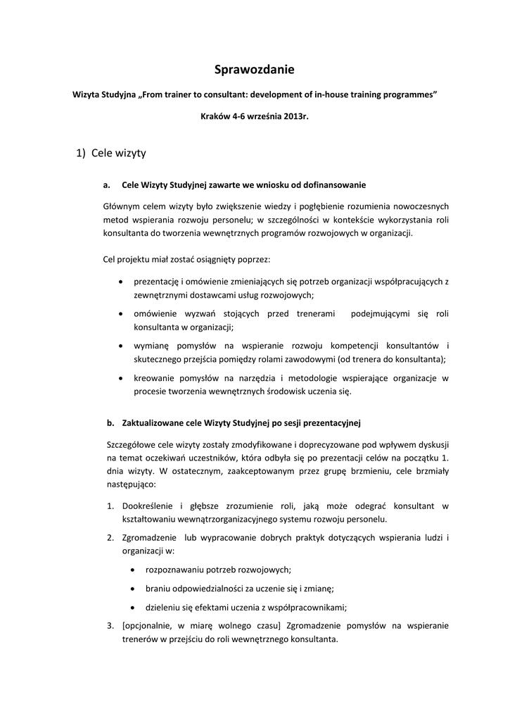 Sprawozdanie Wizyta Studyjna „From trainer to consultant: development of in-house training programmes” Kraków 4-6 września 2013r. 1) Cele wizyty a. Cele Wizyty Studyjnej zawarte we wniosku od dofinansowanie Głównym celem wizyty było zwiększenie wiedzy i pogłębienie rozumienia nowoczesnych metod wspierania rozwoju personelu; w szczególności w kontekście wykorzystania roli konsultanta do tworzenia wewnętrznych programów rozwojowych w organizacji. Cel projektu miał zostać osiągnięty poprzez: prezentację i omówienie zmieniających się potrzeb organizacji współpracujących z zewnętrznymi dostawcami usług rozwojowych; omówienie wyzwań stojących przed trenerami konsultanta w organizacji; wymianę pomysłów na wspieranie rozwoju kompetencji konsultantów i skutecznego przejścia pomiędzy rolami zawodowymi (od trenera do konsultanta); kreowanie pomysłów na narzędzia i metodologie wspierające organizacje w procesie tworzenia wewnętrznych środowisk uczenia się. podejmującymi się roli b. Zaktualizowane cele Wizyty Studyjnej po sesji prezentacyjnej Szczegółowe cele wizyty zostały zmodyfikowane i doprecyzowane pod wpływem dyskusji na temat oczekiwań uczestników, która odbyła się po prezentacji celów na początku 1. dnia wizyty. W ostatecznym, zaakceptowanym przez grupę brzmieniu, cele brzmiały następująco: 1. Dookreślenie i głębsze zrozumienie roli, jaką może odegrać konsultant w kształtowaniu wewnątrzorganizacyjnego systemu rozwoju personelu. 2. Zgromadzenie lub wypracowanie dobrych praktyk dotyczących wspierania ludzi i organizacji w: rozpoznawaniu potrzeb rozwojowych; braniu odpowiedzialności za uczenie się i zmianę; dzieleniu się efektami uczenia z współpracownikami; 3. [opcjonalnie, w miarę wolnego czasu] Zgromadzenie pomysłów na wspieranie trenerów w przejściu do roli wewnętrznego konsultanta. 2) Przebieg wizyty W wizycie wzięło udział ośmiu uczestników: 1) Ingrid DAHMEN - Berufsbildende Schulen des Landkreises Hameln-Pyrmont Handelslehranstalt; 2) Sarah TUDOR - Staffordshire University; 3) Mary Claire HALVORSON - Goldsmiths College University of London; 4) Marzia PERINI - ENAIP FRIULI VENEZIA GIULIA; 5) An MARTENS - Karel De Grote Hogeschool; 6) Simona ARPAIA - ARDSU Toscana - Azienda Regionale per il Diritto allo Studio Universitario della Toscana; 7) Yvonne OP DE BEEK - ROC Mondriaan; 8) Sofija BOGEVA - Association of professional consultants Readiness for Europe 2020. Wszystkie sesje Wizyty odbywały się w siedzibie organizatora – Wszechnicy Uniwersytetu Jagiellońskiego (ul. Sławkowska 10) w Krakowie. W ramach drugiego dnia Wizyty (5 września) przewidziano spotkanie z ekspertami – przedstawicielami kadry zarządzającej i działów HR polskich przedsiębiorstw. Na spotkaniu w charakterze panelistów wystąpili przedstawiciele firm: Bahlsen Polska, BP Polska, Infolet. W trakcie spotkania prezentowane były różne podejścia do wspierania rozwoju pracowników oraz kształtowania kierunków rozwoju profesjonalistów z obszaru Lifelong learning (trenerów, konsultantów, doradców etc.) praktykowane w prezentujących się organizacjach. Podczas wizyty uczestnicy mieli okazję zwiedzić zabytkowe dzielnice Krakowa – Stare Miasto i Kazimierz, a także historyczne budynki Uniwersytetu Jagiellońskiego. Program wizyty obejmował następujące elementy: Dzień 1. Wprowadzenie, informacja o uczestnikach Prezentacja instytucji delegujących uczestników Program wizyty, doprecyzowanie celów Wyzwania stojące przed organizacjami w kontekście rozwoju pracowników – porównanie doświadczeń Dookreślenie roli konsultanta w porównaniu z innymi rolami zawodowymi Dzień 2. Wymiana dobrych praktyk dotyczących działań konsultanta w organizacji o wymiar narzędziowy o wymiar definiowania ról i odpowiedzialności o wymiar kompetencyjny spotkanie z przedstawicielami firm o dyskusja i wymiana dobrych praktyk dotyczących motywowania pracowników do przejmowania odpowiedzialności za własny rozwój zawodowy oraz diagnozy potrzeb rozwojowych wewnątrz organizacji Dzień 3. Dalsza dyskusja i wymiana dobrych praktyk w obszarach związanych z działaniem konsultanta w organizacji Prezentacja dobrych praktyk wypracowanych w ramach projektu „Organizacja 2.0.” i związanych z dzieleniem się wiedzą wewnątrz organizacji Przegląd i porządkowanie wniosków z dyskusji w trakcie dni 1 i 2; - analiza z perspektywy struktury raportu podsumowującego wizytę. Podsumowanie i zakończenie wizyty 3) Rezultaty wizyty W trakcie wizyty udało się : dookreślić wspólne rozumienie roli konsultanta we wspieraniu rozwoju personelu wewnątrz organizacji oraz wymienić doświadczenia na temat specyfiki krajów biorących udział w wizycie zgromadzić zestaw rozwiązań / narzędzi użytecznych do wykorzystania w pracy konsultanta działającego wewnątrz organizacji poszerzyć świadomość problemów i dobrych praktyk związanych z motywowaniem pracowników do współodpowiedzialności za działania rozwojowe i dzielenie się nimi wewnątrz organizacji