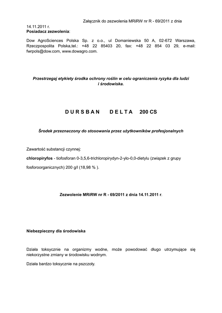 Załącznik do zezwolenia MRiRW nr R - 69/2011 z dnia 14.11.2011 r. Posiadacz zezwolenia: Dow AgroSciences Polska Sp. z o.o., ul Domaniewska 50 A, 02-672 Warszawa, Rzeczpospolita Polska,tel.: +48 22 85403 20, fax: +48 22 854 03 29, e-mail: [email protected], www.dowagro.com. Przestrzegaj etykiety środka ochrony roślin w celu ograniczenia ryzyka dla ludzi i środowiska. DURSBAN DELTA 200 CS Środek przeznaczony do stosowania przez użytkowników profesjonalnych Zawartość substancji czynnej: chloropiryfos - tiofosforan 0-3,5,6-trichloropirydyn-2-ylo-0,0-dietylu (związek z grupy fosforoorganicznych) 200 g/l (18,98 % ). Zezwolenie MRiRW nr R - 69/2011 z dnia 14.11.2011 r. Niebezpieczny dla środowiska Działa toksycznie na organizmy wodne, może powodować długo utrzymujące się niekorzystne zmiany w środowisku wodnym. Działa bardzo toksycznie na pszczoły. Załącznik do zezwolenia MRiRW nr R - 69/2011 z dnia 14.11.2011 r. I. OPIS DZIAŁANIA DURSBAN DELTA 200 CS jest środkiem owadobójczym w postaci zawiesiny kapsuł do rozcieńczania wodą, o działaniu kontaktowym, żołądkowym i gazowym przeznaczony do zwalczania szkodników ssących i gryzących w rzepaku ozimym, rzepaku jarym, buraku cukrowym, kapuście głowiastej, kalafiorze i brokule. Na roślinie środek działa powierzchniowo i wgłębnie. Środek Dursban Delta 200 CS stosuje się używając opryskiwaczy polowych. II ZASTOSOWANIE ŚRODKA 1. Rzepak ozimy. Chowacz brukwiaczek, chowacz czterozębny. Maksymalna dawka dla jednorazowego zastosowania: 1,5 l/ha. Zalecana dawka do jednorazowego stosowania: 1,5 l/ha. Maksymalna liczba zabiegów w sezonie wegetacyjnym: 1. Zalecana ilość wody: 300 - 500 l/ha. Zalecany oprysk: średniokroplisty. Opryskiwać w 7-10 dni po pierwszych nalotach szkodnika. Środek niszczy również jaja i młode larwy obecne już w roślinie. Nie stosować w czasie kwitnienia rzepaku. Słodyszek rzepakowy. Maksymalna dawka dla jednorazowego zastosowania: 1,5 l/ha. Zalecana dawka do jednorazowego stosowania: 1,5 l/ha. Maksymalna liczba zabiegów w sezonie wegetacyjnym: 1. Zalecana ilość wody: 300 - 500 l/ha. Zalecany oprysk: średniokroplisty. Opryskiwać w fazie zwartego kwiatostanu, po wystąpieniu chrząszczy na plantacji. Nie stosować w czasie kwitnienia rzepaku 2. Rzepak jary. Słodyszek rzepakowy, chowacz czterozębny. Maksymalna dawka dla jednorazowego zastosowania: 1,5 l/ha. Zalecana dawka do jednorazowego stosowania: 1,5 l/ha. Maksymalna liczba zabiegów w sezonie wegetacyjnym: 1. Załącznik do zezwolenia MRiRW nr R - 69/2011 z dnia 14.11.2011 r. Zalecana ilość wody 300 - 500 l/ha. Zalecany oprysk: średniokroplisty. Opryskiwać w fazie zwartego kwiatostanu, po wystąpieniu chrząszczy na plantacji. Nie stosować w czasie kwitnienia rzepaku. 3. Burak cukrowy. Śmietka ćwiklanka. Maksymalna dawka dla jednorazowego zastosowania: 2,5 l/ha. Zalecana dawka do jednorazowego stosowania: 2,5 l/ha. Zalecana ilość wody: 300 - 500 l/ha. Zalecany oprysk: średniokroplisty. Maksymalna liczba zabiegów w sezonie wegetacyjnym: 1. Opryskiwać zgodnie z sygnalizacją to jest w okresie wylęgania się larw pierwszego pokolenia. Zabieg zwalczania szkodnika w buraku cukrowym wykonywać na rośliny, które wykształciły co najmniej 2 liście właściwe, każdy o wielkości minimum 12 mm. 4. Kapusta głowiasta. Gąsienice: bielinek kapustnik, bielinek rzepnik, tantniś krzyżowiaczek, piętnówka kapustnica. Maksymalna dawka dla jednorazowego zastosowania: 2,0 l/ha. Zalecana dawka do jednorazowego stosowania: 2,0 l/ha. Zalecana ilość wody: 200 - 600 l/ha. Zalecany oprysk: średniokroplisty. Maksymalna liczba zabiegów w sezonie wegetacyjnym: 1. Opryskiwać w okresie masowego wylęgania się gąsienic. Mszyca kapuściana. Durban Delta 200 SL - 2,5 l/ha + Superam 10 AL – 0,3 l/ha Maksymalna dawka dla jednorazowego zastosowania: 2,5 l/ha. Zalecana dawka do jednorazowego stosowania: 2,5 l/ha. Zalecana ilość wody: 200 - 600 l/ha. Zalecany oprysk: średniokroplisty. Maksymalna liczba zabiegów w sezonie wegetacyjnym: 1. Zabieg wykonać bezpośrednio po pojawieniu się pierwszych kolonii mszyc. Załącznik do zezwolenia MRiRW nr R - 69/2011 z dnia 14.11.2011 r. Wciornastek tytoniowy. Maksymalna dawka dla jednorazowego zastosowania: 2,0 l/ha. Zalecana dawka do jednorazowego stosowania: 2,0 l/ha. Zalecana ilość wody: 200 - 600 l/ha. Zalecany oprysk: średniokroplisty. Maksymalna liczba zabiegów w sezonie wegetacyjnym: 1. Zabieg wykonać po pojawieniu się pierwszych szkodników. 5. Rozsada kapusty białej produkowanej w doniczkach ziemnych. Śmietka kapuściana. Zalecane stężenie: 0,2 % (200 ml środka w 100 l wody). Zastosować 50 ml cieczy użytkowej na roślinę. Dawka produktu w przeliczeniu na 1 roślinę wynosi 0,1 ml. Zastosować 1-2 dni przed sadzeniem rozsady do gruntu. Maksymalna liczba zabiegów w sezonie wegetacyjnym 1 6. Kalafior. Gąsienice: bielinek kapustnik, bielinek rzepnik, piętnówka kapustnica. Maksymalna dawka dla jednorazowego zastosowania: 2,0 l/ha. Zalecana dawka do jednorazowego stosowania: 2,0 l/ha. Zalecana ilość wody: 200 - 600 l/ha. Zalecany oprysk: średniokroplisty. Maksymalna liczba zabiegów w sezonie wegetacyjnym: 1. 7. Brokuł. Gąsienice: bielinek kapustnik, bielinek rzepnik, piętnówka kapustnica, tantniś krzyżowiaczek. Maksymalna dawka dla jednorazowego zastosowania: 2,0 l/ha. Zalecana dawka do jednorazowego stosowania: 2,0 l/ha. Zalecana ilość wody: 200-600 l/ha. Zalecany oprysk: średniokroplisty. Maksymalna liczba zabiegów w sezonie wegetacyjnym: 1. UWAGI: 1. Środek działa najskuteczniej w temperaturze od 15-25ºC. 2. W celu ochrony pszczół i innych owadów zapylających nie stosować: Załącznik do zezwolenia MRiRW nr R - 69/2011 z dnia 14.11.2011 r. − na rośliny uprawne w czasie kwitnienia, − − kiedy na uprawie chronionej występują kwitnące chwasty, w miejscach gdzie pszczoły mają pożytek, a także na roślinach, których kwitnienie m