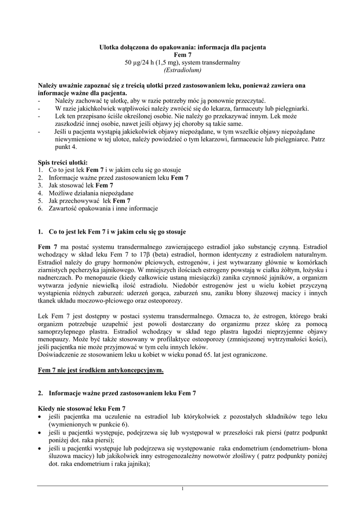 Ulotka dołączona do opakowania: informacja dla pacjenta Fem 7 50 µg/24 h (1,5 mg), system transdermalny (Estradiolum) Należy uważnie zapoznać się z treścią ulotki przed zastosowaniem leku, ponieważ zawiera ona informacje ważne dla pacjenta. Należy zachować tę ulotkę, aby w razie potrzeby móc ją ponownie przeczytać. W razie jakichkolwiek wątpliwości należy zwrócić się do lekarza, farmaceuty lub pielęgniarki. Lek ten przepisano ściśle określonej osobie. Nie należy go przekazywać innym. Lek może zaszkodzić innej osobie, nawet jeśli objawy jej choroby są takie same. Jeśli u pacjenta wystąpią jakiekolwiek objawy niepożądane, w tym wszelkie objawy niepożądane niewymienione w tej ulotce, należy powiedzieć o tym lekarzowi, farmaceucie lub pielęgniarce. Patrz punkt 4. Spis treści ulotki: 1. Co to jest lek Fem 7 i w jakim celu się go stosuje 2. Informacje ważne przed zastosowaniem leku Fem 7 3. Jak stosować lek Fem 7 4. Możliwe działania niepożądane 5. Jak przechowywać lek Fem 7 6. Zawartość opakowania i inne informacje 1. Co to jest lek Fem 7 i w jakim celu się go stosuje Fem 7 ma postać systemu transdermalnego zawierającego estradiol jako substancję czynną. Estradiol wchodzący w skład leku Fem 7 to 17β (beta) estradiol, hormon identyczny z estradiolem naturalnym. Estradiol należy do grupy hormonów płciowych, estrogenów, i jest wytwarzany głównie w komórkach ziarnistych pęcherzyka jajnikowego. W mniejszych ilościach estrogeny powstają w ciałku żółtym, łożysku i nadnerczach. Po menopauzie (kiedy całkowicie ustaną miesiączki) zanika czynność jajników, a organizm wytwarza jedynie niewielką ilość estradiolu. Niedobór estrogenów jest u wielu kobiet przyczyną wystąpienia różnych zaburzeń: uderzeń gorąca, zaburzeń snu, zaniku błony śluzowej macicy i innych tkanek układu moczowo-płciowego oraz osteoporozy. Lek Fem 7 jest dostępny w postaci systemu transdermalnego. Oznacza to, że estrogen, którego braki organizm potrzebuje uzupełnić jest powoli dostarczany do organizmu przez skórę za pomocą samoprzylepnego plastra. Estradiol wchodzący w skład tego plastra łagodzi nieprzyjemne objawy menopauzy. Może być także stosowany w profilaktyce osteoporozy (zmniejszonej wytrzymałości kości), jeśli pacjentka nie może przyjmować w tym celu innych leków. Doświadczenie ze stosowaniem leku u kobiet w wieku ponad 65. lat jest ograniczone. Fem 7 nie jest środkiem antykoncepcyjnym. 2. Informacje ważne przed zastosowaniem leku Fem 7 Kiedy nie stosować leku Fem 7 • jeśli pacjentka ma uczulenie na estradiol lub którykolwiek z pozostałych składników tego leku (wymienionych w punkcie 6). • jeśli u pacjentki występuje, podejrzewa się lub występował w przeszłości rak piersi (patrz podpunkt poniżej dot. raka piersi); • jeśli u pacjentki występuje lub podejrzewa się występowanie raka endometrium (endometrium- błona śluzowa macicy) lub jakikolwiek inny estrogenozależny nowotwór złośliwy ( patrz podpunkty poniżej dot. raka endometrium i raka jajnika); 1 • • • • • • jeśli u pacjentki występuje nieleczona hiperplazja endometrium (zwiększenie ilości komórek błony śluzowej macicy wyściełającej jej jamę); jeśli u pacjentki występuje krwawienie z dróg rodnych o nieustalonej przyczynie; jeśli u pacjentki występuje lub występowała w przeszłości zakrzepica żylna (zakrzepica żył głębokich) lub zatory przemieszczające się do płuc lub innych części ciała (patrz podpunkt poniżej dot. zakrzepów) jeśli u pacjentki występuje lub wystąpił niedawno atak serca, udar lub dusznica bolesna (patrz poniżej podpunkt dot. choroby serca i udaru); jeśli u pacjentki występuje ostra choroba wątroby lub choroba wątroby wystąpiła w przeszłości, do czasu normalizacji wyników badań czynności wątroby; jeśli u pacjentki występuje porfiria. Stosowanie leku Fem 7 u dzieci jest przeciwwskazane. Ostrzeżenia i środki ostrożności Przed rozpoczęciem stosowania Fem 7 należy omówić to z lekarzem, farmaceutą lub pielęgniarką. Badanie lekarskie / badania kontrolne Przed rozpoczęciem lub ponownym wprowadzeniem hormonalnej terapii zastępczej lekarz przeprowadzi szczegółowy wywiad lekarski, w tym rodzinny. Badanie przedmiotowe (łącznie z badaniem narządów miednicy oraz piersi) powinno uwzględniać dane z wywiadu oraz przeciwwskazania i ostrzeżenia dotyczące stosowania HTZ. W czasie leczenia lekarz przeprowadzi okresowe badania kontrolne, których częstotliwość i rodzaj powinny być dostosowane do potrzeb danej pacjentki. HTZ powinna być stosowana tak długo, jak długo korzyść z jej stosowania przeważa nad ryzykiem. Jeśli pacjentka zauważy u siebie zmiany w piersiach odpowiadające guzkom piersi (patrz punkt „Rak piersi” poniżej), powinna zgłosić to lekarzowi, który może ją skierować na mammografię. Stany wymagające szczególnej kontroli Jeżeli którekolwiek z poniższych sytuacji lub stanów występują, występowały wcześniej i(lub) uległy znacznemu nasileniu w czasie ciąży lub poprzedniej hormonalnej terapii zastępczej, stan zdrowia pacjentki powinien być pod ścisłą obserwacją lekarza. Należy wziąć pod uwagę, że wymienione zaburzenia mogą wystąpić ponownie lub nasilić się w czasie stosowania leku Fem7. Dotyczy to zwłaszcza takich chorób, jak: - - łagodne nowotwory macicy (mięśniaki gładkie/ włókniakomięśniaki macicy) lub endometrioza (występowanie fragmentów błony śluzowej trzonu macicy w różnych miejscach w obrębie miednicy); przebyte zaburzenia zakrzepowo-zatorowe lub czynniki ich ryzyka (patrz niżej); czynniki ryzyka nowotworu estrogenozależnego, np. rak piersi u bliskich krewnych; nadciśnienie tętnicze; choroby wątroby (np. gruczolak wątroby); cukrzyca ze zmianami naczyniowymi lub bez zmian naczyniowych; kamica żółciowa; migrena lub (silne) bóle głowy; toczeń rumienio
