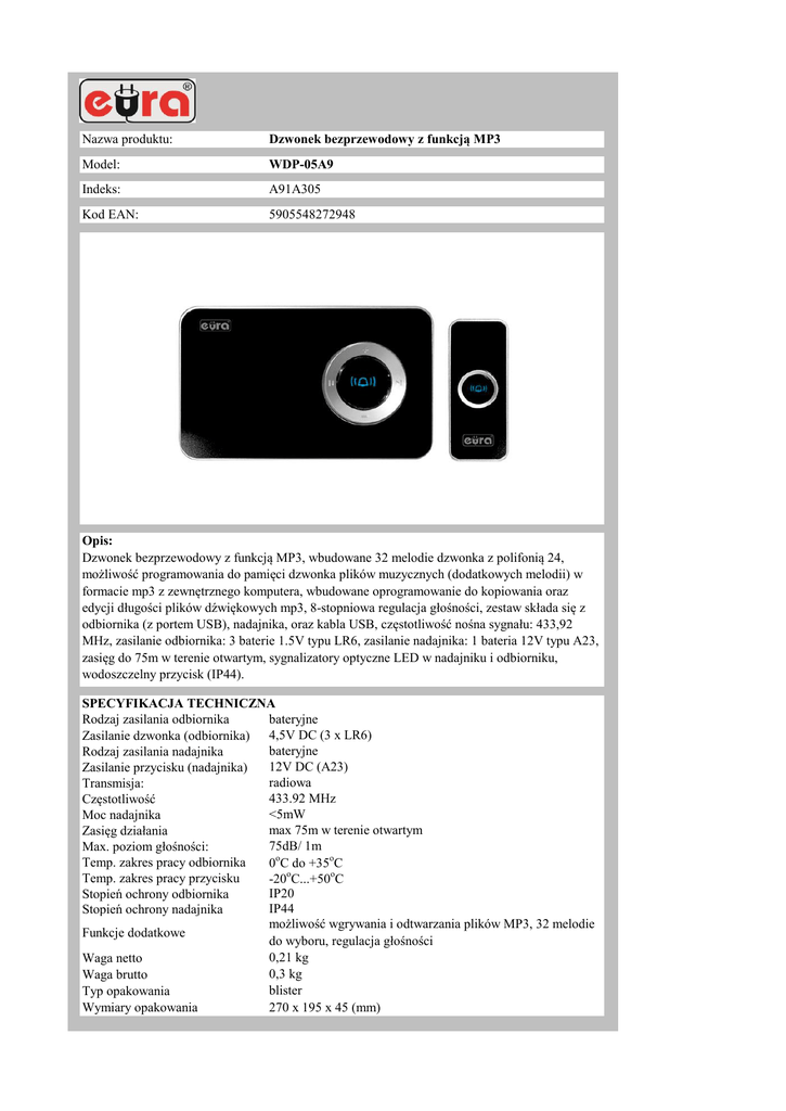 Nazwa produktu: Dzwonek bezprzewodowy z funkcją MP3 Model: WDP-05A9 Indeks: A91A305 Kod EAN: 5905548272948 Opis: Dzwonek bezprzewodowy z funkcją MP3, wbudowane 32 melodie dzwonka z polifonią 24, możliwość programowania do pamięci dzwonka plików muzycznych (dodatkowych melodii) w formacie mp3 z zewnętrznego komputera, wbudowane oprogramowanie do kopiowania oraz edycji długości plików dźwiękowych mp3, 8-stopniowa regulacja głośności, zestaw składa się z odbiornika (z portem USB), nadajnika, oraz kabla USB, częstotliwość nośna sygnału: 433,92 MHz, zasilanie odbiornika: 3 baterie 1.5V typu LR6, zasilanie nadajnika: 1 bateria 12V typu A23, zasięg do 75m w terenie otwartym, sygnalizatory optyczne LED w nadajniku i odbiorniku, wodoszczelny przycisk (IP44). SPECYFIKACJA TECHNICZNA Rodzaj zasilania odbiornika bateryjne Zasilanie dzwonka (odbiornika) 4,5V DC (3 x LR6) bateryjne Rodzaj zasilania nadajnika 12V DC (A23) Zasilanie przycisku (nadajnika) radiowa Transmisja: 433.92 MHz Częstotliwość <5mW Moc nadajnika max 75m w terenie otwartym Zasięg działania 75dB/ 1m Max. poziom głośności: Temp. zakres pracy odbiornika 0oC do +35oC Temp. zakres pracy przycisku -20oC...+50oC IP20 Stopień ochrony odbiornika IP44 Stopień ochrony nadajnika możliwość wgrywania i odtwarzania plików MP3, 32 melodie Funkcje dodatkowe do wyboru, regulacja głośności 0,21 kg Waga netto 0,3 kg Waga brutto blister Typ opakowania 270 x 195 x 45 (mm) Wymiary opakowania