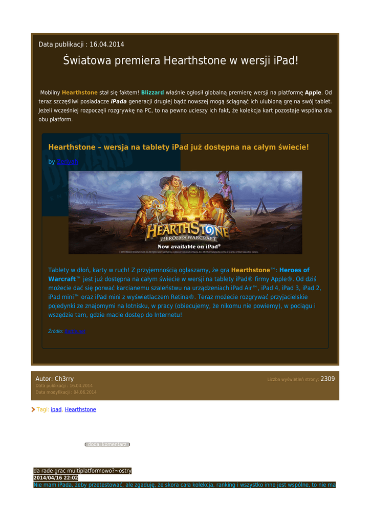 Data publikacji : 16.04.2014 Światowa premiera Hearthstone w wersji iPad! Mobilny Hearthstone stał się faktem! Blizzard właśnie ogłosił globalną premierę wersji na platformę Apple. Od teraz szczęśliwi posiadacze iPada generacji drugiej bądź nowszej mogą ściągnąć ich ulubioną grę na swój tablet. Jeżeli wcześniej rozpoczęli rozgrywkę na PC, to na pewno ucieszy ich fakt, że kolekcja kart pozostaje wspólna dla obu platform. Hearthstone – wersja na tablety iPad już dostępna na całym świecie! by Zeriyah Tablety w dłoń, karty w ruch! Z przyjemnością ogłaszamy, że gra Hearthstone™: Heroes of Warcraft™ jest już dostępna na całym świecie w wersji na tablety iPad® firmy Apple®. Od dziś możecie dać się porwać karcianemu szaleństwu na urządzeniach iPad Air™, iPad 4, iPad 3, iPad 2, iPad mini™ oraz iPad mini z wyświetlaczem Retina®. Teraz możecie rozgrywać przyjacielskie pojedynki ze znajomymi na lotnisku, w pracy (obiecujemy, że nikomu nie powiemy), w pociągu i wszędzie tam, gdzie macie dostęp do Internetu! Źródło: Battle.net Autor: Ch3rry Liczba wyświetleń strony: 2309 Data publikacji : 16.04.2014 Data modyfikacji : 04.06.2014 Tagi: ipad, Hearthstone Komentarz (7) dodaj komentarz da rade grac multiplatformowo?~ostry 2014/04/16 22:02 Nie mam iPada, żeby przetestować, ale zgaduję, że skora cała kolekcja, ranking i wszystko inne jest wspólne, to nie ma przeszkód do gry między różnymi platformami.~Ch3rry 2014/04/17 10:10 Zaraz sprawdzę, ale chyba jest osobno iPad, a osobno PC/Mac A jednak jest multiplatformowo :) Da się grać z PC z przeciwnikiem na iPadzie i na odwrót.~SzRaPnEL 2014/04/17 22:11 wiadomo cos o wersji na androida ?~bialymisiek 2014/04/18 17:01 Z chęcią poczekam na wersję na WP8 :) *nie była o tym mowa oficjalnie na blizzconie, ale w pytaniach po za podobno rozważają taką opcję~Krecik 2014/04/18 17:25 @Krecik Jako developer gier (również mobilnych) mogę Cię zapewnić, że Heartstone nie powstanie na WindowsPhone. Port na to urządzenie jest baardzo problematyczny, a precent rynku pokryty tą platformą jest tak mały że na pewno im się to nie opłaci :P Na Androida wrzucą najwcześniej za rok. (jeżeli w ogóle)~SzRaPnEL 2014/04/18 18:13 Do końca roku ma być na iosa i androida na tabletach i telefonach, a przynajmniej blizz ma takie marzenie.~ Teamspeakuser 2014/04/18 21:04 dodaj komentarz Pozostałe nowości Nowy bohater w Hearthstone - Lady Liadrin Blizzard postanowił zaskoczyć wszystkich udostępniając nowego bohatera do Hearthstone, którego zdobyć można grając w World of Warcraft. Nie macie się jednak co martwić, wystarczy zdobyć jedynie 20 poziom w popularnym MMO, aby Lady Liadrin zajęła miejsce Uthera jako paladyn w grze.Data publikacji: 15.03.20160 Zapowiedź nowości w Hearthstone Jeśli to co dzieje się w Hearthstone zaczynało was powoli nudzić, to mamy dobre informacje. Już wkrótce do gry zostanie wprowadzonych szeerg zmian, które odświeżą rozgrywkę w karczmie.Data publikacji: 02.02.20160 Nadchodzi Zimowa Uczta W zapowiedzi najnowszej aktualizacji pojawiła się wzmianka na temat Zimowej Uczty, która wkrótce ma rozpocząć się w Hearthstone. Dziś Blizzard ujawnia pierwsze niespodzianki związane z tym wydarzeniem.Data publikacji: 09.12.20150 Liga Odkrywców dostępna w aktualizacji 4.0 Najnowsza aktualizacja do Hearthstone wprowadza przygodę Liga Odkrywców, kilka nowych rewersów do kart oraz naprawia niewielką ilość błędów w grze. Więcej informacji znajdziecie w rozwinięciu newsa.Data publikacji: 12.11.20150 BlizzCon 2015 - karty z Ligi Odkrywców Na łamach serwisu HearthPwn pojawiły się wszystkie karty, które będą dostępne w przygodzie Liga Odkrywców - wygląda na to, że będą mogły sporo namieszać w karczmie Hearthstone.Data publikacji: 07.11.20150 Wszystkie nowości