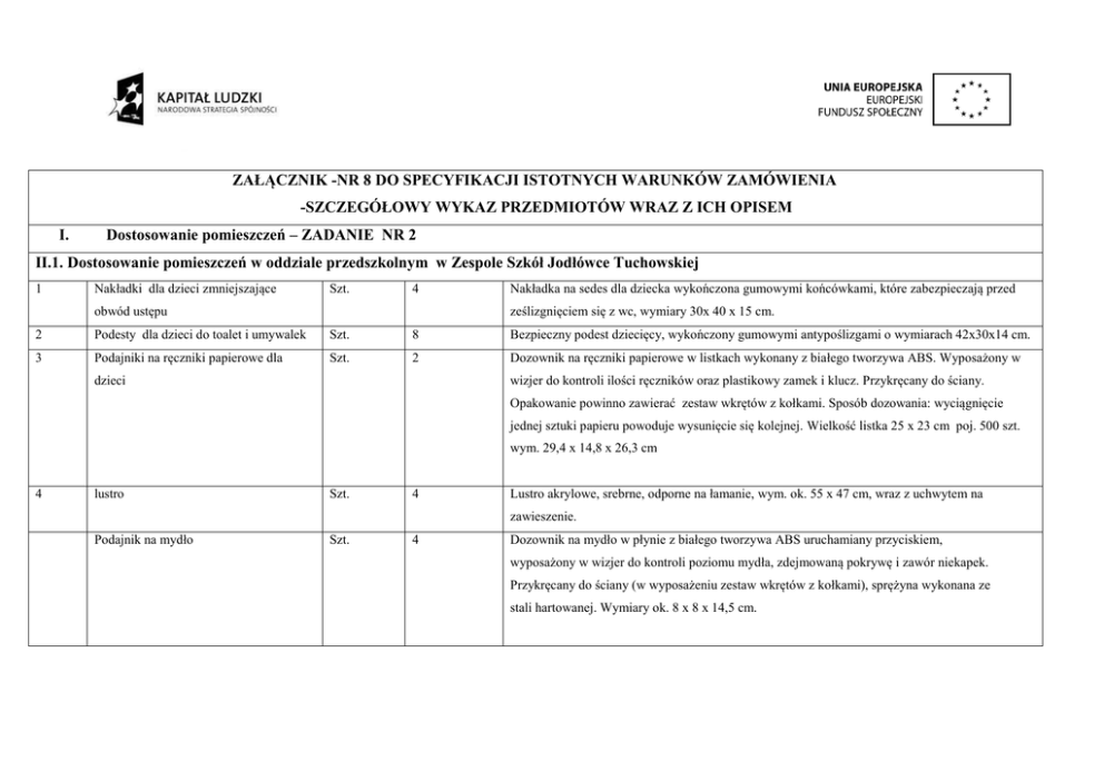 ZAŁĄCZNIK -NR 8 DO SPECYFIKACJI ISTOTNYCH WARUNKÓW ZAMÓWIENIA -SZCZEGÓŁOWY WYKAZ PRZEDMIOTÓW WRAZ Z ICH OPISEM I. Dostosowanie pomieszczeń – ZADANIE NR 2 II.1. Dostosowanie pomieszczeń w oddziale przedszkolnym w Zespole Szkół Jodłówce Tuchowskiej 1 Nakładki dla dzieci zmniejszające Szt. 4 obwód ustępu Nakładka na sedes dla dziecka wykończona gumowymi końcówkami, które zabezpieczają przed ześlizgnięciem się z wc, wymiary 30x 40 x 15 cm. 2 Podesty dla dzieci do toalet i umywalek Szt. 8 Bezpieczny podest dziecięcy, wykończony gumowymi antypoślizgami o wymiarach 42x30x14 cm. 3 Podajniki na ręczniki papierowe dla Szt. 2 Dozownik na ręczniki papierowe w listkach wykonany z białego tworzywa ABS. Wyposażony w wizjer do kontroli ilości ręczników oraz plastikowy zamek i klucz. Przykręcany do ściany. dzieci Opakowanie powinno zawierać zestaw wkrętów z kołkami. Sposób dozowania: wyciągnięcie jednej sztuki papieru powoduje wysunięcie się kolejnej. Wielkość listka 25 x 23 cm poj. 500 szt. wym. 29,4 x 14,8 x 26,3 cm 4 lustro Szt. 4 Lustro akrylowe, srebrne, odporne na łamanie, wym. ok. 55 x 47 cm, wraz z uchwytem na zawieszenie. Podajnik na mydło Szt. 4 Dozownik na mydło w płynie z białego tworzywa ABS uruchamiany przyciskiem, wyposażony w wizjer do kontroli poziomu mydła, zdejmowaną pokrywę i zawór niekapek. Przykręcany do ściany (w wyposażeniu zestaw wkrętów z kołkami), sprężyna wykonana ze stali hartowanej. Wymiary ok. 8 x 8 x 14,5 cm.