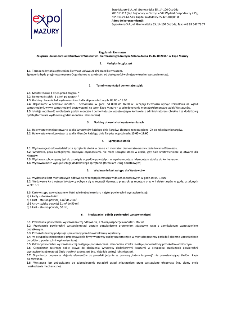Expo Mazury S.A., ul. Grunwaldzka 55, 14-100 Ostróda KRS 513712 (Sąd Rejonowy w Olsztynie VIII Wydział Gospodarczy KRS), NIP 839-27-67-573, kapitał zakładowy 85.428.000,00 zł Adres do korespondencji: Expo Arena S.A., ul. Grunwaldzka 55, 14-100 Ostróda; fax: +48 89 647 78 77 Regulamin kiermaszu Załącznik do umowy uczestnictwa w Wiosennym Kiermaszu Ogrodniczym Zielona Arena 15-16.10.2016r. w Expo Mazury 1. Nadsyłanie zgłoszeń 1.1. Termin nadsyłania zgłoszeń na kiermasz upływa 21 dni przed kiermaszem. Zgłoszenia będą przyjmowane przez Organizatora w zależności od dostępności wolnej powierzchni wystawienniczej. 2. Terminy montażu i demontażu stoisk 2.1. Montaż stoisk: 1 dzień przed targami * 2.2. Demontaż stoisk: 1 dzień po targach * 2.3. Godziny otwarcia hal wystawienniczych dla ekip montażowych: 08:00 – 18:00 2.4. Organizator w terminie montażu i demontażu, w godz. od 8.00 do 16.00 w recepcji kiermaszu wydaje zezwolenia na wjazd samochodami, w tym samochodami dostawczymi, na teren Expo Mazury – w celu dokonania montażu/demontażu stoisk Wystawców. 2.5. Istnieje możliwość wydłużenia godzin montażu i demontażu po wcześniejszym kontakcie z administratorem obiektu i za dodatkową opłatą (formularz wydłużenia godzin montażu i demontażu) 3. Godziny otwarcia hal wystawienniczych. 3.1. Hale wystawiennicze otwarte są dla Wystawców każdego dnia Targów: 1h przed rozpoczęciem i 2h po zakończeniu targów. 3.2. Hale wystawiennicze otwarte są dla Klientów każdego dnia Targów w godzinach: 10:00 – 17:00 4. Sprzątanie stoisk 4.1. Wystawca jest odpowiedzialny za sprzątanie stoisk w czasie ich montażu i demontażu oraz w czasie trwania Kiermaszu. 4.2. Wystawca, poza niezbędnymi, drobnymi czynnościami, nie może sprzątać stoisk w czasie, gdy hale wystawiennicze są otwarte dla Klientów. 4.3. Wystawca zobowiązany jest do usunięcia odpadów powstałych w wyniku montażu i demontażu stoiska do kontenerów. 4.4. Wystawca może wykupić usługę dodatkowego sprzątania (formularz usług dodatkowych) 5. Wydawanie kart wstępu dla Wystawców 5.1. Wydawanie kart montażowych odbywa się w recepcji kiermaszu w dniach montażowych w godz. 08:00-18:00 5.2. Wydawanie kart wstępu Wystawcy odbywa się w recepcji kiermaszu przez okres montażu oraz w I dzień targów w godz. ustalonych w pkt. 3.1 5.3. Karty wstępu są wydawane w ilości zależnej od rozmiaru najętej powierzchni wystawienniczej: a) 2 karty – stoisko do 6m2 b) 4 kart – stoisko powyżej 6 m2 do 20m2, c) 6 kart – stoisko powyżej 21 m2 do 50 m2, d) 8 kart – stoisko powyżej 50 m2, 6. Przekazanie i odbiór powierzchni wystawienniczej 6.1. Przekazanie powierzchni wystawienniczej odbywa się z chwilą rozpoczęcia montażu stoiska 6.2. Przekazanie powierzchni wystawienniczej zostaje potwierdzone protokołem zdawczym wraz z zamówionym wyposażeniem dodatkowym. 6.3. Protokół zdawczy podpisuje uprawniony przedstawiciel firmy Wystawcy. 6.4. W przypadku nieobecności przedstawiciela firmy wystawcy osoby uczestniczące w montażu powinny posiadać pisemne upoważnienie do odbioru powierzchni wystawienniczej. 6.5. Odbiór powierzchni wystawienniczej następuje po zakończeniu demontażu stoiska i zostaje potwierdzony protokołem odbiorczym. 6.6. Organizator zastrzega sobie prawo do obciążenia Wystawcy dodatkowymi kosztami w przypadku przekazania powierzchni wystawienniczej noszącej ślady trwałych zabrudzeń (np. kleju lub taśmy) lub zniszczeń. 6.7. Organizator dopuszcza klejenie elementów do posadzki jedynie za pomocą „taśmy targowej” nie pozostawiającej śladów kleju po zerwaniu. 6.8. Wystawca jest zobowiązany do zabezpieczenie posadzki przed zniszczeniem przez wystawiane eksponaty (np. plamy oleje i uszkodzenia mechaniczne). Expo Mazury S.A., ul. Grunwaldzka 55, 14-100 Ostróda KRS 513712 (Sąd Rejonowy w Olsztynie VIII Wydział Gospodarczy KRS), NIP 839-27-67-573, kapitał zakładowy 85.428.000,00 zł Adres do korespondencji: Expo Arena S.A., ul. Grunwaldzka 55, 14-100 Ostróda; fax: +48 89 647 78 77 7. Parking na terenie Expo Mazury 7.1 Wystawcy uprawnieni są do wjazdu na teren Expo Mazury i bezpłatnego pozostawienia pojazdów osobowych, w ilości zależącej od najmowanej powierzchni wystawienniczej, przez czas trwania kiermaszu w godzinach otwarcia hal wystawienniczych dla Wystawców. a) stoisko do 50 m2 – 1 samochód, b) stoisko powyżej 50 m2 do 100 m2 - 2 samochody, c) stoisko powyżej 100 m2 – 3 samochody 7.2. Samochody wystawców powinny być zaparkowane w miejscu wskazanym przez Organizatora jako parking dla Wystawców. 7.3. Samochody ciężarowe powinny zostać usunięte z parkingu na 12h przed rozpoczęciem kiermaszu. 7.4. Zakazane jest parkowanie pojazdów na drogach pożarowych i w strefach wyznaczonych dla ruchu pieszego i pozostawienie pojazdów na terenie Expo Mazury po godzinach wyznaczonych w postanowieniach powyższych. Naruszenie zakazów wymienionych w zdaniu poprzednim może skutkować odholowaniem samochodu na koszt Wystawcy. *Nie dotyczy Międzynarodowe Targi Meblowe
