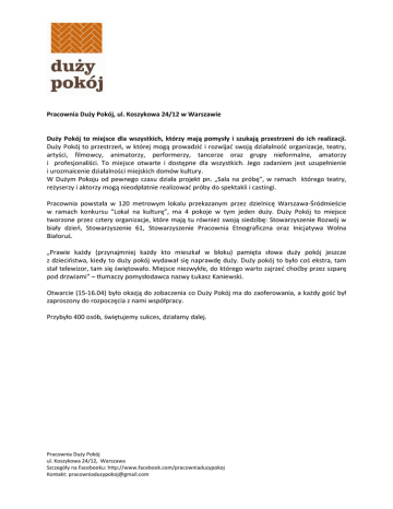 Pracownia Duży Pokój, ul. Koszykowa 24/12 w Warszawie Duży Pokój to miejsce dla wszystkich, którzy mają pomysły i szukają przestrzeni do ich realizacji. Duży Pokój to przestrzeń, w której mogą prowadzić i rozwijać swoją działalność organizacje, teatry, artyści, filmowcy, animatorzy, performerzy, tancerze oraz grupy nieformalne, amatorzy i profesjonaliści. To miejsce otwarte i dostępne dla wszystkich. Jego zadaniem jest uzupełnienie i urozmaicenie działalności miejskich domów kultury. W Dużym Pokoju od pewnego czasu działa projekt pn. „Sala na próbę”, w ramach którego teatry, reżyserzy i aktorzy mogą nieodpłatnie realizować próby do spektakli i castingi. Pracownia powstała w 120 metrowym lokalu przekazanym przez dzielnicę Warszawa-Śródmieście w ramach konkursu "Lokal na kulturę”, ma 4 pokoje w tym jeden duży. Duży Pokój to miejsce tworzone przez cztery organizacje, które mają tu również swoją siedzibę: Stowarzyszenie Rozwój w biały dzień, Stowarzyszenie 61, Stowarzyszenie Pracownia Etnograficzna oraz Inicjatywa Wolna Białoruś. „Prawie każdy (przynajmniej każdy kto mieszkał w bloku) pamięta słowa duży pokój jeszcze z dzieciństwa, kiedy to duży pokój wydawał się naprawdę duży. Duży pokój to było coś ekstra, tam stał telewizor, tam się świętowało. Miejsce niezwykłe, do którego warto zajrzeć choćby przez szparę pod drzwiami” – tłumaczy pomysłodawca nazwy Łukasz Kaniewski. Otwarcie (15-16.04) było okazją do zobaczenia co Duży Pokój ma do zaoferowania, a każdy gość był zaproszony do rozpoczęcia z nami współpracy. Przybyło 400 osób, świętujemy sukces, działamy dalej. Pracownia Duży Pokój ul. Koszykowa 24/12, Warszawa Szczegóły na Facebooku: http://www.facebook.com/pracowniaduzypokoj Kontakt: [email protected]