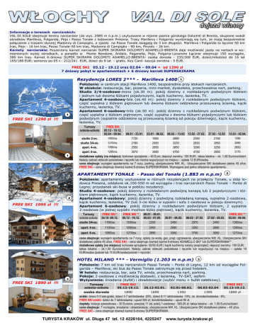 Informacje o terenach narciarskich: VAL DI SOLE obejmuje tereny narciarskie (do wys. 2585 m n.p.m.) usytuowane w rejonie pasma górskiego Dolomiti di Brenta, skupione wokół ośrodków Marilleva, Folgarida, Pejo i Passo Tonale z lodowcem Presena. Trasy Marillevy i Folgaridy wyróżniają się tym, że mają bezpośrednie połączenie z trasami słynnej Madonny di Campiglio, a zjazdy na Passo Tonale osiągają do 3 km długości. Marilleva i Folgarida to łącznie 50 km tras, Pejo - 16 km tras, Passo Tonale-50 km tras, Madonna di Campiglio - 90 km, Pinzolo – 26 km. Karnety narciarskie: Poszerzony karnet narciarski SUPER SKIRAMA DOLOMITI ADAMELLO-BRENTA daje możliwość jazdy na nartach w wymienionych wyżej ośrodkach, a ponadto w Monte Bondone, Andalo, Paganella, Pejo, Folgaria-Lavarone Łącznie obejmuje 150 wyciągów, 380 km tras. Karnet 6-dniowy SUPER SKIRAMA DOLOMITI ADAMELLO-BRENTA: osoba dorosła - 235/268 EUR, dzieci/młodzież do 16 lat 165/188 EUR; seniorzy po 65 r.- 212/241 EUR, dzieci do 8 lat - gratis. Key Card- kaucja zwrotna - 5 EUR. FREE SKI 05.12 - 19.12 oraz 02.04 – 09.04 = od 1290 zł 7 dniowy pobyt w apartamentach + 6 dniowy karnet SUPERSKIRAMA Rezydencja LORES 2*** - Marilleva 1400 1 FREE SKI 1290 zł !!! 1 1 Położenie: w centrum stacji Marilleva 1400, bezpośrednio przy stokach narciarskich. W obiekcie: restauracja, bar, pizzeria, mini-market, dyskoteka, przechowalnia nart, parking. Studio 2/4-osobowe-mono (ok.30 m): pokój dzienny z rozkładanym podwójnym łóżkiem i jednym lub dwoma łóżkami pojedynczymi, kącik kuchenny, łazienka, TV. Apartament 4-osobowy-bilo (ok.40 m): pokój dzienny z rozkładanym podwójnym łóżkiem, część sypialna z łóżkiem piętrowym lub dwoma łóżkami oddzielona przesuwaną ścianką, kącik kuchenny, łazienka, TV. Apartament 6-osobowy-trilo (ok.50 m): pokój dzienny z rozkładanym podwójnym łóżkiem, część sypialna z łóżkiem piętrowym, część sypialna z dwoma łóżkami pojedynczymi lub łóżkiem podwójnym (sypialnie oddzielone są przesuwaną ścianką od pokoju dziennego), kącik kuchenny, łazienka, TV. Turnusy FREE SKI sobota-sobota 05.12 - 19.12. 02.04 - 09.04. 09.01 - 23.01. 23.01 - 06.02. 06.02 – 13.02 13.02 - 27.02. 27.02 - 12.03 12.03 - 02.04. 1450/os. 1590 studio 2-os. 1720 1950 2690 2350 2190 1310/os. 2090 studio 3/4-os. 2160 2450 3230 2820 2850 1390/os. apart. 4-os. 2550 2850 3850 3390 3250 2650 1290/os. 3170 apart. 6-os. 3070 3480 4700 4150 3950 dodatkowe opłaty (na miejscu): końcowe sprzątanie – 40 Euro; depozyt zwrotny- 100 EUR.; taksa lokalna – ok. 1,50 Euro/os/dzień. Należy zabrać obleczki pościelowe i ręczniki lub można wypożyczyć na miejscu – opłata 12 EUR/osoba. cena obejmuje: wynajem apartamentu na 7 nocy, parking, ubezpieczenie NW, KL.. Ubezpieczenie SKI dodatkowo płatne 45 zł/os. FREE SKI – cena obejmuje również karnet 6-dniowy SUPERSKIRAMA. Wymagane jest pełne obłożenie apartamentu. APARTAMENTY TONALE - Passo del Tonale (1.883 m n.p.m) 2 FREE SKI 1095 zł !!! 2 Położenie: apartamenty usytuowane w różnych rezydencjach na przełęczy Tonale, u stóp lodowca Presena, oddalone ok.100-550 m od wyciągów i tras narciarskich Passo Tonale – Ponte di Legno; przystanek ski-busa w pobliżu rezydencji. Studio 4-osobowe: pokój dzienny z rozkładanym podwójną kanapą lub 2 pojedynczymi i łóżkiem piętrowym, kącik kuchenny, łazienka, TV. Apartament 4-osobowy: pokój dzienny z podwójną rozkładaną kanapą, sypialnia 2-osobowa, kącik kuchenny, łazienka, TV (lub 3-cie łóżko w sypialni i sofa 1-osobowa w pokoju dziennym). Apartament 6-osobowy: pokój dzienny z rozkładanym podwójnym łóżkiem, 2 sypialnie 2-osobowe (w jednej sypialni możliwe łóżko piętrowe), kącik kuchenny, łazienka, TV. Turnusy FREE SKI * FREE SKI ** 09.01 - 30.01. FREE SKI ** sobota-sobota 24.10 -05.12. 05.12 - 19.12. 05.03 - 01.05. 30.01 - 06.02. 06.02 - 27.02. 27.02 - 05.03. 02.04 - 09.04. studio 3/4-os. 1190/os 1390/os 2200 2450 2970 2450 1390/os apart. 4-os. 1130/os 1290/os 2450 2690 3250 2690 1290/os apart. 6-os. 1095/os 1270/os 2890 3050 3750 3050 1270/os cena obejmuje: wynajem apartamentu na 7 nocy, opłaty za wodę, gaz, prąd, ogrzewanie, ubezpieczenie NW, KL. Ubezpieczenie SKI dodatkowo płatne 45 zł/os. FREE SKI – cena obejmuje również karnet 6-dniowy ADAMELLO SKI* lub SUPERSKIRAMA** . dodatkowe opłaty (na miejscu): końcowe sprzątanie- 50/55 EUR ( kącik kuchenny należy posprzątać); depozyt zwrotny- 100 EUR; taksa lokalna – ok.1,50 Euro/os/dzień. Należy zabrać obleczki pościelowe i ręczniki lub wypożyczyć na miejscu – opłata 10 EUR/osoba./pościel lub 15 EUR/osoba/pościel + ręczniki; HOTEL MILANO *** - Vermiglio (1.203 m n.p.m) 3 FREE SKI 1890 zł !!! 3 2 3 Położenie: 7 km od tras narciarskich Passo Tonale – Ponte di Legno, 12 km od wyciągów Folgarida – Marilleva; ski bus do Passo Tonale zatrzymuje się przed hotelem. W hotelu: restauracja, bar, sala TV, winda, przechowalnia nart, parking. Pokoje: 2-osobowe z możliwością dostawki, z łazienką, TV-SAT, sejfem Wyżywienie: śniadania (bufet) i obiadokolacje (wybór menu + bufet sałatkowy). Turnusy sobota-sobota FREE SKI 05.12-19.12. 26.12-02.01. 02.01-06.02. 06.02-02.04 FREE SKI 05.12-19.12. osoba dorosła 1890 1695 1350 1395 1890 zł zniżki: dzieci 0-3 lata-gratis, dzieci 3-7 lat/dostawka -20%, dzieci 8-11 lat/dostawka -10%, os. dorosła/dostawka - 8%; FREE SKI zniżki: dzieci do 7 lat/dostawka –upust 550 zł; dorośli/dostawka – upust 90 zł. dopłaty: kolacja sylwestrowa – 30 Euro/os. powyżej 11 lat; pokój 1-osobowy - 380,00 zł; taksa lokalna – ok. 1,50 Euro/os/dzień. cena obejmuje: 7 noclegów, śniadania i obiadokolacje, ubezpieczenie NW, KL. Ubezpieczenie SKI dodatkowo płatne – 45 zł/os. FREE SKI – cena obejmuje również karnet 6-dniowy SUPERSKIRAMA. TURYSTA KRAKÓW ul. Długa 47 tel. 12 4228164, 4225247 www.turysta.krakow.pl