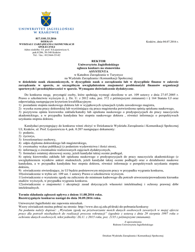 817.1101.33.2016 DZIEKAN WYDZIAŁU ZARZĄDZANIA I KOMUNIKACJI SPOŁECZNEJ Adres siedziby: Ul. prof. S.Łojasiewicza 4, pok.0.206, 30-348 Kraków Tel. / fax.: 012/664-55-82 Kraków, dnia 04.07.2016 r. REKTOR Uniwersytetu Jagiellońskiego ogłasza konkurs na stanowisko ASYSTENTA w Katedrze Zarządzania w Turystyce na Wydziale Zarządzania i Komunikacji Społecznej w dziedzinie nauk ekonomicznych, w dyscyplinie nauk o zarządzaniu lub w dyscyplinie finanse w zakresie zarządzania w sporcie, ze szczególnym uwzględnieniem znajomości problematyki finansów organizacji sportowych i przedsiębiorczości w sporcie. Wymagane doświadczenie dydaktyczne . Do konkursu mogą przystąpić osoby, które spełniają wymogi określone w art. 109 ustawy z dnia 27.07.2005 r. Prawo o szkolnictwie wyższym (t. j. Dz. U. z 2012 roku, poz. 572 z późniejszymi zmianami) i § 164 Statutu UJ oraz odpowiadają następującym kryteriom kwalifikacyjnym: 1) posiadanie stopnia naukowego doktora lub w wyjątkowych sytuacjach tytułu zawodowego magistra, 2) wysoka ocena pracy doktorskiej lub wyróżniająca się praca magisterska potwierdzona opinią opiekuna naukowego, 3) pozytywna opinia kierownika zakładu/katedry lub opiekuna naukowego o predyspozycjach do pracy nauczyciela akademickiego, a w przypadku kandydata bez stopnia naukowego doktora , również informacje o perspektywach uzyskania stopnia doktora. Kandydaci przystępujący do konkursu winni złożyć w Dziekanacie Wydziału Zarządzania i Komunikacji Społecznej UJ, Kraków, ul. Prof. Łojasiewicza 4, pok. 0.207 następujące dokumenty: 1) podanie, 2) życiorys, 3) kwestionariusz osobowy, 4) odpis dyplomu doktorskiego lub magisterskiego, 5) ewentualny wykaz publikacji (z podaniem wydawnictwa i ilości stron), 6) informację o ewentualnie realizowanych zajęciach dydaktycznych, 7) formularz ostatniej okresowej oceny, jeżeli kandydat takiej ocenie podlegał, 8) opinię kierownika zakładu lub opiekuna naukowego o predyspozycjach do pracy nauczyciela akademickiego (z uwzględnieniem wyników ankiet studenckich, jeżeli kandydat takiej ocenie podlegał) oraz o działalności naukowe kandydata, a w przypadku kandydata bez stopnia doktora, również informacje o perspektywach uzyskania stopnia doktora, 9) oświadczenie stwierdzające, że UJ będzie podstawowym miejscem pracy w przypadku wygrania konkursu, 10) oświadczenie w trybie art. 109 ust. 1 ustawy Prawo o szkolnictwie wyższym. 11) oświadczenie o wyrażeniu zgody na zaliczenie do minimum kadrowego dla potrzeb utworzenia/prowadzenia kierunku studiów wyższych, w przypadku wygrania konkursu. 12) oświadczenie o znajomości i akceptacji zasad dotyczących własności intelektualnej i ochrony prawnej dóbr intelektualnych. Termin składania zgłoszeń upływa z dniem 11.08.2016 roku. Rozstrzygnięcie konkursu nastąpi do dnia 30.09.2016 roku. Uniwersytet Jagielloński nie zapewnia mieszkań. Wzory oświadczeń można pobrać na stronie: http://www.dso.uj.edu.pl/druki-do-pobrania/konkursy Na podaniu należy dopisać: „Wyrażam zgodę na przetwarzanie moich danych osobowych zawartych w mojej ofercie pracy dla potrzeb niezbędnych do realizacji procesu rekrutacji” (zgodnie z ustawą z dnia 29 sierpnia 1997 roku o ochronie danych osobowych, tekst jednolity: Dz.U. z 2015 roku, poz. 2135 z późniejszymi zmianami). Z upoważnienia Rektora Uniwersytetu Jagiellońskiego Dziekan Wydziału Zarządzania i Komunikacji Społecznej