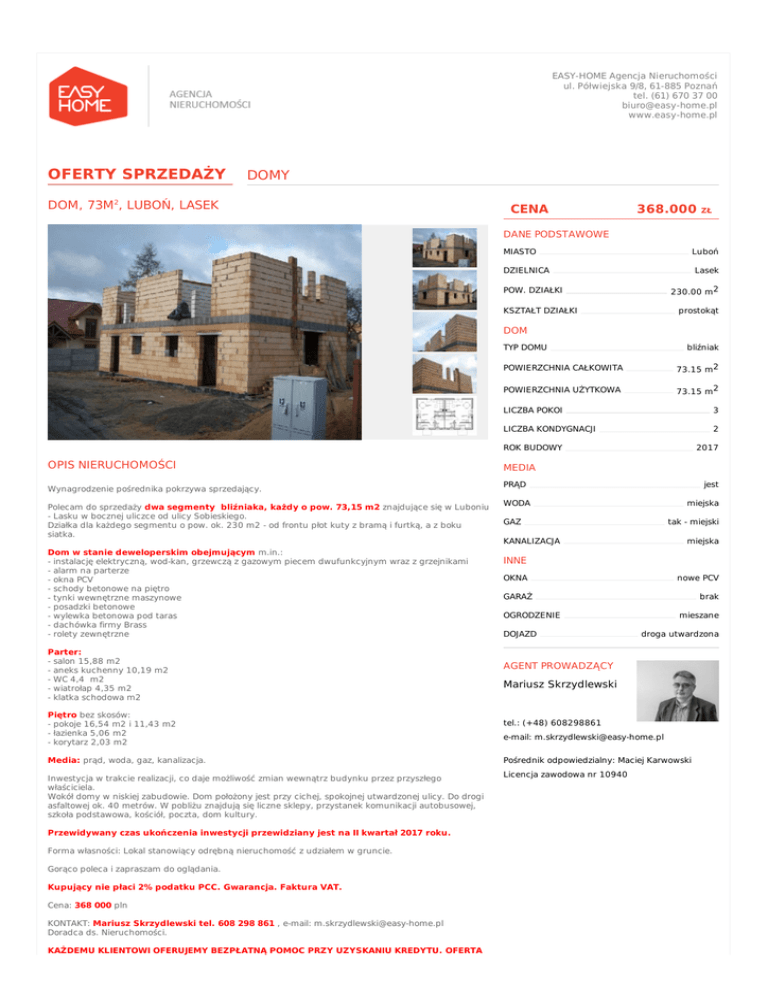EASY-HOME Agencja Nieruchomości ul. Półwiejska 9/8, 61-885 Poznań tel. (61) 670 37 00 [email protected] www.easy-home.pl OFERTY SPRZEDAŻY DOMY DOM, 73M 2, LUBOŃ, LASEK CENA 368.000 ZŁ DANE PODSTAWOWE MIASTO Luboń DZIELNICA Lasek 230.00 m 2 POW. DZIAŁKI KSZTAŁT DZIAŁKI prostokąt DOM TYP DOMU bliźniak POWIERZCHNIA CAŁKOWITA 73.15 m 2 POWIERZCHNIA UŻYTKOWA 73.15 m 2 LICZBA POKOI 3 LICZBA KONDYGNACJI 2 ROK BUDOWY OPIS NIERUCHOMOŚCI Wynagrodzenie pośrednika pokrzywa sprzedający. Polecam do sprzedaży dwa segmenty bliźniaka, każdy o pow. 73,15 m2 znajdujące się w Luboniu - Lasku w bocznej uliczce od ulicy Sobieskiego. Działka dla każdego segmentu o pow. ok. 230 m2 - od frontu płot kuty z bramą i furtką, a z boku siatka. Dom w stanie deweloperskim obejmującym m.in.: - instalację elektryczną, wod-kan, grzewczą z gazowym piecem dwufunkcyjnym wraz z grzejnikami - alarm na parterze - okna PCV - schody betonowe na piętro - tynki wewnętrzne maszynowe - posadzki betonowe - wylewka betonowa pod taras - dachówka firmy Brass - rolety zewnętrzne Parter: - salon 15,88 m2 - aneks kuchenny 10,19 m2 - WC 4,4 m2 - wiatrołap 4,35 m2 - klatka schodowa m2 Piętro bez skosów: - pokoje 16,54 m2 i 11,43 m2 - łazienka 5,06 m2 - korytarz 2,03 m2 Media: prąd, woda, gaz, kanalizacja. Inwestycja w trakcie realizacji, co daje możliwość zmian wewnątrz budynku przez przyszłego właściciela. Wokół domy w niskiej zabudowie. Dom położony jest przy cichej, spokojnej utwardzonej ulicy. Do drogi asfaltowej ok. 40 metrów. W pobliżu znajdują się liczne sklepy, przystanek komunikacji autobusowej, szkoła podstawowa, kościół, poczta, dom kultury. Przewidywany czas ukończenia inwestycji przewidziany jest na II kwartał 2017 roku. Forma własności: Lokal stanowiący odrębną nieruchomość z udziałem w gruncie. Gorąco poleca i zapraszam do oglądania. Kupujący nie płaci 2% podatku PCC. Gwarancja. Faktura VAT. Cena: 368 000 pln KONTAKT: Mariusz Skrzydlewski tel. 608 298 861 , e-mail: [email protected] Doradca ds. Nieruchomości. KAŻDEMU KLIENTOWI OFERUJEMY BEZPŁATNĄ POMOC PRZY UZYSKANIU KREDYTU. OFERTA 2017 MEDIA PRĄD jest WODA miejska GAZ tak - miejski KANALIZACJA miejska INNE OKNA nowe PCV GARAŻ brak OGRODZENIE DOJAZD mieszane droga utwardzona AGENT PROWADZĄCY Mariusz Skrzydlewski tel.: (+48) 608298861 e-mail: [email protected] Pośrednik odpowiedzialny: Maciej Karwowski Licencja zawodowa nr 10940 LICENCJONOWANEGO POŚREDNIKA GWARANCJĄ BEZPIECZNEJ TRANSAKCJI.