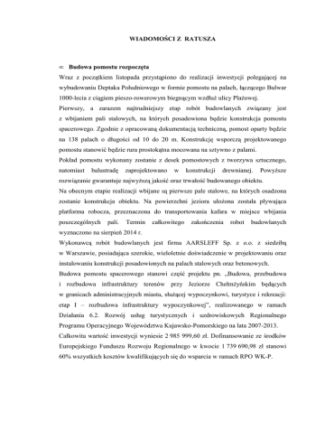 WIADOMOŚCI Z RATUSZA • Budowa pomostu rozpoczęta Wraz z początkiem listopada przystąpiono do realizacji inwestycji polegającej na wybudowaniu Deptaka Południowego w formie pomostu na palach, łączącego Bulwar 1000-lecia z ciągiem pieszo-rowerowym biegnącym wzdłuŜ ulicy PlaŜowej. Pierwszy, a zarazem najtrudniejszy etap robót budowlanych związany jest z wbijaniem pali stalowych, na których posadowiona będzie konstrukcja pomostu spacerowego. Zgodnie z opracowaną dokumentacją techniczną, pomost oparty będzie na 138 palach o długości od 10 do 20 m. Konstrukcję wsporczą projektowanego pomostu stanowić będzie rura prostokątna mocowana na sztywno z palami. Pokład pomostu wykonany zostanie z desek pomostowych z tworzywa sztucznego, natomiast balustradę zaprojektowano w konstrukcji drewnianej. PowyŜsze rozwiązanie gwarantuje najwyŜszą jakość oraz trwałość budowanego obiektu. Na obecnym etapie realizacji wbijane są pierwsze pale stalowe, na których osadzona zostanie konstrukcja obiektu. Na powierzchni jeziora ułoŜona została pływająca platforma robocza, przeznaczona do transportowania kafara w miejsce wbijania poszczególnych pali. Termin całkowitego zakończenia robot budowlanych wyznaczono na sierpień 2014 r. Wykonawcą robót budowlanych jest firma AARSLEFF Sp. z o.o. z siedzibą w Warszawie, posiadająca szerokie, wieloletnie doświadczenie w projektowaniu oraz instalowaniu konstrukcji posadowionych na palach stalowych oraz betonowych. Budowa pomostu spacerowego stanowi część projektu pn. „Budowa, przebudowa i rozbudowa infrastruktury terenów przy Jeziorze ChełmŜyńskim będących w granicach administracyjnych miasta, słuŜącej wypoczynkowi, turystyce i rekreacji: etap I – rozbudowa infrastruktury wypoczynkowej”, realizowanego w ramach Działania 6.2. Rozwój usług turystycznych i uzdrowiskowych Regionalnego Programu Operacyjnego Województwa Kujawsko-Pomorskiego na lata 2007-2013. Całkowita wartość inwestycji wyniesie 2 985 999,60 zł. Dofinansowanie ze środków Europejskiego Funduszu Rozwoju Regionalnego w kwocie 1 739 690,98 zł stanowi 60% wszystkich kosztów kwalifikujących się do wsparcia w ramach RPO WK-P. Fot. 1 Wodowanie platformy roboczej wraz z kafarem od strony ulicy PlaŜowej Fot. 2 Platforma pływająca Fot. 3 Wbijanie pierwszych pali pod budowę nowego pomostu Fot. 4 Wbijanie pierwszych pali • Przetarg na obsługę strefy płatnego parkowania W dniu 18 listopada br. gmina miasto ChełmŜa ogłosiła przetarg nieograniczony na świadczenie usługi obejmującej prowadzenie strefy płatnego parkowania pojazdów na terenie miasta ChełmŜy wraz z pobieraniem opłat parkingowych. Oferty moŜna składać do dnia 27 listopada 2013 r. do godziny 1000 w siedzibie Urzędu Miasta ChełmŜy. Warunkiem przystąpienia do przetargu jest wniesienie wadium w wysokości 1 000,00 zł. Szczegółowe informacje na temat postępowania moŜna uzyskać w siedzibie Urzędu Miasta ChełmŜy, przy ul. Gen. J. Hallera 2 w pokoju nr 18 a w Małym Ratuszu, a takŜe na stronie internetowej Biuletynu Informacji Publicznej Urzędu Miasta ChełmŜy www.bip.chelmza.pl w zakładce poświęconej przetargom. W strefie płatnego parkowania znajduje się blisko 115 miejsc parkingowych, połoŜonych w obszarze ulic Sikorskiego, Paderewskiego, Sądowej, Strzeleckiej, Kopernika, Rynek, Rynek Bednarski oraz Rynek Garncarski. Obszar, w którym zlokalizowane są płatne miejsca parkingowe oznaczony jest znakami drogowymi D-44 (strefa parkowania ) oraz D-45 ( koniec strefy parkowania ) wraz z informacją określającą wysokość opłat oraz dni i godziny ich pobierania. Opłaty za parkowanie pojazdów w strefie płatnego parkowania ustalone zostały na podstawie Uchwały Nr XX/143/12 Rady Miejskiej ChełmŜy z dnia 8 listopada 2012 r. w sprawie ustalenia strefy płatnego parkowania oraz wprowadzenia i ustalenia stawek opłat za parkowanie pojazdów samochodowych w strefie płatnego parkowania oraz sposobu pobierania opłat. Przypomnijmy, iŜ zgodnie z ww. uchwałą, za pierwszą godzinę postoju w wyznaczonych, płatnych miejscach parkingowych, opłata wynosi 1,20 zł, za drugą godzinę naleŜy uiścić opłatę w wysokości 1,40 zł, natomiast za trzecią 1,60 zł. KaŜda kolejna godzina kosztuje 1,20 zł. Nie wniesienie opłaty w wymienionej powyŜej wysokości skutkuje nałoŜeniem na właściciela pojazdu dodatkowej opłaty w wysokości 50,00 zł. Kontrolę w przedmiotowym zakresie prowadzi StraŜ Miejska. • POMOC OSOBOM BEZDOMNYM! Aura jest dla nas w tym roku co prawda „łaskawa”, jednakŜe panujące warunki atmosferyczne nie sprzyjają całodobowemu przebywaniu osób na zewnątrz. W tej sytuacji, Miejski Ośrodek Pomocy Społecznej zwraca się z apelem do mieszkańców ChełmŜy o szczególną wraŜliwość społeczną w zakresie zwrócenia uwagi na osoby bezdomne, przebywające na obszarze miasta! Bezdomność w ujęciu socjologicznym to problem społeczny, charakteryzujący się brakiem stałego zamieszkania. Zgodnie z ustawą z dnia 12 marca 2004 roku o pomocy społecznej, pomoc osobom bezdomnym naleŜy do zadań własnych gminy. W zakres udzielanej przez wyspecjalizowane jednostki pomocy wchodzi m.in. udzielenie schronienia, dostarczenia posiłku i niezbędnej odzieŜy. Ponadto warto w tym miejscu zaznaczyć, Ŝe jedną z waŜniejszych przesłanek wykonywanej pracy socjalnej jest ukierunkowanie osoby bezdomnej na wyjście jej z tej sytuacji kryzysowej. Ośrodek Wsparcia CARITAS Diecezji Toruńskiej w ChełmŜy Telefony kontaktowe w sprawie osób bezdomnych : - /56/6752469 – Miejski Ośrodek Pomocy Społecznej w ChełmŜy, - 606730365 – StraŜ Miejska, - /56/ 6751900 – Policja. • NOWE ŚWIADCZENI E - DODATEK ENERGETYCZNY Na podstawie wprowadzonej definicji „odbiorca wraŜliwy energii elektrycznej” wynikającej ze zmienionego Prawa energetycznego (Dz. U. z 2013 r., poz. 984), osoby otrzymujące dodatek mieszkaniowy będą mia