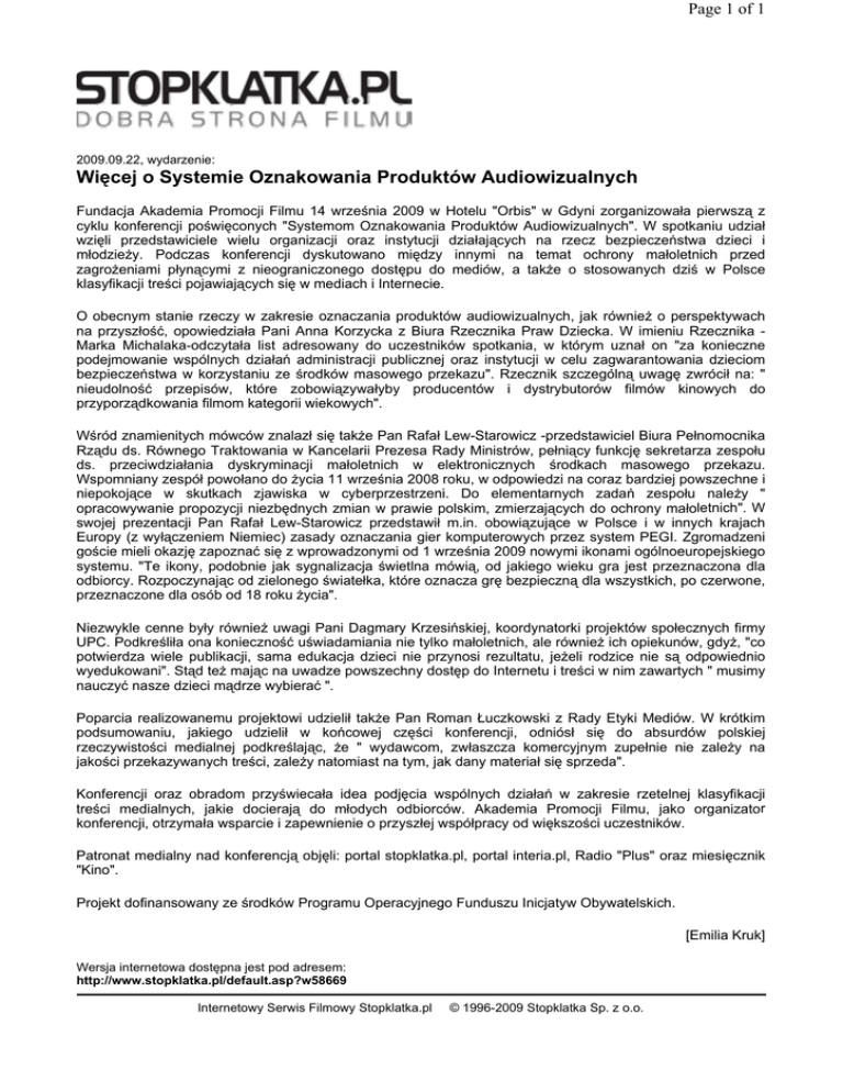 Page 1 of 1 2009.09.22, wydarzenie: Więcej o Systemie Oznakowania Produktów Audiowizualnych Fundacja Akademia Promocji Filmu 14 września 2009 w Hotelu "Orbis" w Gdyni zorganizowała pierwszą z cyklu konferencji poświęconych "Systemom Oznakowania Produktów Audiowizualnych". W spotkaniu udział wzięli przedstawiciele wielu organizacji oraz instytucji działających na rzecz bezpieczeństwa dzieci i młodzieży. Podczas konferencji dyskutowano między innymi na temat ochrony małoletnich przed zagrożeniami płynącymi z nieograniczonego dostępu do mediów, a także o stosowanych dziś w Polsce klasyfikacji treści pojawiających się w mediach i Internecie. O obecnym stanie rzeczy w zakresie oznaczania produktów audiowizualnych, jak również o perspektywach na przyszłość, opowiedziała Pani Anna Korzycka z Biura Rzecznika Praw Dziecka. W imieniu Rzecznika Marka Michalaka-odczytała list adresowany do uczestników spotkania, w którym uznał on "za konieczne podejmowanie wspólnych działań administracji publicznej oraz instytucji w celu zagwarantowania dzieciom bezpieczeństwa w korzystaniu ze środków masowego przekazu". Rzecznik szczególną uwagę zwrócił na: " nieudolność przepisów, które zobowiązywałyby producentów i dystrybutorów filmów kinowych do przyporządkowania filmom kategorii wiekowych". Wśród znamienitych mówców znalazł się także Pan Rafał Lew-Starowicz -przedstawiciel Biura Pełnomocnika Rządu ds. Równego Traktowania w Kancelarii Prezesa Rady Ministrów, pełniący funkcję sekretarza zespołu ds. przeciwdziałania dyskryminacji małoletnich w elektronicznych środkach masowego przekazu. Wspomniany zespół powołano do życia 11 września 2008 roku, w odpowiedzi na coraz bardziej powszechne i niepokojące w skutkach zjawiska w cyberprzestrzeni. Do elementarnych zadań zespołu należy " opracowywanie propozycji niezbędnych zmian w prawie polskim, zmierzających do ochrony małoletnich". W swojej prezentacji Pan Rafał Lew-Starowicz przedstawił m.in. obowiązujące w Polsce i w innych krajach Europy (z wyłączeniem Niemiec) zasady oznaczania gier komputerowych przez system PEGI. Zgromadzeni goście mieli okazję zapoznać się z wprowadzonymi od 1 września 2009 nowymi ikonami ogólnoeuropejskiego systemu. "Te ikony, podobnie jak sygnalizacja świetlna mówią, od jakiego wieku gra jest przeznaczona dla odbiorcy. Rozpoczynając od zielonego światełka, które oznacza grę bezpieczną dla wszystkich, po czerwone, przeznaczone dla osób od 18 roku życia". Niezwykle cenne były również uwagi Pani Dagmary Krzesińskiej, koordynatorki projektów społecznych firmy UPC. Podkreśliła ona konieczność uświadamiania nie tylko małoletnich, ale również ich opiekunów, gdyż, "co potwierdza wiele publikacji, sama edukacja dzieci nie przynosi rezultatu, jeżeli rodzice nie są odpowiednio wyedukowani". Stąd też mając na uwadze powszechny dostęp do Internetu i treści w nim zawartych " musimy nauczyć nasze dzieci mądrze wybierać ". Poparcia realizowanemu projektowi udzielił także Pan Roman Łuczkowski z Rady Etyki Mediów. W krótkim podsumowaniu, jakiego udzielił w końcowej części konferencji, odniósł się do absurdów polskiej rzeczywistości medialnej podkreślając, że " wydawcom, zwłaszcza komercyjnym zupełnie nie zależy na jakości przekazywanych treści, zależy natomiast na tym, jak dany materiał się sprzeda". Konferencji oraz obradom przyświecała idea podjęcia wspólnych działań w zakresie rzetelnej klasyfikacji treści medialnych, jakie docierają do młodych odbiorców. Akademia Promocji Filmu, jako organizator konferencji, otrzymała wsparcie i zapewnienie o przyszłej współpracy od większości uczestników. Patronat medialny nad konferencją objęli: portal stopklatka.pl, portal interia.pl, Radio "Plus" oraz miesięcznik "Kino". Projekt dofinansowany ze środków Programu Operacyjnego Funduszu Inicjatyw Obywatelskich. [Emilia Kruk] Wersja internetowa dostępna jest pod adresem: http://www.stopklatka.pl/default.asp?w58669 Internetowy Serwis Filmowy Stopklatka.pl © 1996-2009 Stopklatka Sp. z o.o.