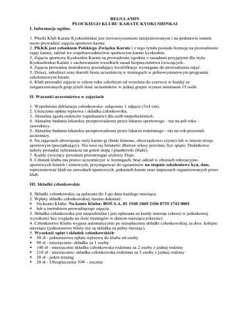 REGULAMIN PŁOCKIEGO KLUBU KARATE KYOKUSHINKAI I. Informacje ogólne. 1. Płocki Klub Karate Kyokushinkai jest stowarzyszeniem zarejestrowanym i na podstawie statutu może prowadzić zajęcia sportowe karate. 2. PKKK jest członkiem Polskiego Związku Karate i z tego tytułu posiada licencję na prowadzenie zajęć karate, udział we współzawodnictwie sportowym karate kyokushin. 3. Zajęcia sportowe Kyokushin Karate są prowadzone zgodnie z zasadami przyjętymi dla stylu Kyokushinkai Karate z zachowaniem wszelkich zasad bezpieczeństwa ćwiczących.. 4. Zajęcia prowadzą instruktorzy posiadający kwalifikacje wymagane do prowadzenia zajęć. 5. Dzieci, młodzież oraz dorośli biorą uczestniczą w treningach w pełnowymiarowym programie szkoleniowym karate. 6. Klub prowadzi zajęcia w całym roku szkolnym od września do czerwca w każdej ze zorganizowanych grup jeżeli ilość uczestników w jednej grupie wynosi minimum 15 osób. II. Warunki uczestnictwa w zajęciach 1. Wypełniona deklaracja członkowska- załączone 1 zdjęcie (3x4 cm). 2. Uiszczona opłata wpisowa i składka członkowska. 3. Aktualna zgoda rodziców (opiekunów) dla osób niepełnoletnich . 4. Aktualne badania lekarskie przeprowadzone przez lekarza sportowego - raz na pół roku – zawodnicy. 5. Aktualne badania lekarskie przeprowadzone przez lekarza rodzinnego - raz na rok-pozostali uczestnicy. 6. Na zajęciach obowiązuje strój karate-gi (białe kimono, obowiązkowo czyste) lub w innym stroju sportowym (początkujący). Nie nosi się biżuterii; dłuższe włosy powinny być spięte. Dodatkowo należy posiadać ochraniacze na goleń stopę i piąstkówki (białe). 7. Każdy ćwiczący powinien przestrzegać etykiety Dojo. 8. Członek klubu ma prawo uczestniczyć w treningach, brać udział w obozach rekreacyjnosportowych letnich i zimowych, przystępować do egzaminów na stopnie szkoleniowe kyu, dan; reprezentować klub na zawodach sportowych, pokazach karate oraz imprezach organizowanych przez klub. III. Składki członkowskie 1. Składki członkowskie są opłacane do 5-go dnia każdego miesiąca. 2. Wpłaty składki członkowskiej można dokonać: Na konto Klubu: Na konto Klubu: BOŚ S.A. 81 1540 1069 2106 8729 1743 0001 lub u instruktora prowadzącego zajęcia. 3. Składka członkowska jest niepodzielna i jest opłacana za każdy miesiąc (okres) w jednakowej wysokości bez względu na ilość treningów w danym miesiącu (okresie). 4. Członkostwo Klubu wygasa automatycznie po nieopłaceniu składki członkowskiej za dwa kolejne miesiące (jednorazowe bilety nie są składką za pełny miesiąc). 5. Wysokość opłat i składek członkowskich: 30 zł - jednorazowa opłata wpisowa do klubu od osoby 90 zł - miesięcznie- składka za 1 osobę 140 zł - miesięcznie składka członkowska rodzinna za 2 osoby z jednej rodziny 210 zł - miesięcznie- składka członkowska rodzinna za 3 osoby z jednej rodziny 20 zł - jeden trening 20 zł - Ubezpieczenie NW - rocznie 7. Uczestnik powinien zgłosić u instruktora prowadzącego ewentualne przypadki upoważniające do zmniejszenia składki: przerwa w zajęciach spowodowana chorobą inne przypadki losowe IV. Warunki Bezpieczeństwa i NW. 1. Wszyscy członkowie Klubu biorący udział w zajęciach są objęci ubezpieczeniem od następstw nieszczęśliwych wypadków wynikłych w czasie trwania zajęć. 2. W czasie zajęć ćwiczący ściśle wykonują polecenia instruktora, a opuszczenie sali ćwiczeń jest możliwe tylko po uprzednim zgłoszeniu prowadzącemu instruktorowi. 3. Wszelkie kontuzje i inne przypadłości zdrowotne muszą być natychmiast zgłaszane prowadzącemu zajęcia i odnotowane w dzienniku zajęć, co jest warunkiem dalszych starań o odszkodowanie z ubezpieczenia NNW. Zarząd Płockiego Klubu Karate Kyokushinkai