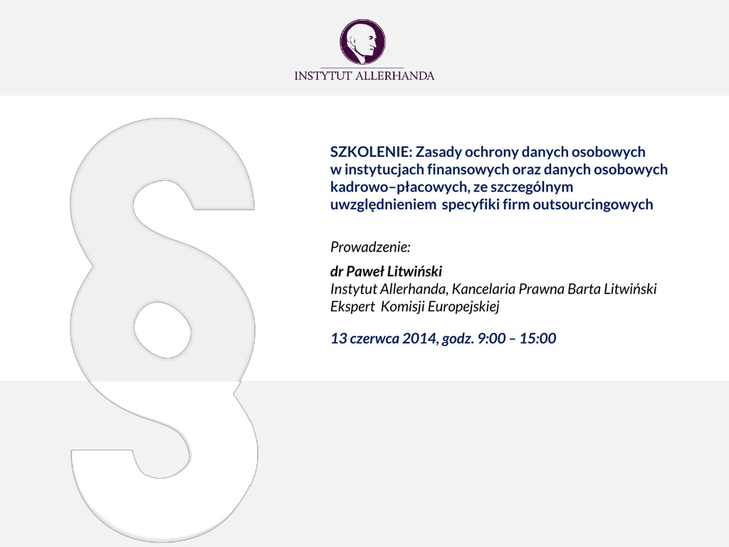 SZKOLENIE: Zasady ochrony danych osobowych w instytucjach finansowych oraz danych osobowych kadrowo–płacowych, ze szczególnym uwzględnieniem specyfiki firm outsourcingowych Prowadzenie: dr Paweł Litwiński Instytut Allerhanda, Kancelaria Prawna Barta Litwiński Ekspert Komisji Europejskiej 13 czerwca 2014, godz. 9:00 – 15:00 IDEA *Korporacja, do której należy moja spółka, chce uzyskać szczegółowe dane o zarobkach pracowników spółki – mogę takie dane przekazać? *Nasza spółka otrzymała polecenie korzystania z outsourcingu kadrowo – płacowego realizowanego przez spółkę z Indii – czy mogę przekazać dane moich pracowników do Indii? *System informatyczny, w którym moja spółka przetwarza dane kadrowe, znajduje się w Londynie, a dane są przechowywane w chmurze – co musze zrobić, żeby z takiego systemu korzystać zgodnie z prawem? Jeżeli na co dzień spotykają się Państwo z tego rodzaju pytaniami i chcieliby uzyskać na nie odpowiedź, zapraszamy na specjalistyczne szkolenie! Tematem szkolenia będą zasady ochrony danych osobowych w instytucjach finansowych oraz danych osobowych kadrowo – płacowych, ze szczególnym uwzględnieniem specyfiki firm outsourcingowych RAMOWY PROGRAM SZSZKOLENIASZKOLENIA 1. Podstawowe informacje na temat polskiego i europejskiego prawa ochrony danych osobowych 2. Zasady ochrony danych osobowych 3. Legalność przetwarzania 4. Obowiązki informacyjne 5. Zabezpieczenie danych 6. Rejestracja zbiorów danych osobowych w GIODO 7. Grupy kapitałowe z perspektywy prawa ochrony danych osobowych 8. Przekazywanie danych osobowych do innych państw 9. Zasady powierzenia i udostępniania danych osobowych TERMIN SZKOLENIA 13 czerwca 2014, godz. 9:00 – 15:00 KOSZT SZKOLENIA 400 zł netto + 23% VAT W cenie szkolenia: materiały szkoleniowe, przerwy kawowe, przekąska. Wpłaty prosimy dokonywać po otrzymaniu potwierdzenia udziału w szkoleniu, na należące do Instytutu Allerhanda konto o numerze: 20 2490 0005 0000 4500 3138 4174 Organizator rezerwuje sobie prawo do odwołania planowanego szkolenia z przyczyn od siebie niezależnych. MIEJSCE SZKOLENIA Instytut Allerhanda, Plac Sikorskiego 2/7 31-115 Kraków Tel. (12) 341 46 48 www.training.allerhand.pl REJESTRACJA www.training.allerhand.pl PROWADZENIE Dr Paweł Litwiński Adwokat, partner w kancelarii Barta Litwiński Kancelaria Radców Prawnych i Adwokatów, członek sekcji prawa własności intelektualnej Instytutu Allerhanda, Ekspert Komisji Europejskiej ds. umów cloud computing. Absolwent Wydziału Prawa i Administracji Uniwersytetu Śląskiego w Katowicach, Wydziału Prawa i Administracji Uniwersytetu Jagiellońskiego w Krakowie oraz Szkoły Prawa Amerykańskiego UJ i Catholic University of America, Columbus School of Law, Washington. Autor i współautor licznych publikacji naukowych i popularnonaukowych z zakresu prawa ochrony danych osobowych, prawa nowych technologii i prawa telekomunikacyjnego, w tym komentarza do ustawy o ochronie danych osobowych (CH Beck, 2009), monografii „Ochrona danych osobowych w ogólnym postępowaniu administracyjnym” (Wolters Kluwer, 2009), a także pozycji p.t. „Prawo Internetu” (LexisNexis 2004, 2007), „Prawo reklamy i promocji” (LexisNexis 2007), monografii: „Ochrona danych osobowych. Aktualne problemy i nowe wyzwania” (2007), „Ochrona danych osobowych w Polsce z perspektywy dziesięciolecia” (2007) oraz „Prawo umów elektronicznych” (2006). Prelegent na konferencjach, szkoleniach i kongresach związany z powyższą tematyką prawną. Wykładowca Kolegium Studiów Społecznych Instytutów Polskiej Akademii Nauk oraz na Wydziale Prawa i Administracji Uniwersytetu Śląskiego w Katowicach. ORGANIZATOR Instytut Allerhanda ośrodek zaawansowanych studiów prawnych z siedzibą w Krakowie, OPP. Specjalizuje się m.in. w prawie handlowym, prawie własności intelektualnej, prawie upadłościowym, a także prawie rynku finansowego, corporate governance i organizacji wymiaru sprawiedliwości. Instytut prowadzi także badania interdyscyplinarne, zwłaszcza z wykorzystaniem ekonomicznej analizy prawa. www.allerhand.pl