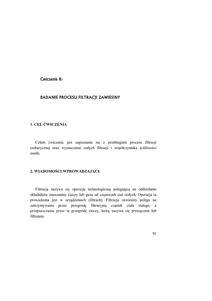 Ćwiczenie 8: BADANIE PROCESU FILTRACJI ZAWIESINY 1. CEL ĆWICZENIA Celem ćwiczenia jest zapoznanie się z przebiegiem procesu filtracji izobarycznej oraz wyznaczenie stałych filtracji i współczynnika ściśliwości osadu. 2. WIADOMOŚCI WPROWADZAJĄCE Filtracją nazywa się operację technologiczną polegającą na oddzielaniu składników mieszaniny cieczy lub gazu od cząsteczek ciał stałych. Operacja ta prowadzona jest w urządzeniach (filtrach). Filtracja zawiesiny polega na zatrzymywaniu przez przegrodę filtracyjną cząstek ciała stałego, a przepuszczaniu przez tę przegrodę cieczy, którą nazywa się przesączem lub filtratem. 91 92 Przegroda filtracyjna może mieć strukturę ziarnistą lub włóknistą. Przykładem przegród filtracyjnych mogą być: warstwa piasku, tkanina z materiałów włóknistych, naturalnych lub sztucznych, porowate wyroby ceramiczne itp. Sama przegroda filtracyjna ma zwykle małą zdolność filtrowania i dlatego jako warstwa filtrująca wykorzystywany jest tworzący się na przegrodzie osad. Ponieważ w trakcie trwania procesu, porowatość warstwy osadu (tzw. placka filtracyjnego) zmienia się zwykle w istotny sposób (maleje), ściśliwość osadu ma duży wpływ na przebieg filtracji. Siłą pod wpływem działania której w trakcie filtracji ma miejsce przepływ płynu, jest różnica ciśnienia przed i za przegrodą filtracyjną. Ze względu na sposób wytwarzania tej różnicy, filtrację można podzielić na: grawitacyjną - różnica ciśnienia wywołana jest parciem hydrostatycznym słupa zawiesiny nad przegrodą, rys. 1. ciśnieniową - nadciśnienie przed przegrodą wywołane jest zwykle pompą tłoczącą zawiesinę; próżniową - podciśnienie za przegrodą wywołane jest pompą próżniową; wirówkową - różnica ciśnienia po obu stronach przegrody wywołana jest działaniem siły odśrodkowej. ZAWIESINA z H OSAD P PRZEGRODA FILTRACYJNA FILTRAT 93 Rys. 1. Schemat filtracji grawitacyjnej, P = z g$ H Zmiany wartości różnicy ciśnienia po obu stronach przegrody w trakcie trwania procesu filtracji, związane są bezpośrednio ze sposobem w jaki się go prowadzi. W praktyce wykorzystuje się trzy sposoby: filtrację przy stałej różnicy ciśnienia (izobaryczną) - w tym przypadku wraz z upływem czasu trwania procesu, zwiększa się grubości osadu na filtrze (a tym samym jego opór) i wydajność filtracji maleje; filtrację przy stałej wydajności filtratu - w miarę upływu czasu, zwiększa się wartość różnicy ciśnienia w stopniu proporcjonalnym do zwiększania oporu warstwy osadu; filtrację dwustopniową - w pierwszym okresie proces zachodzi przy stałej niewielkiej wydajności filtratu (mała P). Po utworzeniu się na przegrodzie warstwy osadu o odpowiednich właściwościach filtracyjnych rozpoczyna się okres drugi - filtracja pod stałym ciśnieniem (duża P). Niezależnie od sposobu prowadzenia procesu, filtracji mogą być poddawane zawiesiny z osadami nieściśliwymi i osadami ściśliwymi. Ściśliwość osadu ma bezpośredni wpływ na wydajność filtracji i wymagane warunki jej prowadzenia. Współczynnik ściśliwości dla typowych osadów podaje literatura, np. [1, 2]. Ponieważ produktem filtracji może być zarówno przesącz jak i osad (lub też oba z nich), dlatego niejednokrotnie proces prowadzony jest na filtrze w dwóch etapach: etap I - filtracja właściwa dla otrzymania filtratu; etap II - przemywanie osadu w celu oczyszczenia go lub dodatkowego odzyskania fazy ciekłej zawartej w mokrym osadzie. Filtracja izobaryczna 94 Ogólne równanie opisujące przebieg filtracji z wydzieleniem osadu nieściśliwego ma postać dV F d P V C s o c r F (1) gdzie: V - objętość filtratu, m3; F - powierzchnia przegrody filtracyjnej, m2; - czas trwania filtracji, s; P - różnica ciśnień przed i za przegrodą filtracyjną, Pa; - opór właściwy osadu wydzielonego na przegrodzie, m/kg; c - lepkość cieczy, Pas; Cs - koncentracja ciała stałego w filtrowanej zawiesinie, kg/m3; r - jednostkowa ilość wydzielonego osadu, zapewniająca opór przepływu filtratu przez przez ten osad, równoważny oporom przepływu filtratu przez samą przegrodę filtracyjną, kg/m2. W przypadku filtracji zachodzącej z wydzieleniem osadu ściśliwego, uwzględnić należy zmiany oporu właściwego placka filtracyjnego. Zmiany te wyraża empiryczne równanie o o,ś ć P s w którym: (2) o,ść - opór właściwy osadu ściśliwego, (m/kg)(ms2/kg)S; P - różnica ciśnień przed i za przegrodą filtracyjną, Pa; s - współczynnik ściśliwości placka filtracyjnego. Po podstawieniu zależności (2) do równania (1) i pewnym uporządkowaniu wielkości 95 dV F P 1 s d V C s o,ś ć c r F (3) Scałkowanie zależności (3), przy założeniuP=const (filtracja izobaryczna), w granicach od V=0 do V= Voraz od=0 dof prowadzi do równania V w którym: 2 F P 1 s f V C s o,ś ć c 2 r F (4) V- objętość filtratu uzyskana po czasie f m3; f- czas trwania filtracji izobarycznej, s. Przyjmując oznaczanie objętości otrzymywanego filtratu jedynie symbolem V i czasu filtracji symbolem równanie (4) można sprowadzić, po pewnych przekształcenia, do postaci liniowej V K 1 C1 V F F (5) lub (częściej podawanej w literaturze) postaci parabolicznej V 2 2 V C2 K2 (6) w których poszczególne wielkości stałe C i K wyrażane są jako C1 C2 o ,ś ć c r P 1-s Fr Cs ; K1 o,ś ć c C s , 2 P 1-s (7) ; K2 2 P 1-s F 2 , o,ść c C s (8) Interpretację równania (6) przedstawiono na rys. 2. objętość filtratu, V 96 V2+ 2 C2V = K2 C22 K2 0 czas, C2 Rys 2. Zależność objętości filtratu od czasu filtracji, przy P=const Paraboliczny przebieg zależności (1) oznacza, że wraz z upływem czasu otrzymywać się będzie coraz mniejszy strumień filtratu. Taki przebieg procesu podyktowany jest stałą wartością różnicy ciśnienia i zwiększającym się w sposób ciągły oporem warstwy osadu. Bezpośredni wpływ na szczegółową postać równa