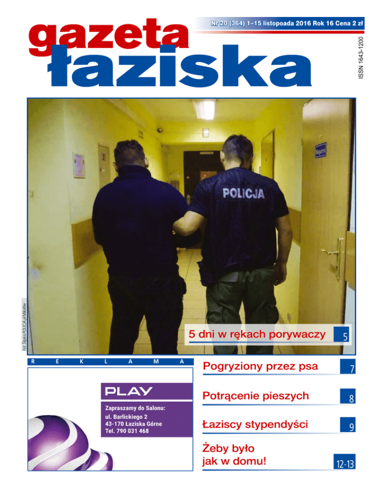 Fot. Śląska.POLICJA.pl Mikołów Nr 20 (364) 1–15 listopoada 2016 Rok 16 Cena 2 zł 5 dni w rękach porywaczy R E K L A M A Pogryziony przez psa 7 Potrącenie pieszych 8 Łaziscy stypendyści 9 Zapraszamy do Salonu: ul. Barlickiego 2 43-170 Łaziska Górne Tel. 790 031 468 Żeby było jak w domu! 140-5745-Reklama-prasowa-8,9x6,3cm-LaziskaGorne-ID-3013.indd 1 5 2016-05-30 15:21:55 12-13 informator gazeta łaziska INFORMATOR NUMERY ALARMOWE Państwowa Straż Pożarna (998) 32 326 23 10 OSP Ł. Górne 32 224 21 20 OSP Ł. Średnie 32 224 21 22 OSP Ł. Dolne 32 224 21 21 Policja (997) 32 226 85 10 Straż Miejska (986) 32 224 44 71 POGOTOWIA Ratunkowe (999) 32 226 21 00 32 226 26 65 Centrum Medyczne 32 325 76 00 Gazowe (992) 32 227 31 24 Energetyczne (991) 32 303 21 55 Ciepłownicze 32 226 21 36 Wodno-kanalizacyjne 32 224 18 37 32 224 14 52 PGKiM 32 224 10 88, 32 224 15 50 Punkt konsultacyjny Gminnej Komisji Rozwiązywania Problemów Alkoholowych 32 224 23 90 PRZYCHODNIE Proelmed (ul. Wyzwolenia 30)32 324 31 23 Przychodnia (ul. Staszica 4a)32 737 02 30 Przychodnia (ul. Chopina 17)32 736 76 70 32 736 76 55 APTEKI „Arnika” (os. Centrum 7) 32 224 38 39 „Novum” (ul. Dworcowa 10) 32 224 10 18 „Moja Apteka” (ul. Staszica 2/2) 32 736 80 90 „Moja Apteka” (ul. Barlickiego 2) 32 738 90 90 „Dbam o Zdrowie” (ul. Wiejska 1) 32 322 70 95 „Dbam o Zdrowie” (ul. Chopina 17) 32 736 76 37 „Apteka św. Anny” (ul. Wyrska 12B) 32 216 11 14 INNE Urząd Miasta 32 324 80 00 Starostwo Powiatowe 32 324 81 00 MDK Ł. Górne 32 224 10 33 MDK Ł. Średnie 32 224 48 18 MDK Ł. Dolne 32 322 94 46 PiMBP (biblioteka) 32 224 14 12 Parafia Ł. Górne 32 224 10 13 Parafia Ł. Średnie 32 224 10 03 Parafia Ł. Dolne 32 224 18 42 MOSiR 32 221 11 38 ORS „Żabka” 32 322 93 82 Środowiskowy Dom 32 737 00 46 Samopomocy 698 639 036 OPS 32 326 23 40, 32 326 23 42 SZKOŁY Szkoła Podstawowa nr 1 32 224 10 44 Szkoła Podstawowa nr 5 32 224 12 07 Szkoła Podstawowa nr 6 32 224 32 46 Gimnazjum nr 1 32 224 10 66 Gimnazjum nr 3 32 737 01 17 Zespół Szkół im. Piastów Śląskich 32 224 10 12 Zespół Szkół Energetycznych i Usługowych 32 224 24 15 2 1 - 15 listopada 2016 MDK zaprasza... …13 listopada o godz. 18.00 do sali widowiskowej na komedię terapeutyczną Mężczyzna Idealny. Bilety w cenie 60 zł (parter), 50 zł (balkon) do nabycia w kasie MDK. …18 listopada o godz. 17.00 do sali widowiskowej na Koncert Charytatywny dla Michała Moronia. Wystąpią: Orkiestra Dęta KWK „Bolesław Śmiały”, Orkiestra Dęta Tauron Wytwarzanie oddział Elektrownia Łaziska, Bartłomiej Marek, zespół Top Musix oraz gwiazdy Śląskiej Estrady Muzycznej – Claudia i Kasia Chwołka i zespół Bajery. Wejściówki w cenie 20 zł można nabyć w kasie MDK. Całkowity dochód z koncertu zostanie przekazany na leczenie choroby nowotworowej Michała Moronia. …20 listopada o godz. 17.00 do sali widowiskowej na koncert Dziecięcego Zespołu Artystycznego Radość wraz z gośćmi – Anną Kamyk, Barbarą Solich, Mateuszem Wróblem, parą taneczną Małgorzatą Langner i Ryszardem Giemzą oraz teatrem BAZA. Wejściówki w cenie 5 zł można nabyć w kasie MDK. …25 listopada o godz. 18.30 na Operetkowy Koncert Andrzejkowy. Wystąpi Sylwester Targosz-Szalonek – śląski tenor i jego goście. Będzie dużo wspaniałej muzyki, dobrego humoru, zabawy i… andrzejkowego lania wosku. Bilety w cenie 40 zł (normalny) i 35 zł (emeryci i renciści) można nabyć w kasie MDK. …27 listopada o godz. 17.00 na Zabawę Andrzejkową. Bilety w cenie 40 zł – członkowie UTW i 50 zł osoby spoza UTW. W cenie: zabawa przy muzyce, kawa, ciastko i ciepły posiłek. Bilety do nabycia w kasie MDK. Zapraszamy na koncert O przyszłości elektrowni Zapraszamy na wyjazd do katowickiego Spodka na Koncert Galowy (Bożonarodzeniowy) Zespołu Pieśni i Tańca Śląsk im. Stanisława Hadyny. Piątek, 9 grudnia, wyjazd z Łazisk Górnych o godz. 16.45. Koncert o godz. 18.00. Koszt wyjazdu dla słuchaczy UTW w Łaziskach Górnych wynosi – 85 zł. Pozostali – 100 zł. Cena obejmuje przejazd oraz bilet wstępu. Zapisy i wpłaty przyjmuje sekretariat MDK. Ilość miejsc ograniczona! Serdecznie zapraszamy! Podczas sesji RM, 25 października, czyli już po zamknięciu tego numeru Gazety Łaziskiej, odbyła się dyskusja na temat przyszłości łaziskiej elektrowni. W sesji wzięli udział przedstawiciele władz Tauron Wytwarzanie, elektrowni, związków zawodowych oraz poseł Izabela Kloc. W toku dyskusji przedstawione zostały perspektywy działalności łaziskiego oddziału do roku 2028. Choć mówi się o niezagrożonym funkcjonowaniu, to nie obejdzie się bez pewnych ograniczeń i zmian – m.in. wyłączenia dwóch mniejszych bloków 125 kW, które nastąpi najpóźniej w 2018 roku. Szczegółową relację przedstawimy w najbliższym numerze GŁ. mred. K O N D O L E N Pani Justynie Olszy wyrazy głębokiego współczucia i żalu z powodu śmierci OJCA składa personel Przedszkola nr 7 w Łaziskach Górnych C J E z życia miasta Przychodnia prawie gotowa Mieszkańcy ulic Kwiatowej, 1 Maja i Chopina doczekali się w rejonie swoich domów ograniczenia hałasu, który dobiegał z hali produkcyjnej firmy Nowa Plast Sp. z o.o. W wyniku ich protestów i pism kierowanych w tej sprawie m.in. do Wojewódzkiego Inspektoratu Ochrony Środowiska, zlecono badania poziomu hałasu. Pozostaje jeszcze kwestia gryzącego zapachu N a prośbę mieszkańców burmistrz Aleksander Wyra 12 października zorganizował spotkanie m.in. z przedstawicielami starostwa oraz firmy, której hala była źródłem uciążliwego hałasu. Grażyna Sarnes, naczelnik Wydziału Gospodarki Mieniem i Ochrony Środowiska Starostwa Powiatowego w Mikołowie zapewniła zainteresowanych mieszkańców, że starosta wszczął postępowanie administracyjne przeciwko firmie Nowa Plast w sprawie dopuszczalnego poziomu hałasu. W sprawie dotyczącej uciążliwości zapachowej starosta po