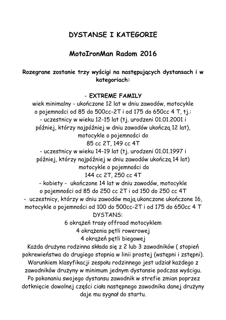 DYSTANSE I KATEGORIE MotoIronMan Radom 2016 Rozegrane zostanie trzy wyścigi na następujących dystansach i w kategoriach: - EXTREME FAMILY wiek minimalny - ukończone 12 lat w dniu zawodów, motocykle o pojemności od 85 do 500cc-2T i od 175 do 650cc 4 T, tj.: - uczestnicy w wieku 12-15 lat (tj. urodzeni 01.01.2001 i później, którzy najpóźniej w dniu zawodów ukończą 12 lat), motocykle o pojemności do 85 cc 2T, 149 cc 4T - uczestnicy w wieku 14-19 lat (tj. urodzeni 01.01.1997 i później, którzy najpóźniej w dniu zawodów ukończą 14 lat) motocykle o pojemności do 144 cc 2T, 250 cc 4T - kobiety - ukończone 14 lat w dniu zawodów, motocykle o pojemności od 85 do 250 cc 2T i od 150 do 250 cc 4T - uczestnicy, którzy w dniu zawodów mają ukonczone ukończone 16, motocykle o pojemności od 100 do 500cc-2T i od 175 do 650cc 4 T DYSTANS: 6 okrążeń trasy offroad motocyklem 4 okrążenia pętli rowerowej 4 okrążeń pętli biegowej Każda drużyna rodzinna składa się z 2 lub 3 zawodników ( stopień pokrewieństwa do drugiego stopnia w linii prostej (wstępni i zstępni). Warunkiem klasyfikacji zespołu rodzinnego jest udział każdego z zawodników drużyny w minimum jednym dystansie podczas wyścigu. Po pokonaniu swojego dystansu zawodnik w strefie zmian poprzez dotknięcie dowolnej części ciała następnego zawodnika danej drużyny daje mu sygnał do startu. Dystans motocyklowy EXTREME FAMILY może pokonać osoba pełnoletnia, która nie posiada licencji motocyklowej PZM lub osoba niepełnoletnia posiadająca licencje motocyklową PZM. - EXTREME JUNIOR 85: uczestnicy w wieku 12-15 lat (tj. urodzeni 01.01.2001 i później, którzy najpóźniej w dniu zawodów ukończą 12 lat), motocykle o pojemności do 85 cc 2T, 149 cc 4T DYSTANS: 5 okrążeń trasy offroad motocyklem 3 okrążenia pętli rowerowej 3 okrążenia pętli biegowej - EXTREME JUNIOR 125: uczestnicy w wieku 14-19 lat (tj. urodzeni 01.01.1997 i później, którzy najpóźniej w dniu zawodów ukończą 14 lat) motocykle o pojemności do 144 cc 2T, 250 cc 4T DYSTANS: 5 okrążeń trasy offroad motocyklem 3 okrążenia pętli rowerowej 3 okrążenia pętli biegowej - EXTREME KOBIET: wiek minimalny - ukończone 14 lat w dniu zawodów, motocykle o pojemności od 85 do 250 cc 2T i od 150 do 250 cc 4T DYSTANS: 5 okrążeń trasy offroad motocyklem 3 okrążenia pętli rowerowej 3 okrążenia pętli biegowej - EXTREME MASTER - uczestnicy urodzeni w całym roku 1976 i wcześniej, motocykle o pojemności od 100 do 500cc-2T i od 175 do 650cc 4T DYSTANS: 5 okrążeń trasy offroad motocyklem 3 okrążenia pętli rowerowej 3 okrążenia pętli biegowej - EXTREME MASTER 50 PLUS - uczestnicy w wieku powyżej 50 lat (tj. urodzeni w całym 1966 i wcześniej), motocykle o pojemności od 100 do 500cc-2T i od 175 do 650cc 4 T DYSTANS: 5 okrążeń trasy offroad motocyklem 3 okrążenia pętli rowerowej 3 okrążenia pętli biegowej - EXTREME MASTER 60 PLUS - uczestnicy w wieku powyżej 60 lat (tj. urodzeni w całym 1956 i wcześniej), motocykle o pojemności od 100 do 500cc-2T i od 175 do 650cc 4 T DYSTANS: 5 okrążeń trasy offroad motocyklem 3 okrążenia pętli rowerowej 3 okrążenia pętli biegowej - EXTREME – wiek minimalny - ukończone 16 lat w dniu zawodów, motocykle o pojemności od 100 do 500cc-2T i od 175 do 650cc 4 T DYSTANS: 10 okrążeń trasy offroad motocyklem 6 okrążeń pętli rowerowej 6 okrążeń pętli biegowej - EXTREME MAX: wiek minimalny - ukończone 16 lat w dniu zawodów, motocykle o pojemności od 100 do 500cc-2T i od 175 do 650cc 4 T DYSTANS: 15 okrążeń trasy offroad motocyklem 10 okrążeń pętli rowerowej 10 okrążeń pętli biegowej