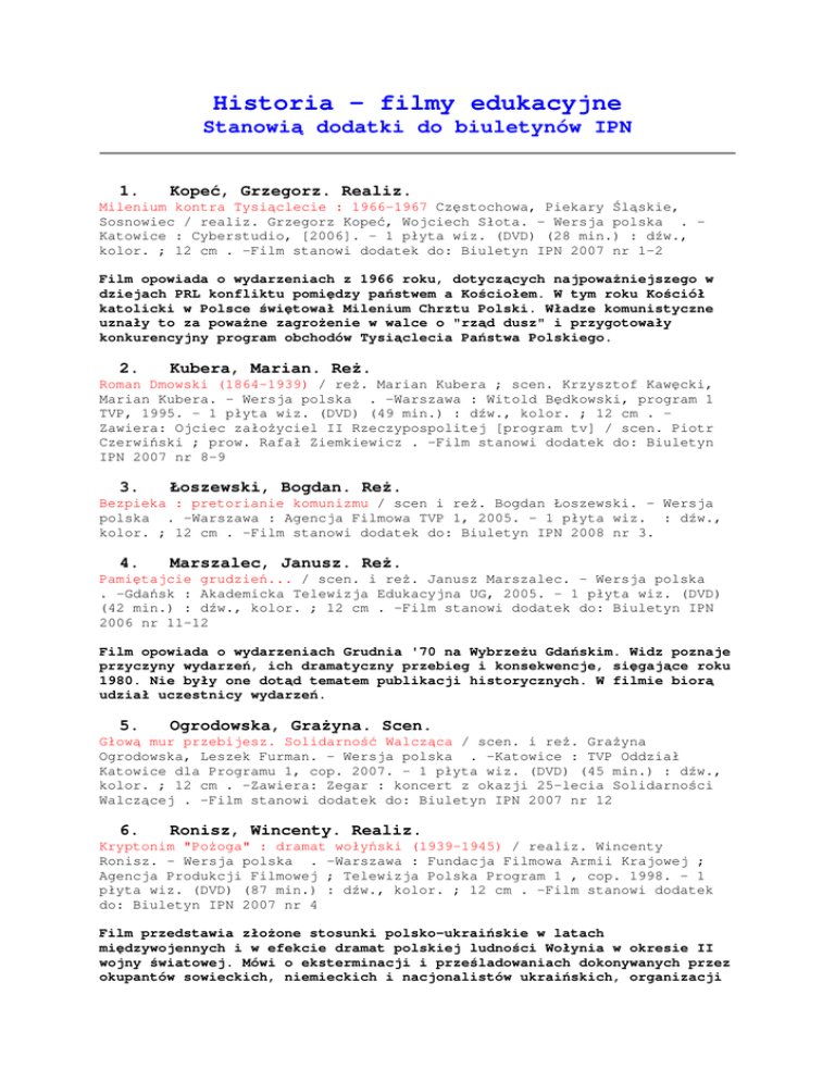 Historia - filmy edukacyjne Stanowi 1. dodatki do biuletynów IPN Kope , Grzegorz. Realiz. Milenium kontra Tysi clecie : 1966-1967 Cz stochowa, Piekary l skie, Sosnowiec / realiz. Grzegorz Kope , Wojciech Słota. - Wersja polska . Katowice : Cyberstudio, [2006]. - 1 płyta wiz. (DVD) (28 min.) : d w., kolor. ; 12 cm . -Film stanowi dodatek do: Biuletyn IPN 2007 nr 1-2 Film opowiada o wydarzeniach z 1966 roku, dotycz cych najpowa niejszego w dziejach PRL konfliktu pomi dzy pa stwem a Ko ciołem. W tym roku Ko ciół katolicki w Polsce wi tował Milenium Chrztu Polski. Władze komunistyczne uznały to za powa ne zagro enie w walce o "rz d dusz" i przygotowały konkurencyjny program obchodów Tysi clecia Pa stwa Polskiego. 2. Kubera, Marian. Re . Roman Dmowski (1864-1939) / re . Marian Kubera ; scen. Krzysztof Kaw cki, Marian Kubera. - Wersja polska . -Warszawa : Witold B dkowski, program 1 TVP, 1995. - 1 płyta wiz. (DVD) (49 min.) : d w., kolor. ; 12 cm . Zawiera: Ojciec zało yciel II Rzeczypospolitej [program tv] / scen. Piotr Czerwi ski ; prow. Rafał Ziemkiewicz . -Film stanowi dodatek do: Biuletyn IPN 2007 nr 8-9 3. Łoszewski, Bogdan. Re . Bezpieka : pretorianie komunizmu / scen i re . Bogdan Łoszewski. - Wersja polska . -Warszawa : Agencja Filmowa TVP 1, 2005. - 1 płyta wiz. : d w., kolor. ; 12 cm . -Film stanowi dodatek do: Biuletyn IPN 2008 nr 3. 4. Marszalec, Janusz. Re . Pami tajcie grudzie ... / scen. i re . Janusz Marszalec. - Wersja polska . -Gda sk : Akademicka Telewizja Edukacyjna UG, 2005. - 1 płyta wiz. (DVD) (42 min.) : d w., kolor. ; 12 cm . -Film stanowi dodatek do: Biuletyn IPN 2006 nr 11-12 Film opowiada o wydarzeniach Grudnia '70 na Wybrze u Gda skim. Widz poznaje przyczyny wydarze , ich dramatyczny przebieg i konsekwencje, si gaj ce roku 1980. Nie były one dot d tematem publikacji historycznych. W filmie bior udział uczestnicy wydarze . 5. Ogrodowska, Gra yna. Scen. Głow mur przebijesz. Solidarno Walcz ca / scen. i re . Gra yna Ogrodowska, Leszek Furman. - Wersja polska . -Katowice : TVP Oddział Katowice dla Programu 1, cop. 2007. - 1 płyta wiz. (DVD) (45 min.) : d w., kolor. ; 12 cm . -Zawiera: Zegar : koncert z okazji 25-lecia Solidarno ci Walcz cej . -Film stanowi dodatek do: Biuletyn IPN 2007 nr 12 6. Ronisz, Wincenty. Realiz. Kryptonim "Po oga" : dramat woły ski (1939-1945) / realiz. Wincenty Ronisz. - Wersja polska . -Warszawa : Fundacja Filmowa Armii Krajowej ; Agencja Produkcji Filmowej ; Telewizja Polska Program 1 , cop. 1998. - 1 płyta wiz. (DVD) (87 min.) : d w., kolor. ; 12 cm . -Film stanowi dodatek do: Biuletyn IPN 2007 nr 4 Film przedstawia zło one stosunki polsko-ukrai skie w latach mi dzywojennych i w efekcie dramat polskiej ludno ci Wołynia w okresie II wojny wiatowej. Mówi o eksterminacji i prze ladowaniach dokonywanych przez okupantów sowieckich, niemieckich i nacjonalistów ukrai skich, organizacji polskiej samoobrony i walkach 27 Dywizji Piechoty Armii Krajowej najliczniejszej jednostki zbrojnej polskiego Pa stwa Podziemnego. 7. Ronisz, Wincenty. Realiz. ołnierze wykl ci ; Losy niepokornych / realiz. Wincenty Ronisz. - Wersja polska . -Warszawa : Fundacja Filmowa Armii Krajowej, 2005. - 1 płyta wiz. (DVD) (91 min.) : d w., kolor. ; 12 cm . -Zawiera: ołnierze wykl ci (57 min.) ; Losy niepokornych (34 min.) . -Film stanowi dodatek do: Biuletyn IPN 2008 nr 1-2 Film opowiada o losach tysi cy uczestników powojennego podziemia zbrojnego. Walczyli samotnie w lasach, bez nadziei na zwyci stwo, wierni ideałom wolnej i rz dzonej przez demokratycznie wybrane władze Polsce. Dopiero po blisko pół wieku historia przyznała racj tym ołnierzom wykl tym. 8. Sapija, Andrzej. Realiz. Polskie Pa stwo Podziemne (1939-1945) / realiz. Andrzej Sapija. - Wersja polska . -Warszawa : Fundacja Filmowa Armii Krajowej ; Agencja Produkcji Filmowej ; Telewizja Polska Program 2, cop. 2002. - 1 płyta wiz. (DVD) (62 min.) : d w., kolor. ; 12 cm . -Film stanowi dodatek do: Biuletyn IPN 2007 nr 5-6 Film jest pierwsz filmow relacj dokumentaln o kształtowaniu, losach i ludziach tworz cych struktury Polskiego Pa stwa Podziemnego. O tym, jak funkcjonował podziemny system ratowania ludzi i dóbr kultury, o wiata, opieka społeczna, s downictwo, administracja - o planach powojennej odbudowy i dramatycznych, tak e po wojnie, losach działaczy podziemia mówi współtwórcy PPP, uczestnicy wydarze oraz historycy z kraju Wielkiej Brytanii i Niemiec. 9. Widawski, Marek. Re . Kobiety i wojna / scen i re . Marek Widawski. - Wersja polska . -Warszawa : Fundacja Filmowa Armii Krajowej, 2005. - 1 płyta wiz. (DVD) (60 min.) : d w., kolor. ; 12 cm . -Film stanowi dodatek do: Biuletyn IPN 2007 nr 10-11 Film opowiada histori czternastu dziewcz t wchodz cych w dorosłe latach II wojny wiatowej. 10. ycie w Woldan, Paweł. Re . Karolina Lanckoro ska : portret damy / scen i re . Paweł Woldan. - Wersja polska . -Warszawa : Agencja Produkcji Filmowej TVP ; Pado Studio Film, cop. 2004. - 1 płyta wiz. (DVD) (50 min.) : d w., kolor.; 12 cm . -Film stanowi dodatek do: Biuletyn IPN 2007 nr 3