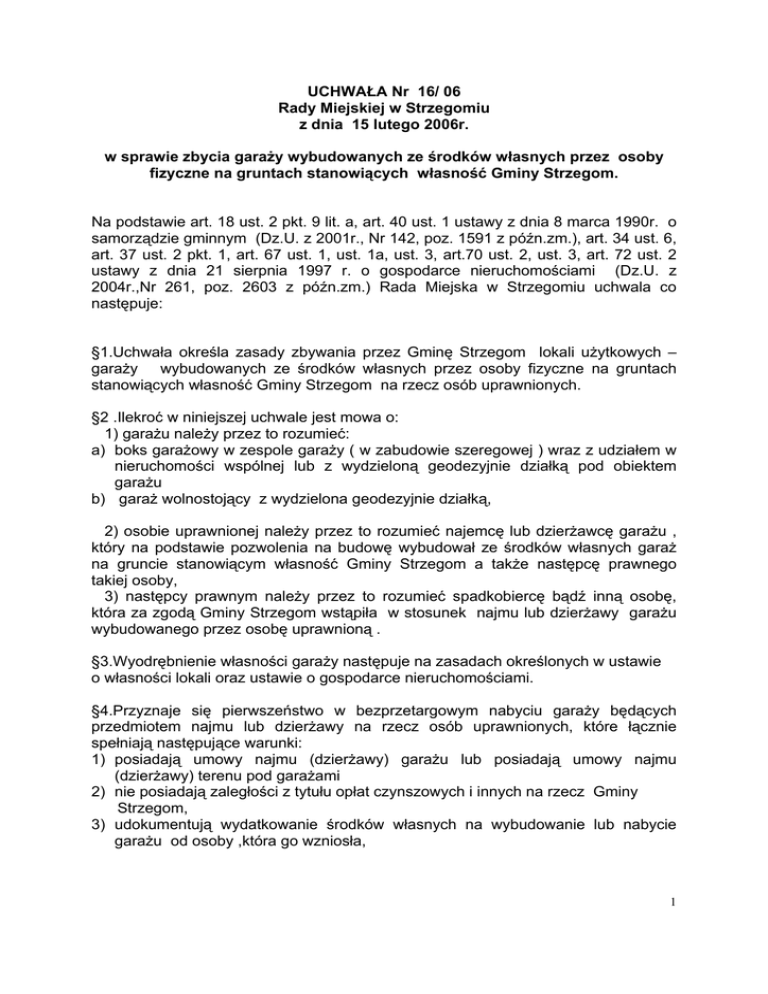UCHWAŁA Nr 16/ 06 Rady Miejskiej w Strzegomiu z dnia 15 lutego 2006r. w sprawie zbycia garaży wybudowanych ze środków własnych przez osoby fizyczne na gruntach stanowiących własność Gminy Strzegom. Na podstawie art. 18 ust. 2 pkt. 9 lit. a, art. 40 ust. 1 ustawy z dnia 8 marca 1990r. o samorządzie gminnym (Dz.U. z 2001r., Nr 142, poz. 1591 z późn.zm.), art. 34 ust. 6, art. 37 ust. 2 pkt. 1, art. 67 ust. 1, ust. 1a, ust. 3, art.70 ust. 2, ust. 3, art. 72 ust. 2 ustawy z dnia 21 sierpnia 1997 r. o gospodarce nieruchomościami (Dz.U. z 2004r.,Nr 261, poz. 2603 z późn.zm.) Rada Miejska w Strzegomiu uchwala co następuje: §1.Uchwała określa zasady zbywania przez Gminę Strzegom lokali użytkowych – garaży wybudowanych ze środków własnych przez osoby fizyczne na gruntach stanowiących własność Gminy Strzegom na rzecz osób uprawnionych. §2 .Ilekroć w niniejszej uchwale jest mowa o: 1) garażu należy przez to rozumieć: a) boks garażowy w zespole garaży ( w zabudowie szeregowej ) wraz z udziałem w nieruchomości wspólnej lub z wydzieloną geodezyjnie działką pod obiektem garażu b) garaż wolnostojący z wydzielona geodezyjnie działką, 2) osobie uprawnionej należy przez to rozumieć najemcę lub dzierżawcę garażu , który na podstawie pozwolenia na budowę wybudował ze środków własnych garaż na gruncie stanowiącym własność Gminy Strzegom a także następcę prawnego takiej osoby, 3) następcy prawnym należy przez to rozumieć spadkobiercę bądź inną osobę, która za zgodą Gminy Strzegom wstąpiła w stosunek najmu lub dzierżawy garażu wybudowanego przez osobę uprawnioną . §3.Wyodrębnienie własności garaży następuje na zasadach określonych w ustawie o własności lokali oraz ustawie o gospodarce nieruchomościami. §4.Przyznaje się pierwszeństwo w bezprzetargowym nabyciu garaży będących przedmiotem najmu lub dzierżawy na rzecz osób uprawnionych, które łącznie spełniają następujące warunki: 1) posiadają umowy najmu (dzierżawy) garażu lub posiadają umowy najmu (dzierżawy) terenu pod garażami 2) nie posiadają zaległości z tytułu opłat czynszowych i innych na rzecz Gminy Strzegom, 3) udokumentują wydatkowanie środków własnych na wybudowanie lub nabycie garażu od osoby ,która go wzniosła, 1 4) przedstawią niezbędne dokumenty wynikające z przepisów ustawy Prawo budowlane potwierdzające uzyskanie pozwolenia na budowę lub zgodę na jego użytkowanie. Za udokumentowany fakt wybudowania garażu na podstawie pozwolenia na budowę uznaje się także sytuację ,w której pozwolenie na budowę zostało wydane dla zarządców nieruchomości, na której wzniesiono garaż a także przedstawienie pozwoleń na budowę wydanych dla poprzedników prawnych najemcy lub dzierżawcy. §5.Burmistrz Strzegomia może odmówić zbycia garażu ze względu na jego stan techniczny jak również gdy jego zbycie będzie sprzeczne z zamierzeniami inwestycyjnymi Gminy Strzegom lub ustaleniami miejscowego planu zagospodarowania. §6.1. Zbycie garażu następuje na wniosek osoby uprawnionej wraz udziałem w nieruchomości wspólnej lub z wydzieloną geodezyjnie działką pod garażem. 2. Zbycie garażu następuje za cenę ustaloną na podstawie wartości określonej przez rzeczoznawcę majątkowego na zasadach i w trybie określonym w ustawie o gospodarce nieruchomościami z zaliczeniem na poczet ceny sprzedaży nakładów poniesionych na budowę garażu. Oprócz ceny sprzedaży nabywca pokrywa koszty poniesione przez gminę na przygotowanie nieruchomości do sprzedaży oraz koszty związane z przeniesieniem prawa własności. 3. Przy sprzedaży garażu wraz z oddaniem w użytkowanie lub współużytkowanie wieczyste gruntu ustala się pierwszą opłatę w wysokości 25 % ceny gruntu. Wysokość opłaty rocznej ustala się w wysokości 3% ceny gruntu. 4. Przy sprzedaży garażu wraz z własnością gruntu cena gruntu, na wniosek nabywcy może być rozłożona na raty roczne płatne przez okres nie dłuższy niż 2 lata. 5. Pierwsza rata płatna jest przed zawarciem umowy notarialnej i nie może być niższa niż 50 % ustalonej ceny sprzedaży. 6.Rozłożona na raty nie spłacona część ceny podlega oprocentowaniu przy zastosowaniu stopy procentowej równej stopie redyskonta weksli stosowanej przez Narodowy Bank Polski. 7. Raty roczne wraz z oprocentowaniem płatne są z góry za dany rok w terminie do dnia 31 marca każdego roku. Oprocentowanie liczone będzie od pozostałej do zapłaty ceny sprzedaży . 8. Wierzytelność Gminy z tytułu rozłożenia na raty ceny nieruchomości podlega zabezpieczeniu poprzez ustanowienie hipoteki na nieruchomości. §7.1.Rozpoczęcie czynności związanych z przygotowaniem garażu do sprzedaży uzależnione jest od wpłaty zaliczki ,której wysokość określa Burmistrz. Zaliczka zostaje zaliczona na poczet ceny w części, jaka pozostanie po pokryciu poniesionych kosztów przygotowania tej nieruchomości do sprzedaży. W przypadku rezygnacji wnioskodawcy z nabycia garażu ,zaliczka podlega zwrotowi w części , jaka pozostanie po pokryciu poniesionych kosztów przygotowania nieruchomości do sprzedaży. 2.Dopuszcza się możliwość ,w porozumieniu z Wydziałem Gospodarki Nieruchomościami i Planowania Przestrzennego ,zlecenie indywidualnie przez wnioskodawcę wyceny gruntu ,garażu oraz poniesionych nakładów uprawnionemu 2 rzeczoznawcy majątkowemu oraz opracowanie podziału geodezyjnego geodecie uprawnionemu. §8.Wykonanie uchwały powierza się Burmistrzowi Strzegomia . §9.Uchwała wchodzi w życie po upływie 14 dni od dnia ogłoszenia w Dzienniku Urzędowym Województwa Dolnośląskiego. PRZEWODNICZĄCY RADY MIEJSKIEJ W STRZEGOMIU Stanisław SITARZ 3 UZASADNIENIE do Uchwały Nr 16 /2006 Rady Miejskiej w Strzegomiu z dnia 15 lutego 2006r. w sprawie w sprawie zbycia garaży wybudowanych ze środków własnych przez osoby fizyczne na gruntach stanowiących własnością Gminy Strzegom. D