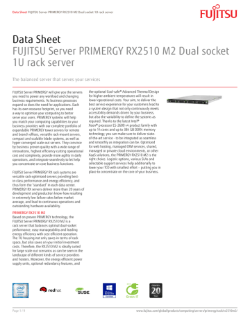 Data Sheet FUJITSU Server PRIMERGY RX2510 M2 Dual socket 1U rack server Data Sheet FUJITSU Server PRIMERGY RX2510 M2 Dual socket 1U rack server The balanced server that serves your services the optional Cool-safe® Advanced Thermal Design for higher ambient temperatures will result in lower operational costs. Your aim, to deliver the best service experience for your customers lead to a system design that not only continuously meets accessibility demands driven by your business, but also the variability to define the systems as required. Thanks to the latest Intel® Xeon® processor E5-2600 v4 product family with up to 14 cores and up to 384 GB DDR4 memory technology, you can make sure to deliver stateof-the-art service - to be integrated as seamless and smoothly as integration can be. Optimized for web hosting, managed CRM services, shared, managed or private cloud environments, or other XaaS solutions, the PRIMERGY RX2510 M2 is the right choice. Logistic options, various SLAs and selectable support services help additionally to lower your TCO with smallest effort – putting you in place to concentrate on the core of your business. FUJITSU Server PRIMERGY will give you the servers you need to power any workload and changing business requirements. As business processes expand so does the need for applications. Each has its own resource footprint, so you need a way to optimize your computing to better serve your users. PRIMERGY systems will help you match your computing capabilities to your business priorities with our complete portfolio of expandable PRIMERGY tower servers for remote and branch offices, versatile rack-mount servers, compact and scalable blade systems, as well as hyper-converged scale-out servers. They convince by business proven quality with a wide range of innovations, highest efficiency cutting operational cost and complexity, provide more agility in daily operations, and integrate seamlessly to let help you concentrate on core business functions. FUJITSU Server PRIMERGY RX rack systems are versatile rack-optimized servers providing bestin-class performance and energy efficiency, and thus form the “standard” in each data center. PRIMERGY RX servers deliver more than 20 years of development and production know-how resulting in extremely low failure rates below market average, and lead to continuous operations and outstanding hardware availability. PRIMERGY RX2510 M2 Based on proven PRIMERGY technology, the FUJITSU Server PRIMERGY RX2510 M2 is a rack server that balances optimal dual-socket performance, easy manageability and leading energy efficiency with cost-efficient operation. The 1U housing not only saves in terms of rack space, but also saves on your initial investment costs. Therefore, the RX2510 M2 is ideally suited for large scale-out scenarios as can be seen in the landscape of different kinds of service providers and hosters. Moreover, the energy efficient power supply units, optional redundancy features, and Page 1 / 9 www.fujitsu.com/global/products/computing/servers/primergy/rack/rx2510m2/ Data Sheet FUJITSU Server PRIMERGY RX2510 M2 Dual socket 1U rack server Features & Benefits Main Features Benefits Performance for any service Intel® Xeon® E5-2600 v4 product family with up to 14 cores Up to 384 GB DDR4 memory (12 DIMM slots) Choice of LFF or SFF HDDs and for improvements in different areas of hosted services 3x PCIe Gen3 slots for expandability slots Optimized Energy Effciency Fujitsu’s optional Cool-safe® Advanced Thermal Design for higher ambient temperatures in the data center Power supply units with up to 94% energy efficiency Higher ambient temperatures lead to lower costs for cooling the data center Efficient power supplies save energy costs. Optional redundancy makes it easy to maintain the running system and ensure an incomparable uptime No matter what management software you use: The RX2510 M2 is ready for all thanks to open standards The comprehensive tools of the Fujitsu ServerView Suite eases the administrators life even more Updates are very important in a fast-paced world, especially considering cyber crime For cost efficient and basic RAID requirements, support for the most common configurations is conveniently embedded on the system board and does not require a dedicated controller This offering is a clever option that easily helps to save costs, streamline purchasing and installation processes while maintaining sustainable eco-friendly targets in the suplpy chain Easy management and smooth integration IPMI 2.0 interface for monitoring and management within your existing infrastructure Additionally Fujitsu ServerView Suite including tools for installation and deployment, permanent status monitoring and control BIOS, firmware and selected software are updated free of charge Simplify your daily operations embedded RAID Controller Ease of supply thanks to clever logistics: Bulk packaging Ready for the future and data growth scenarios with the performance of two processors – marking the standard of tomorrow with an increase in computing power DDR4 memory enables for higher bandwidth and lower consumption. The right choice for any application. Sufficiently dimensioned space resources and expandability for enough headroom in distributed systems or scale-out approaches Shared components The family system design allows for synergy effects from all other PRIMERGY systems. Page 2 / 9 Our proven quality, efficiency and agility is taken to another level specialized for your demands www.fujitsu.com/global/products/computing/servers/primergy/rack/rx2510m2/ Data Sheet FUJITSU Server PRIMERGY RX2510 M2 Dual socket 1U rack server Technical details PRIMERGY RX2510 M2 Base unit Housing types Storage drive architecture Power supply Product Type PRIMERGY RX2510 M2 Rack 4 HDD Hot-plug Dual Socket Rack Server Mainboard Mainboard type Chipset Processor quantity and type D3279-H Intel® C612 1 - 2 x Intel® Xeon® processor E5-2600 v4 product family I