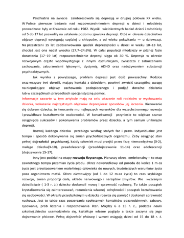 Psychiatria na świecie zainteresowała się depresją w drugiej połowie XX wieku. W Polsce pierwsze badania nad rozpowszechnieniem depresji u dzieci i młodzieży prowadzone były w Krakowie od roku 1982. Wyniki wielokrotnych badań dzieci i młodzieży od 5 do 17 lat pozwoliły na ustalenie poziomu zjawiska depresji. Otóż w okresie dzieciństwa objawy depresji występują częściej u chłopców, a od wieku pokwitania — u dziewcząt. Na przestrzeni 15 lat zaobserwowano spadek depresyjności u dzieci w wieku 10–13 lat, chociaż jest ona nadal wysoka (27,7–24,6%). W całej populacji młodzieży w późnej fazie dorastania (17–19 lat) rozpowszechnienie depresji sięga ok 30 %. Depresja w okresie rozwojowym często współwystępuje z innymi dysfunkcjami, zwłaszcza z zaburzeniami zachowania, zaburzeniami lękowymi, dystymią, ADHD oraz nadużywaniem substancji psychoaktywnych. Jak wynika z powyższego, problem depresji jest dość powszechny. Rodzice oraz wszyscy inni dorośli, mający kontakt z dzieckiem, powinni zwrócić szczególną uwagę na niepokojące objawy zachowania podopiecznego i podjąć doraźne działania lub w szczególnych przypadkach specjalistyczną pomoc. Informacje zawarte w tym artykule mają na celu ukazanie roli rodziców w wychowaniu dziecka, wskazanie najczęstszych objawów depresjioraz sposobów jej leczenia. Kierowanie się dobrem dziecka, to tworzenie mu najlepszych warunków dla wszechstronnego rozwoju i prawidłowe kształtowanie osobowości. W konsekwencji przyniesie to większe szanse osiągnięcia sukcesów i pokonywania problemów przez dziecko, a tym samym uniknięcie depresji. Rozwój każdego dziecka przebiega według stałych faz i praw. Indywidualne jest tempo i sposób dokonywania się zmian psychofizycznych organizmu. Żeby osiągnąć stan pełnej dojrzałości psychicznej, każdy człowiek musi przejść przez fazę niemowlęctwa (0-2), małego dziecka(3-10), preadolescencji (przeddojrzewanie 11-14) oraz adolescencji (dojrzewanie 15-17). Inny jest podział na etapy rozwoju fizycznego. Pierwszy okres- embrionalny – to etap zawrotnego tempa przemian życia płodu. Okres noworodkowy od porodu do końca 1 m-ca życia jest przystosowaniem maleńkiego człowieka do nowych, trudniejszych warunków życia poza organizmem matki. Okres niemowlęcy (od 1 do 12 m-ca życia) to czas szybkiego rozwoju, zmian proporcji ciała, układu nerwowego i narządów zmysłów. We wczesnym dzieciństwie ( 1-3 r. ż.) dziecko doskonali mowę i sprawność ruchową. To także początek krystalizowania się zainteresowań, rozumienia własnej odrębności i początek kształtowania się osobowości. W okresie przedszkolnym u dziecka rozwija się pamięć i doskonali sprawność ruchowa. Jest to także czas poszerzania społecznych kontaktów pozarodzinnych, zabawy, rysowania, prób liczenia i rozpoznawania liter. Między 6 a 15 r. ż., podczas nauki szkolnej,dziecko usamodzielnia się, kształtuje własne poglądy a także zaczyna się jego dojrzewanie płciowe. Pełną dojrzałość płciową i wzrost osiągają dzieci od 15 do 18 r. ż. Ustalają się proporcje ciała, wysokość, a w sferze psychicznej następuje stabilizacja umysłowa, emocjonalna i charakterologiczna. Jak widać z powyższego opisu, przemiany dziecka następują powoli i etapowo. Wszystko podlega stopniowaniu trudności według możliwości organizmu. Rodzina jest pierwszym i podstawowym środowiskiem opieki i wychowania potomstwa. Bardzo istotne jest więc to, jakie bodźce dostarczą rodzice swojemu wychowankowi w każdym momencie jego rozwoju. Badania dowodzą, że głównym warunkiem prawidłowego dojrzewania człowieka, zdobycia umiejętności prospołecznych i osiągnięcia sukcesów jest wzrost w klimacie bezpieczeństwa, mądrej miłości oraz akceptacji. Rodzice od pierwszych dni po narodzinach noworodka powinni przyjąć wobec swojego dziecka postawę wnikliwej obserwacji, czułości i otwartości. Zaspokojenie podstawowych potrzeb, wynikających z naturalnego rozwoju wychowanka, warunkuje właściwy jego dalszy rozwój emocjonalny i intelektualny. Przygotowuje do życia w społeczeństwie – uczy zasad zachowania, prawidłowych relacji z ludźmi, radzenia sobie w trudnych sytuacjach i pracy nad swoim rozwojem. Przytulanie, mówienie do noworodka, kontakt przy karmieniu, odpowiednia higiena, odpowiadanie na męczące pytania malucha „dlaczego?”- to tylko niektóre warunki stworzenia małej istocie poczucia bezpieczeństwa i akceptacji, które zaprocentują w przyszłości. Zaburzenia w środowisku rodziny dziecka przekładają się na zaburzenia w zachowaniu oraz w rozwoju emocjonalnym i intelektualnym. Kolejne lata właściwego kierowania rozwojem dziecka i stosowanie odpowiedniego stylu wychowania dają gwarancję uniknięcia późniejszych problemów wychowawczych. Styl wychowania, który realizują rodzice w stosunku do swojego dziecka, jest efektem ich własnych życiowych doświadczeń, charakteru, obserwacji, zdobytej wiedzy oraz systemu wyznawanych wartości. Jednym z podstawowych i jednocześnie najtrudniejszych zadań wychowawczych jest stawianie dziecku granic, czyli jasne określanie i egzekwowanie nakazów, zakazów, obowiązków i przywilejów. Atmosfera, w której dziecko wzrasta kształtuje jego osobowość, przekłada się na relacje z otoczeniem i warunkuje osiągnięcia. Istnieją dwa patologiczne rodzaje relacji z rodzicami skrajne wobec siebie, które decydują o wystąpieniu problemów wychowawczych. Pierwszy, to zbyt aktywne zaangażowanie i kontrolowanie dziecka pod każdym względem skutkuje odsunięciem się dziecka od rodziców. Dziecko szuka wtedy miejsca dla siebie i chce dokonywać własnych wyborów. Drugi, to brak zaangażowania w życie dziecka, jego relacje z kolegami czy nawet postępy w szkole. Dziecko czuje się wtedy osamotnione i szuka instynktownie wzorców, które mogą okazać się w konsekwencji nieodpowiednie. Obecnie dużą uwa