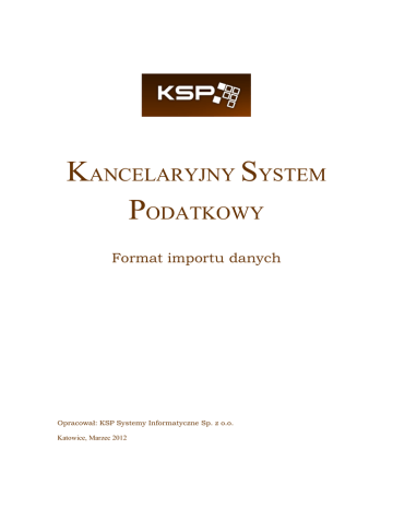 KANCELARYJNY SYSTEM PODATKOWY Format importu danych Opracował: KSP Systemy Informatyczne Sp. z o.o. Katowice, Marzec 2012 SPIS TREŚCI 1 Informacje ogólne. .............................................................................................................................................. 4 2 Obiekty .............................................................................................................................................................. 5 2.1 Kontrahent .................................................................................................................................................... 5 2.2 Rachunek ...................................................................................................................................................... 6 2.3 Pracownik ..................................................................................................................................................... 7 2.4 Kasa .............................................................................................................................................................. 7 2.5 Pojazd ........................................................................................................................................................... 7 3 Dokumenty ......................................................................................................................................................... 9 3.1 Dokumenty zakupu ..................................................................................................................................... 11 3.1.1 Dokument zakupu ............................................................................................................................ 11 3.1.2 Korekta dokumentu zakupu ............................................................................................................. 11 3.1.3 Prosty dokument zakupu .................................................................................................................. 11 3.1.4 Faktura zakupu pojazdu ................................................................................................................... 11 3.1.5 Faktura zakupu materiałów eksploatacyjnych dla pojazdu ............................................................. 12 3.4.5 Faktura leasingu dla pojazdu ........................................................................................................... 12 3.2 Dokumenty sprzedaży ................................................................................................................................ 13 3.2.1 Dokument sprzedaży ....................................................................................................................... 13 3.2.2 Dokument sprzedaży WDT .............................................................................................................. 13 3.2.3 Korekta dokumentu sprzedaży ......................................................................................................... 14 3.2.4 Dokument sprzedaży detalicznej ..................................................................................................... 14 3.2.5 Prosty dokument sprzedaży ............................................................................................................. 14 3.3 Dokumenty kasowo – bankowe .................................................................................................................. 14 3.3.1 Raport kasowy ................................................................................................................................. 14 3.3.2 Wyciąg bankowy ............................................................................................................................. 15 3.3.3 Wyciąg bankowy skrócony .............................................................................................................. 15 3.4 Dokumenty pozostałe ................................................................................................................................. 15 3.4.1 Spis z natury .................................................................................................................................... 15 3.4.2 Dokument wewnętrzny .................................................................................................................... 15 3.4.3 Dokument wynagrodzenia – skrócony............................................................................................. 16 4 Dodatek – Identyfikator kraju ......................................................................................................................... 17 1 Informacje ogólne. Import podzielony jest na dwa etapy. W pierwszym etapie importowane są obiekty występujące w dokumentach (kontrahenci, rachunki bankowe, pracownicy, kasy, pojazdy), a w drugim dokumenty. Obiekty występują między znacznikami <OBJECTS></OBJECTS>. Możliwe typy obiektów: <CONTRACTORS></CONTRACTORS> - kontrahenci <ACCOUNTS></ACCOUNTS> - rachunki bankowe <EMPLOYEES></EMPLOYEES> - pracownicy <CASH_DESKS></CASH_DESKS> - kasy <VEHICLES></VEHICLES> - pojazdy Dokumenty w zależności od typu dokumentu występują między znacznikami: <DOCUMENTS_PURCHASE></DOCUMENTS_PURCHASE> - dokumenty z grupy zakupy <DOCUMENTS_SALE></DOCUMENTS_SALE> - dokumenty z grupy sprzedaży <DOCUMENTS_CASH></DOCUMENTS_CASH> - dokumenty z grupy kasowe i bankowe <DOCUMENTS_MAIL></DOCUMENTS_MAIL> - dokumenty z grupy korespondencja i poczta <DOCUMENTS_OTHER></DOCUMENTS_OTHER> - dokumenty z grupy inne <DOCUMENTS_NOTSUPPORT></DOCUMENTS_NOTSUPPORT> - dokumenty nieobsługiwane Określenie niewymagany używane w tym dokumencie oznacza, że dany znacznik nie musi pojawić się w pliku eksportu. Separator dziesiętny w kwotach: przecinek Format daty: RRRR–MM–DD lub RRRR–MM–DD hh:mm:ss W sekcji <IMPORT firm_nip = ”” department_nip = ”” xml_