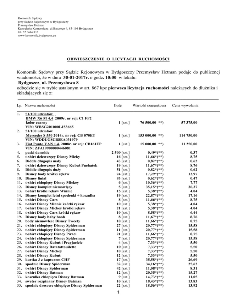 Komornik Sądowy przy Sądzie Rejonowym w Bydgoszczy Przemysław Hetman Kancelaria Komornicza ul.Batorego 4, 85-104 Bydgoszcz tel. 52 3667333 www.komornik.bydgoszcz.eu OBWIESZCZENIE O LICYTACJI RUCHOMOŚCI Komornik Sądowy przy Sądzie Rejonowym w Bydgoszczy Przemysław Hetman podaje do publicznej wiadomości, że w dniu 30-01-2017r. o godz. 10:00 w lokalu: Bydgoszcz, ul. Przemysłowa 8 odbędzie się w trybie ustalonym w art. 867 kpc pierwsza licytacja ruchomości należących do dłużnika i składających się z: ____________________________________________________________________________________________________ Lp. Nazwa ruchomości Ilość Wartość szacunkowa Cena wywołania _____________________________________________________________________________________________________ 1. 51/100 udziałów BMW X6 M 4,4 2009r. nr rej: C1 FF2 kolor czarny 1 [szt.] 76 500,00 **) 57 375,00 VIN: WBSG201000LJ53665 2. 51/100 udziałów Mercedes S 550 2014r. nr rej: CB 070ET 1 [szt.] 153 000,00 **) 114 750,00 VIN: WDDUG8CB8EA031979 3. Fiat Punto VAN 1.4, 2008r. nr rej: CB161EP 1 [szt.] 15 000,00 **) 11 250,00 VIN: ZFA19900000446081 4. paski damskie 2 500 [szt.] 0,49*)**) 0,37 5. t-shirt dziewczęcy Disney Micky 16 [szt.] 11,66*)**) 8,75 6. Diddle długopis mały 43 [szt.] 0,82*)**) 0,62 7. t-shirt dziewczęcy Disney Kubuś Puchatek 19 [szt.] 11,67*)**) 8,76 8. Diddle długopis duży 51 [szt.] 0,82*)**) 0,62 9. Disney body krótki rękaw 24 [szt.] 17,29*)**) 12,97 10. Disney liniał 93 [szt.] 0,62*)**) 0,47 11. t-shirt chłopięcy Disney Mickey 6 [szt.] 10,36*)**) 7,77 12. Disney komplet niemowlęcy 5 [szt.] 35,15*)**) 26,37 13. t-shirt krótki rękaw Winnie 15 [szt.] 5,38*)**) 4,04 14. Disney komplet letni spodenki + koszulka 19 [szt.] 22,87*)**) 17,16 15. t-shirt Disney Cars 8 [szt.] 11,66*)**) 8,75 16. t-shirt Disney Minnie krótki rękaw 10 [szt.] 5,38*)**) 4,04 17. t-shirt Disney Mickey krótki rękaw 21 [szt.] 5,38*)**) 4,04 18. t-shirt Disney Cars krótki rękaw 10 [szt.] 8,58*)**) 6,44 19. Disney body baby boob 8 [szt.] 11,67*)**) 8,76 20. body niemowlęce Disney Tweety 10 [szt.] 11,66*)**) 8,75 21. t-shirt chłopięcy Disney Spiderman 27 [szt.] 20,77*)**) 15,58 22. t-shirt chłopięcy Disney Spiderman 11 [szt.] 20,77*)**) 15,58 23. t-shirt chłopięcy Disney Piraci 21 [szt.] 11,66*)**) 8,75 24. t-shirt chłopięcy Disney Spiderman 7 [szt.] 20,77*)**) 15,58 25. t-shirt Disney Kubuś i Przyjaciele 4 [szt.] 7,33*)**) 5,50 26. t-shirt Disney Ratatattouilette 10 [szt.] 7,33*)**) 5,50 27. t-shirt Disney Mickey 10 [szt.] 7,33*)**) 5,50 28. t-shirt Disney Kubuś 12 [szt.] 7,33*)**) 5,50 29. kurtka J z kapturem CHF 17 [szt.] 35,58*)**) 26,69 30. spodnie Disney Spiderman 32 [szt.] 34,16*)**) 25,62 31. t-shirt Disney Spiderman 42 [szt.] 11,08*)**) 8,31 32. t-shirt Disney Batman 12 [szt.] 20,35*)**) 15,27 33. koszulka chłopięca Disney Batman 9 [szt.] 14,73*)**) 11,05 34. sweter rozpinany Disney Batman 10 [szt.] 18,43*)**) 13,83 35. spodnie dresowe chłopięce Disney Spiderman 22 [szt.] 18,56*)**) 13,92 1 36. 37. 38. 39. 40. 41. 42. 43. 44. 45. 46. 47. 48. 49. 50. 51. 52. 53. 54. 55. 56. 57. 58. 59. 60. 61. 62. 63. 64. 65. 66. 67. 68. 69. 70. 71. 72. 73. 74. 75. 76. 77. 78. 79. 80. 81. 82. 83. 84. 85. 86. 87. 88. 89. 90. 91. 92. 93. 94. 95. 96. 97. 98. t-shirt chłopięcy Disney Cars dres dziewczęcy Disney Charlotte t-shirt dziewczęcy Disney Mickey t-shirt dziecięcy Disney Mickey t-shirt dziewczęcy Disney Mickey t-shirt dziewczęcy Disney Barbie t-shirt dziewczęcy Disney Kubuś i Przyjac. t-shirt dziewczęcy Disney Kubuś i Przyjac. t-shirt krótki rękaw Disney Snoopy t-shirt dziewczęcy Tweety t-shirt dziewczęcy Disney Princess t-shirt dziewczęcy Disney Elfy sweter dziewczęcy Disney Charlotte t-shirt krótki rękaw Disney Miffy t-shirt chłopięcy Disney Kubuś Puchatek sweter rozpinany dziewczęcy Disney Winx spodnie dresowe dziewczęce Disney Miffy kurtka chłopięca Disney MIC koszula chłopięca Disney Mickey t-shirt chłopięcy Disney Simson koszulka na ramiączkach Disney Spiderman koszulka+spodenki Disney Spiderman junior golf dziewczęcy Disney Tweety t-shirt dziewczęcy Disney Tweety t-shirt dziewczęcy Disney Tweety kurtka dziewczęca Disney Kubuś spodnie jeans Disney Junior t-shirt chłopięcy Disney Cars t-shirt Disney Hannah Montana t-shirt krótki rękaw Disney Cars new t-shirt krótki rękaw Disney Cars t-shirt Disney Hannah Montana t-shirt Disney Hannah Montana dres dziewczęcy Disney Hannah Montana sweter chłopięcy rozpinany Disney Cars t-shirt chłopięcy Disney Myszka Mickey t-shirt Disney Tom & Jerry spodnie chłopięce Disney Tom & Jerry t-shirt chłopięcy Disney Tygrysek dres chłopięcy Disney Cars t-shirt krótki rękaw Disney Age De Gla t-shirt chłopięcy Disney Superman spodnie chłopięce Disney Superman t-shirt krótki rękaw Disney Age De Gla t-shirt chłopięcy Disney Cars t-shirt krótki rękaw Disney Age De Gla spodnie chłopięce Disney Myszka Mickey dres chłopięcy Disney Kubuś Puchatek sweter chłopięcy Disney Spiderman spodnie chłopięce Disney Spiderman t-shirt krótki rękaw Disney Princess t-shirt dziewczęcy Disney Kubuś Puchatek spodnie nieprzemakalne Disney Kubuś Puch. dres chłopięcy Disney Madagaskar t-shirt dziewczęcy rękaw-kwiatki dres chłopiecy Disney Monsters spodnie dziew. nieprzemakalne Disney Mickey t-shirt chłopięcy Disney Transformers t-shirt chłopięcy Disney Transformers t-shirt chłopięcy Disney Transformers t-shirt dziewczecy Tweety Disney t-shirt chłopięcy Disney Tom& Jerry t-shirt chłopi ecy Dsney Mickey 1 [szt.] 9 [szt.] 2 [szt.] 6 [szt.] 2 [szt.] 15 [szt.] 30 [szt.] 6 [szt.] 28 [szt.] 26 [szt.] 2 [szt.] 1 [szt.] 5 [szt.] 36 [szt.] 28 [szt.] 10 [szt.] 11 [szt.] 3 [szt.] 22 [szt.] 9 [szt.] 11 [szt.] 26 [szt.] 14 [szt.] 21 [szt.] 21 [szt.] 14 [szt.] 24 [szt.] 25 [szt.] 27 [szt.] 1 [szt.] 2 [szt.] 29 [szt.] 29 [szt.] 12 [szt.] 2 [szt.] 22 [szt.] 1 [szt.] 3 [szt.] 1 [szt.] 2 [szt.] 31 [szt.] 4 [szt.] 9 [szt.] 22 [szt