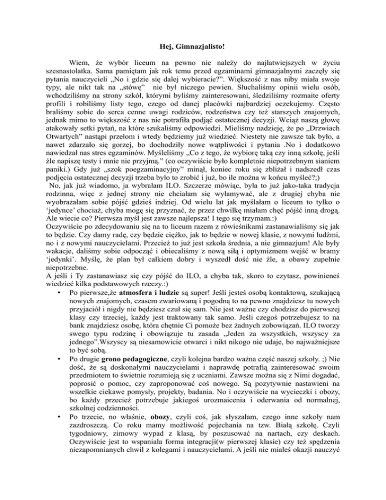 Hej, Gimnazjalisto! Wiem, że wybór liceum na pewno nie należy do najłatwiejszych w życiu szesnastolatka. Sama pamiętam jak rok temu przed egzaminami gimnazjalnymi zaczęły się pytania nauczycieli „No i gdzie się dalej wybieracie?”. Większość z nas niby miała swoje typy, ale nikt tak na „stówę” nie był niczego pewien. Słuchaliśmy opinii wielu osób, wchodziliśmy na strony szkół, którymi byliśmy zainteresowani, śledziliśmy rozmaite oferty profili i robiliśmy listy tego, czego od danej placówki najbardziej oczekujemy. Często braliśmy sobie do serca cenne uwagi rodziców, rodzeństwa czy też starszych znajomych, jednak mimo to większość z nas nie potrafiła podjąć ostatecznej decyzji. Wciąż naszą głowę atakowały setki pytań, na które szukaliśmy odpowiedzi. Mieliśmy nadzieję, że po „Drzwiach Otwartych” nastąpi przełom i wtedy będziemy już wiedzieć. Niestety nie zawsze tak było, a nawet zdarzało się gorzej, bo dochodziły nowe wątpliwości i pytania .No i dodatkowo nawiedzał nas stres egzaminów. Myśleliśmy „Co z tego, że wybiorę taką czy inną szkołę, jeśli źle napiszę testy i mnie nie przyjmą.” (co oczywiście było kompletnie niepotrzebnym sianiem paniki.) Gdy już „szok poegzaminacyjny” minął, koniec roku się zbliżał i nadszedł czas podjęcia ostatecznej decyzji trzeba było to zrobić i już, bo ile można w końcu myśleć?;) No, jak już wiadomo, ja wybrałam ILO. Szczerze mówiąc, była to już jako-taka tradycja rodzinna, więc z jednej strony nie chciałam się wyłamywać, ale z drugiej chyba nie wyobrażałam sobie pójść gdzieś indziej. Od wielu lat jak myślałam o liceum to tylko o ‘jedynce’ chociaż, chyba mogę się przyznać, że przez chwilkę miałam chęć pójść inną drogą. Ale wiecie co? Pierwsza myśl jest zawsze najlepsza! I tego się trzymam.:) Oczywiście po zdecydowaniu się na to liceum razem z rówieśnikami zastanawialiśmy się jak to będzie. Czy damy radę, czy będzie ciężko, jak to będzie w nowej klasie, z nowymi ludźmi, no i z nowymi nauczycielami. Przecież to już jest szkoła średnia, a nie gimnazjum! Ale były wakacje, daliśmy sobie odpocząć i obiecaliśmy z nową siłą i optymizmem wejść w bramy ‘jedynki’. Myślę, że plan był całkiem dobry i wyszedł dość nie źle, a obawy zupełnie niepotrzebne. A jeśli i Ty zastanawiasz się czy pójść do ILO, a chyba tak, skoro to czytasz, powinieneś wiedzieć kilka podstawowych rzeczy.:) • Po pierwsze,że atmosfera i ludzie są super! Jeśli jesteś osobą kontaktową, szukającą nowych znajomych, czasem zwariowaną i pogodną to na pewno znajdziesz tu nowych przyjaciół i nigdy nie będziesz czuł się sam. Nie jest ważne czy chodzisz do pierwszej klasy czy trzeciej, każdy jest traktowany tak samo. Jeśli czegoś potrzebujesz to na bank znajdziesz osobę, która chętnie Ci pomoże bez żadnych zobowiązań. ILO tworzy swego typu rodzinę i obowiązuje tu zasada „Jeden za wszystkich, wszyscy za jednego”.Wszyscy są niesamowicie otwarci i nikt nikogo nie udaje, bo najważniejsze to być sobą. • Po drugie grono pedagogiczne, czyli kolejna bardzo ważna część naszej szkoły. ;) Nie dość, że są doskonałymi nauczycielami i naprawdę potrafią zainteresować swoim przedmiotem to świetnie rozumieją się z uczniami. Zawsze można się z Nimi dogadać, poprosić o pomoc, czy zaproponować coś nowego. Są pozytywnie nastawieni na wszelkie ciekawe pomysły, projekty, badania. No i oczywiście na wycieczki i obozy, bo każdy przecież potrzebuje jakiegoś urozmaicenia i oderwania od normalnej, szkolnej codzienności. • Po trzecie, no właśnie, obozy, czyli coś, jak słyszałam, czego inne szkoły nam zazdroszczą. Co roku mamy możliwość pojechania na tzw. Białą szkołę. Czyli tygodniowy, zimowy wypad z klasą, by poszusować na nartach, czy deskach. Oczywiście jest to wspaniała forma integracji(w pierwszej klasie) czy też spędzenia niezapomnianych chwil z kolegami i nauczycielami. A jeśli nie miałeś okazji nauczyć się jeździć na nartach, to nie ma się co martwić, wystarczą tylko chęci! Na każdy obóz zawsze jedzie co najmniej jeden nauczyciel wf-u, który uczy zainteresowanych podstaw potrzebnych do uprawiania zimowego szaleństwa i po 3 dniach spokojnie pośmigasz z resztą. To jest naprawdę coś!;) • Po czwarte imprezy. W ILO dużo się dzieje. Od tradycyjnego kocenia klas pierwszych, co jest świetną zabawą i integracją, poprzez liczne koncerty, przedstawienia, pokazy przezroczy, „Złote Kredy”, „Scrinium” a kończąc na „Katedrze” to chyba nie da się tu nudzić. W dodatku uczniowie naszej szkoły nie mają najmniejszego problemu z łączeniem nauki i rozrywki. Na wszystko mamy czas i chyba wychodzimy na tym nie najgorzej.;) Wystarczy spojrzeć na coroczne wyniki matur, chyba nasze 9 miejsce w Wielkopolsce (pierwsze w Lesznie) wg Ogólnopolskiego Rankingu Rzeczpospolitej to nie jest źle, prawda?:) • Po piąte liczne kółka zainteresowań i nowoczesne wyposażenie. Nasi nauczyciele dbają o rozwijanie naszych umiejętności i hobby, więc organizują zajęcia pozalekcyjne dla zainteresowanych.(O których dowiecie się więcej w artykule „Zajawki” – gazetki szkolnej). Ale, jeśli myślicie, że ciekawe rzeczy czekają was tylko na kółkach, to się mylicie. Posiadamy pracownie chemiczną, fizyczną, biologiczną i matematyczną, gdzie przeprowadzamy ciekawe doświadczenia, oglądamy interesujące filmy i korzystamy z tablic multimedialnych, by poszerzyć naszą wiedzę, rozbudzić wyobraźnię i poćwiczyć praktycznie np. mieszanie różnych substancji. Do czego niezbędne są oczywiście białe fartuchy, w których, zapewniam, wyglądamy bardzo profesjonalnie. ◦ Jeszcze mogłabym Wam tu dużo pisać co się dzieje i co zyskujecie przychodząc do „jedynki”, ale chyba na razie starczy. Pamiętajcie, jeśli zale