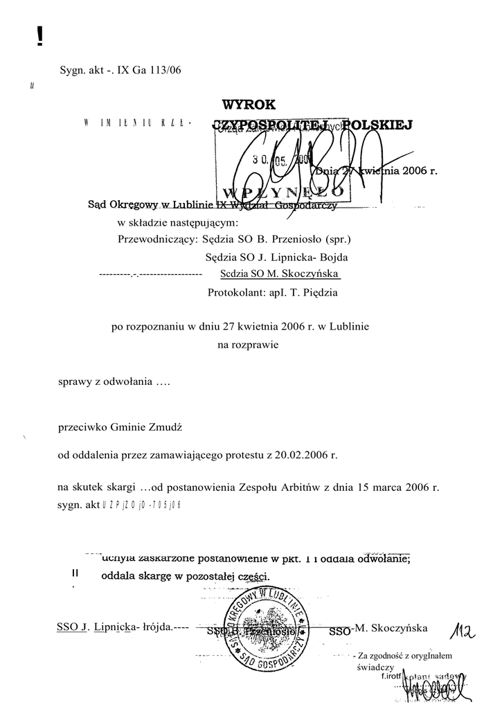 na skutek skargi …od postanowienia Zespołu Arbitńw z dnia 15 marca 2006 r.