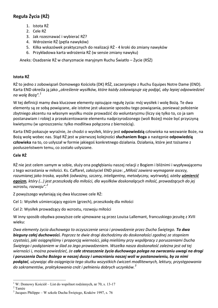 Reguła Życia (RŻ) 1. 2. 3. 4. 5. 6. Istota RŻ Cele RŻ Jak rozeznawać i wybierać RŻ? Wdrożenie RŻ (pętla nawyków) Kilka wskazówek praktycznych do realizacji RŻ - 4 kroki do zmiany nawyków Przykładowa karta wdrożenia RŻ (w sensie zmiany nawyku) Aneks: Osadzenie RŻ w charyzmacie maryjnym Ruchu Światło – Życie (RŚŻ) Istota RŻ RŻ to jedno z zobowiązań Domowego Kościoła (DK) RŚŻ, zaczerpnięte z Ruchu Equipes Notre Dame (END). Karta END określa ją jako „określenie wysiłków, które każdy zobowiązuje się podjąć, aby lepiej odpowiedzieć na wolę Bożą”.1 W tej definicji mamy dwa kluczowe elementy opisujące regułę życia: mój wysiłek i wolę Bożą. Te dwa elementy są ze sobą powiązane, ale istotne jest ukazanie sposobu tego powiązania, ponieważ położenie zbytniego akcentu na własnym wysiłku może prowadzić do woluntaryzmu (liczy się tylko to, co ja sam postanawiam i robię) a przeakcentowanie elementu nadprzyrodzonego (woli Bożej) może być przyczyną kwietyzmu (w uproszczeniu: tylko modlitwa połączona z biernością). Karta END pokazuje wyraźnie, że chodzi o wysiłek, który jest odpowiedzią człowieka na wezwanie Boże, na Bożą wolę wobec nas. Stąd RŻ jest w pierwszej kolejności słuchaniem Boga a następnie odpowiedzią człowieka na to, co usłyszał w formie jakiegoś konkretnego działania. Działania, które jest tożsame z posłuszeństwem temu, co zostało usłyszane. Cele RŻ RŻ nie jest celem samym w sobie, służy ona pogłębianiu naszej relacji z Bogiem i bliźnimi i wypływającemu z tego wzrastania w miłości. Ks. Caffarel, założyciel END pisze: „Miłość zawiera wymaganie ascezy, rozumianej jako troska, wysiłek (odważny, szczery, inteligentny, metodyczny, wytrwały), ażeby uśmiercić egoizm, który (…) jest przeszkodą dla miłości, dla wysiłków doskonalących miłość, prowadzących do jej wzrostu, rozwoju”.2 Z powyższego wyłaniają się dwa kluczowe cele RŻ: Cel 1: Wysiłek uśmiercający egoizm (grzech), przeszkodę dla miłości Cel 2: Wysiłek prowadzący do wzrostu, rozwoju miłości W inny sposób obydwa powyższe cele ujmowane są przez Louisa Lallemant, francuskiego jezuitę z XVII wieku: Dwa elementy życia duchowego to oczyszczenie serca i prowadzenie przez Ducha Świętego. To dwa bieguny całej duchowości. Poprzez te dwie drogi dochodzimy do doskonałości zgodnej ze stopniem czystości, jaki osiągnęliśmy i proporcją wierności, jaką mieliśmy przy współpracy z poruszeniami Ducha Świętego i podążaniem w ślad za Jego prowadzeniem. Wszelka nasza doskonałość zależna jest od tej wierności i, można powiedzieć, że całe streszczenie życia duchowego polega na zwracaniu uwagi na drogi i poruszenia Ducha Bożego w naszej duszy i umacnianiu naszej woli w postanowieniu, by za nimi podążać, używając dla osiągnięcia tego skutku wszystkich ćwiczeń modlitewnych, lektury, przystępowania do sakramentów, praktykowania cnót i pełnieniu dobrych uczynków. 3 1 W: Domowy Kościół – List do wspólnot rodzinnych, nr 70, s. 13-17 Tamże 3 Jacques Philippe – W szkole Ducha Świętego, Kraków 1997, s. 76 2 Ujmując powyższy cytat w kontekście celów RŻ, mamy słuchać Ducha Świętego, który ukazuje nam nasz grzech i podejmować wysiłek odrzucenia tego grzechu (Cel 1) oraz słuchać poruszeń Ducha Świętego, który pokazuje nam, jak w życiu realizować przykazanie miłości i podejmować wysiłek wdrożenia w życie tego, co usłyszeliśmy (Cel 2). Jak rozeznawać i wybierać RŻ? Powiedzieliśmy wcześniej, że RŻ jest naszą odpowiedzią, w formie jakiegoś wysiłku, na działanie Ducha Świętego w nas, odpowiedzią na Jego poruszenia, natchnienia. Rozważmy zatem w jaki sposób Duch Święty do nas mówi oraz jak rozpoznać, co jest Jego działaniem i jak wybierać to, czego od nas oczekuje. Nie będziemy tu wchodzić głęboko w istotę rozeznawania (dużo więcej o działaniu duchów możemy dowiedzieć się np. z duchowości Ignacego Loyoli), podkreślimy tylko kilka kluczowych elementów związanych z duchowością Domowego Kościoła Ruchu Światło – Życie. Jakie są więc najistotniejsze miejsca przemawiania Ducha Świętego do nas (Duch wieje jak chce i może przemawiać do nas także w wielu innych miejscach i na inne sposoby), miejsca, przez które zostanie nam ukazana, objawiona nasza RŻ ? 1. 2. 3. 4. Modlitwa i Słowo Boże (Namiot Spotkania) Sakrament pojednania Modlitwa małżeńska Dialog małżeński Oczywiście wszystkie te elementy powinny być przeżywane w szerszym kontekście wspólnoty Kościoła, w łączności z Kościołem, aby uchronić nas od nieodłącznego nam subiektywizmu. Praktykując powyższe elementy naszej duchowości, konfrontujemy nasze życie z tym, czego pragnie dla nas Bóg – albo przez indywidualne spotkanie z Nim, albo wspólne spotkanie z Nim w osobie współmałżonka. Podczas tych spotkań otrzymujemy szczególne światło na to, jak kształtować swoje życie – co i jak wybierać, jak rozwiązywać problemy w małżeństwie, pracy, jak postępować z dziećmi, etc. Te poruszenia, to właśnie działanie Ducha Świętego, który chce nas prowadzić. To na te poruszenia powinniśmy być uważni, konfrontować je ze współmałżonkiem, Pismem Świętym i nauką Kościoła i formułować jako postanowienia RŻ. Jeśli mamy wiele odkryć i poruszeń, to możemy zastanawiać się które i jak wybierać jako konkretne zastosowanie RŻ tu i teraz . Tu potrzebna jest pewna roztropność, gdyż nie wszystko da się wykonać od razu, trzeba ustalić pewne priorytety. Z pewnością należy dla RŻ szukać w pierwszej kolejności takich elementów do zmiany, które są kluczowe, to znaczy których zmiana wywoła, pociągnie za sobą, zmianę, usunięcie czy przekształcenie innych wzorców. Przykładowo, RŻ może być w jakimś momencie praca nad systematycznością Namiotu Spotkania a systematycz