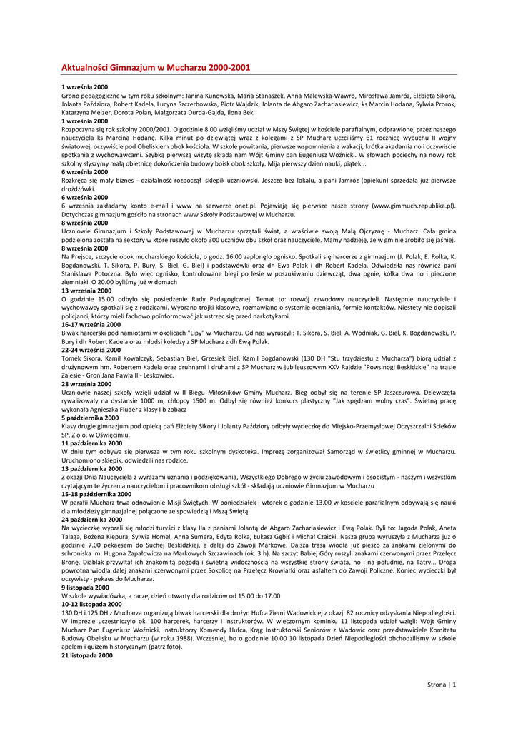 Aktualności Gimnazjum w Mucharzu 2000-2001 1 września 2000 Grono pedagogiczne w tym roku szkolnym: Janina Kunowska, Maria Stanaszek, Anna Malewska-Wawro, Mirosława Jamróz, Elżbieta Sikora, Jolanta Paździora, Robert Kadela, Lucyna Szczerbowska, Piotr Wajdzik, Jolanta de Abgaro Zachariasiewicz, ks Marcin Hodana, Sylwia Prorok, Katarzyna Melzer, Dorota Polan, Małgorzata Durda-Gajda, Ilona Bek 1 września 2000 Rozpoczyna się rok szkolny 2000/2001. O godzinie 8.00 wzięliśmy udział w Mszy Świętej w kościele parafialnym, odprawionej przez naszego nauczyciela ks Marcina Hodanę. Kilka minut po dziewiątej wraz z kolegami z SP Mucharz uczciliśmy 61 rocznicę wybuchu II wojny światowej, oczywiście pod Obeliskiem obok kościoła. W szkole powitania, pierwsze wspomnienia z wakacji, krótka akadamia no i oczywiście spotkania z wychowawcami. Szybką pierwszą wizytę składa nam Wójt Gminy pan Eugeniusz Woźnicki. W słowach pociechy na nowy rok szkolny słyszymy małą obietnicę dokooczenia budowy boisk obok szkoły. Mija pierwszy dzieo nauki, piątek... 6 września 2000 Rozkręca się mały biznes - działalnośd rozpoczął sklepik uczniowski. Jeszcze bez lokalu, a pani Jamróz (opiekun) sprzedała już pierwsze drożdżówki. 6 września 2000 6 września zakładamy konto e-mail i www na serwerze onet.pl. Pojawiają się pierwsze nasze strony (www.gimmuch.republika.pl). Dotychczas gimnazjum gościło na stronach www Szkoły Podstawowej w Mucharzu. 8 września 2000 Uczniowie Gimnazjum i Szkoły Podstawowej w Mucharzu sprzątali świat, a właściwie swoją Małą Ojczyznę - Mucharz. Cała gmina podzielona została na sektory w które ruszyło około 300 uczniów obu szkół oraz nauczyciele. Mamy nadzieję, że w gminie zrobiło się jaśniej. 8 września 2000 Na Prejsce, szczycie obok mucharskiego kościoła, o godz. 16.00 zapłonęło ognisko. Spotkali się harcerze z gimnazjum (J. Polak, E. Rolka, K. Bogdanowski, T. Sikora, P. Bury, S. Biel, G. Biel) i podstawówki oraz dh Ewa Polak i dh Robert Kadela. Odwiedziła nas również pani Stanisława Potoczna. Było więc ognisko, kontrolowane biegi po lesie w poszukiwaniu dziewcząt, dwa ognie, kółka dwa no i pieczone ziemniaki. O 20.00 byliśmy już w domach 13 września 2000 O godzinie 15.00 odbyło się posiedzenie Rady Pedagogicznej. Temat to: rozwój zawodowy nauczycieli. Następnie nauczyciele i wychowawcy spotkali się z rodzicami. Wybrano trójki klasowe, rozmawiano o systemie oceniania, formie kontaktów. Niestety nie dopisali policjanci, którzy mieli fachowo poinformowad jak ustrzec się przed narkotykami. 16-17 września 2000 Biwak harcerski pod namiotami w okolicach "Lipy" w Mucharzu. Od nas wyruszyli: T. Sikora, S. Biel, A. Wodniak, G. Biel, K. Bogdanowski, P. Bury i dh Robert Kadela oraz młodsi koledzy z SP Mucharz z dh Ewą Polak. 22-24 września 2000 Tomek Sikora, Kamil Kowalczyk, Sebastian Biel, Grzesiek Biel, Kamil Bogdanowski (130 DH "Stu trzydziestu z Mucharza") biorą udział z drużynowym hm. Robertem Kadelą oraz druhnami i druhami z SP Mucharz w jubileuszowym XXV Rajdzie "Powsinogi Beskidzkie" na trasie Zalesie - Groo Jana Pawła II - Leskowiec. 28 września 2000 Uczniowie naszej szkoły wzięli udział w II Biegu Miłośników Gminy Mucharz. Bieg odbył się na terenie SP Jaszczurowa. Dziewczęta rywalizowały na dystansie 1000 m, chłopcy 1500 m. Odbył się również konkurs plastyczny "Jak spędzam wolny czas". Świetną pracę wykonała Agnieszka Fluder z klasy I b zobacz 5 października 2000 Klasy drugie gimnazjum pod opieką pao Elżbiety Sikory i Jolanty Paździory odbyły wycieczkę do Miejsko-Przemysłowej Oczyszczalni Ścieków SP. Z o.o. w Oświęcimiu. 11 października 2000 W dniu tym odbywa się pierwsza w tym roku szkolnym dyskoteka. Imprezę zorganizował Samorząd w świetlicy gminnej w Mucharzu. Uruchomiono sklepik, odwiedzili nas rodzice. 13 października 2000 Z okazji Dnia Nauczyciela z wyrazami uznania i podziękowania, Wszystkiego Dobrego w życiu zawodowym i osobistym - naszym i wszystkim czytającym te życzenia nauczycielom i pracownikom obsługi szkół - składają uczniowie Gimnazjum w Mucharzu 15-18 października 2000 W parafii Mucharz trwa odnowienie Misji Świętych. W poniedziałek i wtorek o godzinie 13.00 w kościele parafialnym odbywają się nauki dla młodzieży gimnazjalnej połączone ze spowiedzią i Mszą Świętą. 24 października 2000 Na wycieczkę wybrali się młodzi turyści z klasy IIa z paniami Jolantą de Abgaro Zachariasiewicz i Ewą Polak. Byli to: Jagoda Polak, Aneta Talaga, Bożena Kiepura, Sylwia Homel, Anna Sumera, Edyta Rolka, Łukasz Gębiś i Michał Czaicki. Nasza grupa wyruszyła z Mucharza już o godzinie 7.00 pekaesem do Suchej Beskidzkiej, a dalej do Zawoji Markowe. Dalsza trasa wiodła już pieszo za znakami zielonymi do schroniska im. Hugona Zapałowicza na Markowych Szczawinach (ok. 3 h). Na szczyt Babiej Góry ruszyli znakami czerwonymi przez Przełęcz Bronę. Diablak przywitał ich znakomitą pogodą i świetną widocznością na wszystkie strony świata, no i na południe, na Tatry... Droga powrotna wiodła dalej znakami czerwonymi przez Sokolicę na Przełęcz Krowiarki oraz asfaltem do Zawoji Policzne. Koniec wycieczki był oczywisty - pekaes do Mucharza. 9 listopada 2000 W szkole wywiadówka, a raczej dzieo otwarty dla rodziców od 15.00 do 17.00 10-12 listopada 2000 130 DH i 125 DH z Mucharza organizują biwak harcerski dla drużyn Hufca Ziemi Wadowickiej z okazji 82 rocznicy odzyskania Niepodległości. W imprezie uczestniczyło ok. 100 harcerek, harcerzy i instruktorów. W wieczornym kominku 11 listopada udział wzięli: Wójt Gminy Mucharz Pan Eugeniusz Woźnicki, instruktorzy Komendy Hufca, Krąg Instruktorski Seniorów z Wadowic oraz przedstawiciele Komitetu Budowy Obelisku w Mucharzu (w roku 1988). Wcześniej, bo o godzinie 10.00 10 listopada Dzieo Niepodległości obchodziliśmy w szkole apelem i quizem historycznym (patrz