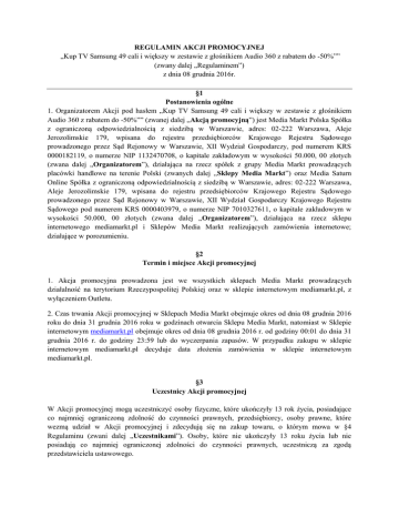 REGULAMIN AKCJI PROMOCYJNEJ „Kup TV Samsung 49 cali i większy w zestawie z głośnikiem Audio 360 z rabatem do -50%”” (zwany dalej „Regulaminem”) z dnia 08 grudnia 2016r. §1 Postanowienia ogólne 1. Organizatorem Akcji pod hasłem „Kup TV Samsung 49 cali i większy w zestawie z głośnikiem Audio 360 z rabatem do -50%”” (zwanej dalej „Akcją promocyjną”) jest Media Markt Polska Spółka z ograniczoną odpowiedzialnością z siedzibą w Warszawie, adres: 02-222 Warszawa, Aleje Jerozolimskie 179, wpisana do rejestru przedsiębiorców Krajowego Rejestru Sądowego prowadzonego przez Sąd Rejonowy w Warszawie, XII Wydział Gospodarczy, pod numerem KRS 0000182119, o numerze NIP 1132470708, o kapitale zakładowym w wysokości 50.000, 00 złotych (zwana dalej „Organizatorem”), działająca na rzecz spółek z grupy Media Markt prowadzących placówki handlowe na terenie Polski (zwanych dalej „Sklepy Media Markt”) oraz Media Saturn Online Spółka z ograniczoną odpowiedzialnością z siedzibą w Warszawie, adres: 02-222 Warszawa, Aleje Jerozolimskie 179, wpisana do rejestru przedsiębiorców Krajowego Rejestru Sądowego prowadzonego przez Sąd Rejonowy w Warszawie, XII Wydział Gospodarczy Krajowego Rejestru Sądowego pod numerem KRS 0000403979, o numerze NIP 7010327611, o kapitale zakładowym w wysokości 50.000, 00 złotych (zwana dalej „Organizatorem”), działająca na rzecz sklepu internetowego mediamarkt.pl i Sklepów Media Markt realizujących zamówienia internetowe; działające w porozumieniu. §2 Termin i miejsce Akcji promocyjnej 1. Akcja promocyjna prowadzona jest we wszystkich sklepach Media Markt prowadzących działalność na terytorium Rzeczypospolitej Polskiej oraz w sklepie internetowym mediamarkt.pl, z wyłączeniem Outletu. 2. Czas trwania Akcji promocyjnej w Sklepach Media Markt obejmuje okres od dnia 08 grudnia 2016 roku do dnia 31 grudnia 2016 roku w godzinach otwarcia Sklepu Media Markt, natomiast w Sklepie internetowym mediamarkt.pl obejmuje okres od dnia 08 grudnia 2016 r. od godziny 00:01 do dnia 31 grudnia 2016 r. do godziny 23:59 lub do wyczerpania zapasów. W przypadku zakupu w sklepie internetowym mediamarkt.pl decyduje data złożenia zamówienia w sklepie internetowym mediamarkt.pl. §3 Uczestnicy Akcji promocyjnej W Akcji promocyjnej mogą uczestniczyć osoby fizyczne, które ukończyły 13 rok życia, posiadające co najmniej ograniczoną zdolność do czynności prawnych, przedsiębiorcy, osoby prawne, które wezmą udział w Akcji promocyjnej i zdecydują się na zakup towaru, o którym mowa w §4 Regulaminu (zwani dalej „Uczestnikami”). Osoby, które nie ukończyły 13 roku życia lub nie posiadają co najmniej ograniczonej zdolności do czynności prawnych, uczestniczą za zgodą przedstawiciela ustawowego. §4 Zasady Akcji promocyjnej 1. Akcją promocyjną objęte są wymienione w załączniku nr 1 do niniejszego Regulaminu telewizory marki Samsung (zwane dalej oddzielnie “Produktem głównym”) oraz głośniki Audio 360 wymienione w załączniku nr 2 do niniejszego Regulaminu (zwane dalej oddzielnie “Produktem dodatkowym”), dostępne w ofercie Sklepów Media Markt oraz w sklepie internetowym mediamarkt.pl. 2. W ramach Akcji promocyjnej Uczestnik dokonując zakupu w Sklepie Stacjonarnym Media Markt lub w Sklepie Internetowym mediamarkt.pl może nabyć Produkt Główny wraz z Produktem dodatkowym w zestawie w promocyjnej cenie uwzględniającej rabat w wysokości 50% wartości Produktu dodatkowego (zwanym dalej „Zestawem”). 3. Cena Zestawu stanowi promocyjną cenę Produktu głównego i promocyjną cenę Produktu dodatkowego. 4. Uczestnik może brać udział w Akcji promocyjnej wielokrotnie pod warunkiem spełnienia warunków przewidzianych w Regulaminie. 5. W przypadku zakupu w sklepie internetowym mediamarkt.pl o zakupie Zestawu w promocyjnej cenie decyduje data złożenia zamówienia. 5. Uczestnikom nie przysługuje prawo do zastrzeżenia szczególnych cech Zestawów objętych Akcją promocyjną. 7. Akcja promocyjna nie może być łączona z innymi Akcjami promocyjnymi, w tym kodami rabatowymi otrzymanymi w ramach programu Konto Plus. 8. Dokument stanowiący dowód zakupu (paragon fiskalny lub faktura VAT) w celu oznaczenia Akcji promocyjnej będzie zawierał w treści hasło Akcji promocyjnej „Kup TV Samsung 49 cali i większy w zestawie z głośnikiem Audio 360 z rabatem do -50%””. §5 Odpowiedzialność 1. Odpowiedzialność Organizatora wobec Uczestnika z tytułu roszczeń związanych z uprawnieniami przyznanymi Uczestnikowi w Regulaminie ograniczona jest do ceny Zestawu w trakcie Akcji promocyjnej, którego to produktu roszczenie dotyczy. 2. Powyższe ograniczenie nie wyłącza uprawnień przyznanych Uczestnikom na mocy odrębnych przepisów prawnych. §6 Reklamacje i wymiana towarów 1. Reklamacje dotyczące sposobu przeprowadzenia Akcji promocyjnej powinny być zgłaszane w trakcie trwania Akcji promocyjnej oraz przez 21 (dwadzieścia jeden) dni od jej zakończenia w Sklepie Media Markt lub pod adresem e-mail: [email protected] z tematem wiadomości „Kup TV Samsung 49 cali i większy w zestawie z głośnikiem Audio 360 z rabatem do -50%”” lub pod numerem Infolinii 799 35 35 35* (* opłata zgodnie z taryfą operatora), czynna w dni powszednie w godzinach 9:00 - 21:00. 2. Reklamacje dotyczące sposobu przeprowadzenia Akcji promocyjnej składane w formie pisemnej w Sklepie Media Markt powinny zawierać dopisek „Kup TV Samsung 49 cali i większy w zestawie z głośnikiem Audio 360 z rabatem do -50%”” oraz powinny zawierać imię i nazwisko Uczestnika, 3. 4. 5. 6. 7. 8. 9. Jego adres zamieszkania, adres e-mail (jeżeli Uczestnik posiada), kopię dowodu zakupu oraz dokładny opis stanu faktycznego będącego przyczyną złożenia reklamacji. Postępowanie reklamacyjne, o którym mowa w §6 ust. 1 i 2 Regulaminu, trwa 14 (czternaście) dni od daty wpłynięcia reklamacji. Uczestnik zos