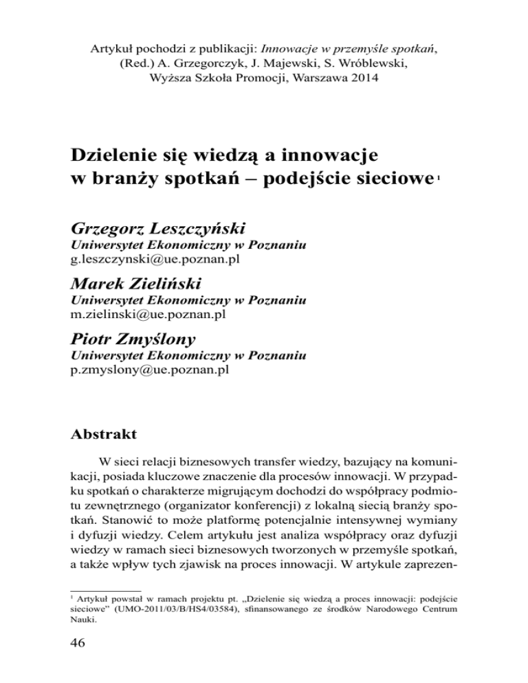 Artykuł pochodzi z publikacji: Innowacje w przemyśle spotkań, (Red.) A. Grzegorczyk, J. Majewski, S. Wróblewski, Wyższa Szkoła Promocji, Warszawa 2014 Dzielenie się wiedzą a innowacje w branży spotkań – podejście sieciowe 1 Grzegorz Leszczyński Uniwersytet Ekonomiczny w Poznaniu [email protected] Marek Zieliński Uniwersytet Ekonomiczny w Poznaniu [email protected] Piotr Zmyślony Uniwersytet Ekonomiczny w Poznaniu [email protected] Abstrakt W sieci relacji biznesowych transfer wiedzy, bazujący na komunikacji, posiada kluczowe znaczenie dla procesów innowacji. W przypadku spotkań o charakterze migrującym dochodzi do współpracy podmiotu zewnętrznego (organizator konferencji) z lokalną siecią branży spotkań. Stanowić to może platformę potencjalnie intensywnej wymiany i dyfuzji wiedzy. Celem artykułu jest analiza współpracy oraz dyfuzji wiedzy w ramach sieci biznesowych tworzonych w przemyśle spotkań, a także wpływ tych zjawisk na proces innowacji. W artykule zaprezenArtykuł powstał w ramach projektu pt. „Dzielenie się wiedzą a proces innowacji: podejście sieciowe” (UMO-2011/03/B/HS4/03584), sfinansowanego ze środków Narodowego Centrum Nauki. 1 46 towano wyniki badań nad siecią ukierunkowaną na organizację konferencji ABSL w Poznaniu (22-23 maja 2014). W artykule wykorzystano podejście sieciowe oparte na założeniach wypracowanych przez grupę Industrial Marketing and Purchasing i skupiające się na trzech elementach, które poddano badaniom: działaniach sieciowych, obrazach sieci oraz efektach. Słowa kluczowe: innowacje, branża spotkań, sieci współpracy, podejście sieciowe, dzielenie się wiedzą Abstract - Knowledge sharing and innovations in business tourism – network approach Knowledge sharing, based on communication within the network of relationships is crucial for innovation processes. In the case of migrating business meetings comes to the cooperation of an external entities (iniciator, professional conference organizer) with the local network of the tourism industry. This could be a potential platform for an intensive exchange and diffusion of knowledge. The aim of the paper is to analyze cooperation and knowledge sharing within business networks created in the meetings industry, and the impact of these phenomena on the innovation process. The paper presents the results of research on network-oriented conference of the ABSL in Poznan (22-23 May 2014). As a theoretical framework the network approach has been used, developed by a group of Industrial Marketing and Purchasing. The approach is focused on three elements that were tested: networking activities, network pictures and network effects. Keywords: Innovations, meetings industry, networks, network approach, knowledge sharing 1. Wstęp Sieci i aktywa związane z konkretną relacją umożliwiają organizacjom dostęp do zasobów, które mogą nie być dostępne w ramach tradycyjnej wymiany rynkowej, w tym również wiedzy. Transfer wiedzy, bazujący na komunikacji, w ramach sieci relacji posiada kluczowe 47 znaczenie dla procesów innowacji. W przypadku spotkań o charakterze migrującym dochodzi do współpracy podmiotów zewnętrznych (inicjator i zleceniodawca organizacji konferencji, organizator konferencji) z lokalną siecią branży spotkań. Stanowić to może platformę potencjalnie intensywnej wymiany i dyfuzji wiedzy. Celem artykułu jest analiza współpracy oraz dyfuzji wiedzy w ramach sieci biznesowych tworzonych w przemyśle spotkań, a także wpływ tych zjawisk na proces innowacji. W szczególności, w artykule zaprezentowane są wyniki badań nad siecią ukierunkowaną na organizację konferencji Association of Business Service Leaders w Poznaniu (22-23 maja 2014). W artykule wykorzystano podejście sieciowe oparte na założeniach wypracowanych przez grupę Industrial Marketing and Purchasing (IMP) i skupiające się na trzech elementach, które poddano badaniom: działaniach sieciowych, obrazach sieci oraz efektach. Zgodnie z podejściem IMP sieci nie mają sformalizowanego charakteru, zatem ich identyfikacja i analiza oparte są na trzech wymiarach: pozycji, relacji i strukturze. Pozycja w sieci jest określana przez jej uczestników – to oni definiują, z kim wchodzą w interakcje. W im większym stopniu relacje bazują na zaufaniu i wzajemności, tym łatwiej przebiega proces dzielenia się wiedzą (jak i pozostałymi zasobami), bowiem łatwiejsze do zaakceptowania jest ryzyko związane z udostępnieniem zasobu. Wymiana wiedzy w sieci powinna prowadzić do osiągnięcia spodziewanych efektów w postaci innowacji. 2. Model otwartych innowacji Zarządzanie innowacjami jest wąskim obszarem dziedziny zarządzania, którego celem jest zaprojektowanie procesu wprowadzania nowych technologii, procesów i produktów w organizacji. Początkowo proces innowacyjny był postrzegany w sposób liniowy jako sekwencja następujących po sobie faz, czego przykładem może być model Urbana-Hausera.2 Kluczowym elementem dla powstania innowacji była działalność badawczo-rozwojowa prowadzona wewnątrz firmy, bowiem cały proces innowacyjny przebiegał w granicach firmy bądź jej partnerów. G.L. Urban, J.R. Hauser, Design and Marketing of New Products, Prentice Hall, Englewood, 1993. 2 48 Globalizacja badań naukowych, rozwój technologii informacyjnych i komunikacyjnych oraz krótsze cykle innowacji i badań przemysłowych doprowadziły do poszukiwania nowych strategii innowacyjnych. Niemożliwe stało się pozyskiwanie nowej wiedzy przez organizacje w izolacji.3 Rothwell,4 badając ewolucję modeli innowacji ,wskazał na następujące fazy podejścia do poszukiwania nowych pomysłów: 1. model będący liniowym procesem bazującym na „pchaniu” technologii bądź odpowiadaniu na popyt poprzez prace w ramach działu badań i rozwoju, 2. prace w ramach interdyscyplinarnych zespołów wewnątrz firmy, 3. otwarta koncepcja innowacji, w ramach której postrzeg