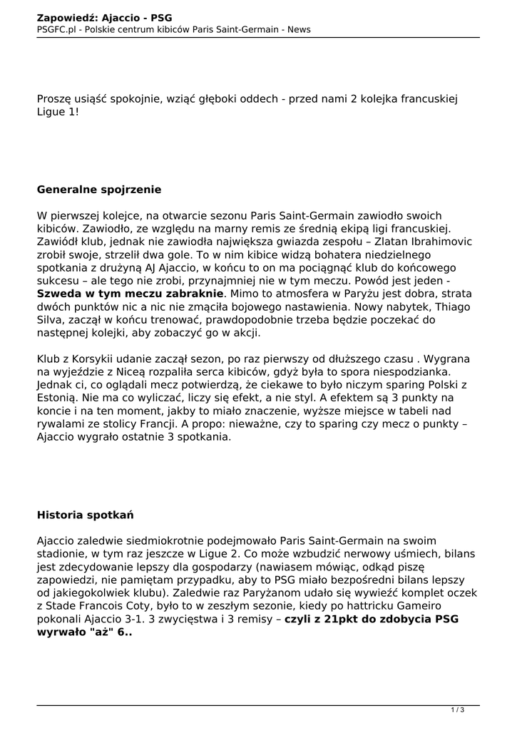 Zapowiedź: Ajaccio - PSG PSGFC.pl - Polskie centrum kibiców Paris Saint-Germain - News Proszę usiąść spokojnie, wziąć głęboki oddech - przed nami 2 kolejka francuskiej Ligue 1! Generalne spojrzenie W pierwszej kolejce, na otwarcie sezonu Paris Saint-Germain zawiodło swoich kibiców. Zawiodło, ze względu na marny remis ze średnią ekipą ligi francuskiej. Zawiódł klub, jednak nie zawiodła największa gwiazda zespołu – Zlatan Ibrahimovic zrobił swoje, strzelił dwa gole. To w nim kibice widzą bohatera niedzielnego spotkania z drużyną AJ Ajaccio, w końcu to on ma pociągnąć klub do końcowego sukcesu – ale tego nie zrobi, przynajmniej nie w tym meczu. Powód jest jeden Szweda w tym meczu zabraknie. Mimo to atmosfera w Paryżu jest dobra, strata dwóch punktów nic a nic nie zmąciła bojowego nastawienia. Nowy nabytek, Thiago Silva, zaczął w końcu trenować, prawdopodobnie trzeba będzie poczekać do następnej kolejki, aby zobaczyć go w akcji. Klub z Korsykii udanie zaczął sezon, po raz pierwszy od dłuższego czasu . Wygrana na wyjeździe z Niceą rozpaliła serca kibiców, gdyż była to spora niespodzianka. Jednak ci, co oglądali mecz potwierdzą, że ciekawe to było niczym sparing Polski z Estonią. Nie ma co wyliczać, liczy się efekt, a nie styl. A efektem są 3 punkty na koncie i na ten moment, jakby to miało znaczenie, wyższe miejsce w tabeli nad rywalami ze stolicy Francji. A propo: nieważne, czy to sparing czy mecz o punkty – Ajaccio wygrało ostatnie 3 spotkania. Historia spotkań Ajaccio zaledwie siedmiokrotnie podejmowało Paris Saint-Germain na swoim stadionie, w tym raz jeszcze w Ligue 2. Co może wzbudzić nerwowy uśmiech, bilans jest zdecydowanie lepszy dla gospodarzy (nawiasem mówiąc, odkąd piszę zapowiedzi, nie pamiętam przypadku, aby to PSG miało bezpośredni bilans lepszy od jakiegokolwiek klubu). Zaledwie raz Paryżanom udało się wywieźć komplet oczek z Stade Francois Coty, było to w zeszłym sezonie, kiedy po hattricku Gameiro pokonali Ajaccio 3-1. 3 zwycięstwa i 3 remisy – czyli z 21pkt do zdobycia PSG wyrwało "aż" 6.. 1/3 Zapowiedź: Ajaccio - PSG PSGFC.pl - Polskie centrum kibiców Paris Saint-Germain - News Garść statystyk W dotychczasowych siedmiu meczach na stadionie Ajaccio pomiędzy oboma zespołami padło ledwie 11 bramek – średnia 1.5 nie jest oczywiście złą, zarazem jednak nie jest też wysoką. Dwukrotnie padał bezbramkowy remis. W niedzielnym spotkaniu warto dać szansę Kevinowi Gameiro – przeciwko Ajaccio zagrał do tej pory ledwie dwukrotnie, a zdobył 3 gole. Najwyższe zwycięstwo padło w 1972 roku, kiedy to Ajaccio pokonało ledwie raczkujące PSG trzy do zera. Powołani na mecz Ajaccio: Ochoa, Sissoko, Diawara, Medjani, Poulard, Bouhours, Faty, Pierazzi, Cavalli, André, Belghazouani, Diarra, Eduardo, Begeorgi, Maire, Delort, Tiberi, Lasne. Wśród graczy gospodarzy zabraknie Federica Sammaritan, nie dograny do końca jest także kontrakt dla Adriana Mutu, który ma wzmocnić szeregi Ajaccio w ciągu najbliższych dni. PSG: Crom, Areola, Sirigu – Sakho, Maxwell, Alex, Jallet, Z.Camara, Armand – Verratti, Rabiot, Pastore, Nenê, Ménez, Matuidi, Chantôme – Lavezzi, Luyindula, Hoarau, Gameiro I tutaj mamy petardę. Nie ma Ibrahimovica w składzie. Powodem jest kontuzja kostki. Zabraknie także Motty, Sissoko, Doucheza – kontuzje, oraz Bodmer, Tiene, Lugano – wybór trenera. Dobrą wiadomością jest z kolei powrót Pastore, który zawieszony był za kartki w pierwszym spotkaniu. Sędzia spotkania 30-letni Francuz Clement Turpin będzie sędzią niedzielnego spotkania pomiędzy Ajaccio a PSG. Nie jest to doświadczony sędzia, gdyż dopiero od zeszłego sezonu zaczął swoją przygodę w Ligue 1. Do tej pory sędziował 16 spotkań, rozdając dużo, bo aż 60! żółtych kartoników oraz 8 czerwieni. Jak widać, lubi błyszczeć na boisku. 2/3 Zapowiedź: Ajaccio - PSG PSGFC.pl - Polskie centrum kibiców Paris Saint-Germain - News Redakcja typuje Mimo, że nie będzie Ibry, zwycięzca nie może być inny – PSG wygra. Od początku spotkania ruszą na rywali, pragnąc jak najszybciej ustawić sobie spotkanie. Ajaccio 0:2 PSG Autor: kublu 3/3 Powered by TCPDF (www.tcpdf.org)