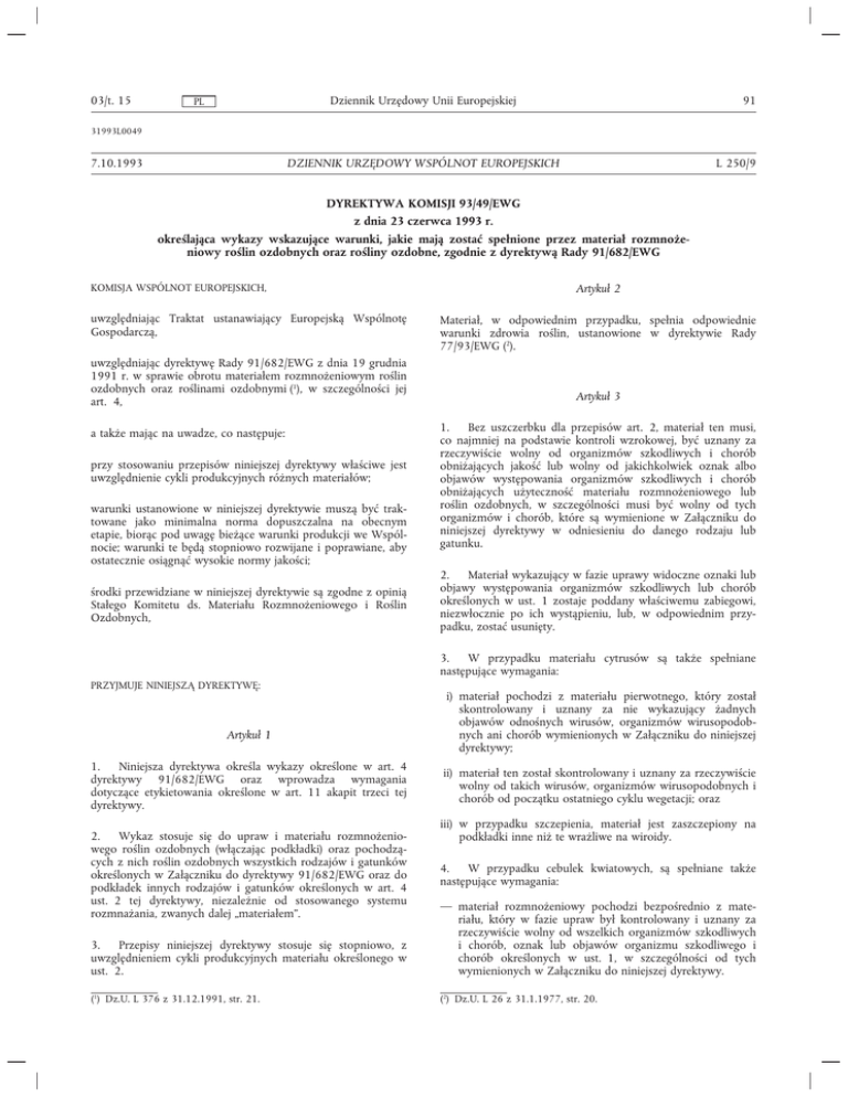 03/t. 15 Dziennik Urzędowy Unii Europejskiej PL 91 31993L0049 7.10.1993 L 250/9 DZIENNIK URZĘDOWY WSPÓLNOT EUROPEJSKICH DYREKTYWA KOMISJI 93/49/EWG z dnia 23 czerwca 1993 r. określająca wykazy wskazujące warunki, jakie mają zostać spełnione przez materiał rozmnożeniowy roślin ozdobnych oraz rośliny ozdobne, zgodnie z dyrektywą Rady 91/682/EWG KOMISJA WSPÓLNOT EUROPEJSKICH, uwzględniając Traktat ustanawiający Europejską Wspólnotę Gospodarczą, uwzględniając dyrektywę Rady 91/682/EWG z dnia 19 grudnia 1991 r. w sprawie obrotu materiałem rozmnożeniowym roślin ozdobnych oraz roślinami ozdobnymi (1), w szczególności jej art. 4, a także mając na uwadze, co następuje: przy stosowaniu przepisów niniejszej dyrektywy właściwe jest uwzględnienie cykli produkcyjnych różnych materiałów; warunki ustanowione w niniejszej dyrektywie muszą być traktowane jako minimalna norma dopuszczalna na obecnym etapie, biorąc pod uwagę bieżące warunki produkcji we Wspólnocie; warunki te będą stopniowo rozwijane i poprawiane, aby ostatecznie osiągnąć wysokie normy jakości; środki przewidziane w niniejszej dyrektywie są zgodne z opinią Stałego Komitetu ds. Materiału Rozmnożeniowego i Roślin Ozdobnych, Artykuł 2 Materiał, w odpowiednim przypadku, spełnia odpowiednie warunki zdrowia roślin, ustanowione w dyrektywie Rady 77/93/EWG (2). Artykuł 3 1. Bez uszczerbku dla przepisów art. 2, materiał ten musi, co najmniej na podstawie kontroli wzrokowej, być uznany za rzeczywiście wolny od organizmów szkodliwych i chorób obniżających jakość lub wolny od jakichkolwiek oznak albo objawów występowania organizmów szkodliwych i chorób obniżających użyteczność materiału rozmnożeniowego lub roślin ozdobnych, w szczególności musi być wolny od tych organizmów i chorób, które są wymienione w Załączniku do niniejszej dyrektywy w odniesieniu do danego rodzaju lub gatunku. 2. Materiał wykazujący w fazie uprawy widoczne oznaki lub objawy występowania organizmów szkodliwych lub chorób określonych w ust. 1 zostaje poddany właściwemu zabiegowi, niezwłocznie po ich wystąpieniu, lub, w odpowiednim przypadku, zostać usunięty. 3. W przypadku materiału cytrusów są także spełniane następujące wymagania: PRZYJMUJE NINIEJSZĄ DYREKTYWĘ: Artykuł 1 1. Niniejsza dyrektywa określa wykazy określone w art. 4 dyrektywy 91/682/EWG oraz wprowadza wymagania dotyczące etykietowania określone w art. 11 akapit trzeci tej dyrektywy. 2. Wykaz stosuje się do upraw i materiału rozmnożeniowego roślin ozdobnych (włączając podkładki) oraz pochodzących z nich roślin ozdobnych wszystkich rodzajów i gatunków określonych w Załączniku do dyrektywy 91/682/EWG oraz do podkładek innych rodzajów i gatunków określonych w art. 4 ust. 2 tej dyrektywy, niezależnie od stosowanego systemu rozmnażania, zwanych dalej „materiałem”. i) materiał pochodzi z materiału pierwotnego, który został skontrolowany i uznany za nie wykazujący żadnych objawów odnośnych wirusów, organizmów wirusopodobnych ani chorób wymienionych w Załączniku do niniejszej dyrektywy; ii) materiał ten został skontrolowany i uznany za rzeczywiście wolny od takich wirusów, organizmów wirusopodobnych i chorób od początku ostatniego cyklu wegetacji; oraz iii) w przypadku szczepienia, materiał jest zaszczepiony na podkładki inne niż te wrażliwe na wiroidy. 4. W przypadku cebulek kwiatowych, są spełniane także następujące wymagania: 3. Przepisy niniejszej dyrektywy stosuje się stopniowo, z uwzględnieniem cykli produkcyjnych materiału określonego w ust. 2. — materiał rozmnożeniowy pochodzi bezpośrednio z materiału, który w fazie upraw był kontrolowany i uznany za rzeczywiście wolny od wszelkich organizmów szkodliwych i chorób, oznak lub objawów organizmu szkodliwego i chorób określonych w ust. 1, w szczególności od tych wymienionych w Załączniku do niniejszej dyrektywy. (1) Dz.U. L 376 z 31.12.1991, str. 21. (2) Dz.U. L 26 z 31.1.1977, str. 20. 92 Dziennik Urzędowy Unii Europejskiej PL Artykuł 4 1. Materiał cechuje się odpowiednią tożsamością i czystością rodzajową lub gatunkową albo, w odpowiednim przypadku, w stosunku do grupy roślin oraz o ile jest przedmiotem obrotu lub jest przeznaczony do obrotu, w stosunku do odmiany stosownie do art. 9 ust. 1 dyrektywy 91/682/EWG, cechuje się także jednolitością i czystością odmianową. 2. W przypadku powszechnie znanych odmian w związku z art. 9 ust. 2 tiret pierwsze dyrektywy 91/682/EWG, dostawca używa urzędowej nazwy odmiany. 3. W przypadku odmian, które już są przedmiotem wniosku o prawo hodowcy roślin lub urzędowej rejestracji określonej w art. 9 ust. 2 tiret drugie dyrektywy 91/682/EWG, musi być stosowane odniesienie do hodowcy lub nazwa proponowana dopóki nie udzielono odpowiedniego zezwolenia. 4. W przypadku odmian wprowadzonych do wykazów posiadanych przez dostawców zgodnie z art. 9 ust. 2 tiret drugie dyrektywy 91/682/EWG, wymaganie określone w ust. 1 w odniesieniu do odmiany opiera się na szczegółowym opisie przedstawionym w wykazach posiadanych przez dostawców. Artykuł 5 1. Materiał jest zasadniczo wolny od jakichkolwiek wad przypuszczalnie mogących obniżyć jego jakość jako materiału rozmnożeniowego lub materiału nasadzeniowego. 2. Żywotność i rozmiary materiału są zadowalające w odniesieniu do jego użyteczności jako materiał rozmnożeniowego i roślin ozdobnych. Ponadto, zapewnia się właściwą proporcję między korzeniami, łodygami i liśćmi. 3. W przypadku nasion, w uzupełnieniu do wymagań podanych w ust. 1, zdolność kiełkowania jest zadowalająca. 03/t. 15 iv) numer rejestracji lub akredytacji; v) nazwa dostawcy; vi) indywidualny numer seryjny, numer tygodnia lub numer partii; vii) data wystawienia dokumentów dostawcy; viii) nazwa botaniczna; ix) nazwa odmiany, w odpowiednim przypadku. W przypadku podkładek, naz