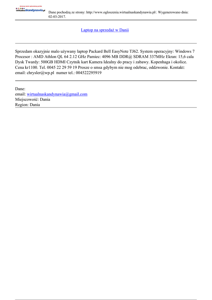 Dane pochodzą ze strony: http://www.ogloszenia.wirtualnaskandynawia.pl/. Wygenerowano dnia: 02-03-2017. Laptop na sprzedaż w Danii Sprzedam okazyjnie malo używany laptop Packard Bell EasyNote TJ62. System operacyjny: Windows 7 Procesor : AMD Athlon QL 64 2.12 GHz Pamiec: 4096 MB DDR@ SDRAM 337MHz Ekran: 15,6 cala Dysk Twardy: 500GB HDMI Czytnik kart Kamera Idealny do pracy i zabawy. Kopenhaga i okolice. Cena kr1100. Tel. 0045 22 29 59 19 Prosze o smsa gdybym nie mog odebrac, oddzwonie. Kontakt: email: [email protected] numer tel.: 004522295919 Dane: email: [email protected] Miejscowość: Dania Region: Dania