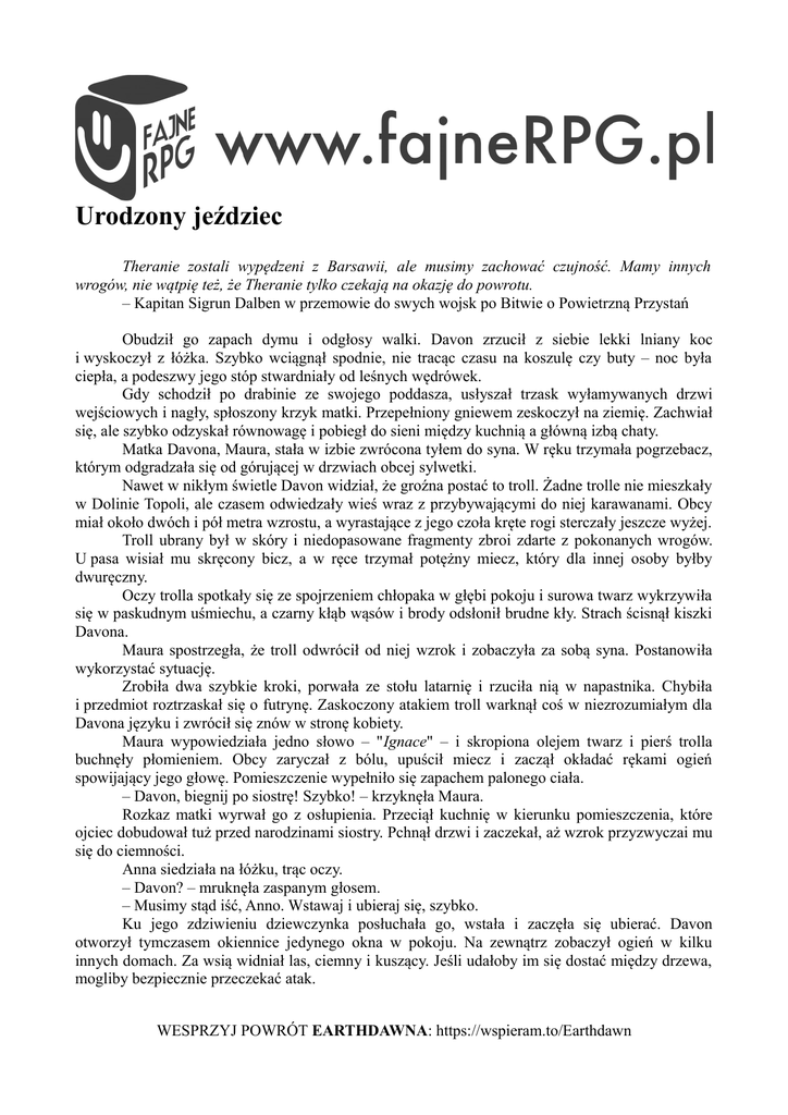 Urodzony jeździec Theranie zostali wypędzeni z Barsawii, ale musimy zachować czujność. Mamy innych wrogów, nie wątpię też, że Theranie tylko czekają na okazję do powrotu. – Kapitan Sigrun Dalben w przemowie do swych wojsk po Bitwie o Powietrzną Przystań Obudził go zapach dymu i odgłosy walki. Davon zrzucił z siebie lekki lniany koc i wyskoczył z łóżka. Szybko wciągnął spodnie, nie tracąc czasu na koszulę czy buty – noc była ciepła, a podeszwy jego stóp stwardniały od leśnych wędrówek. Gdy schodził po drabinie ze swojego poddasza, usłyszał trzask wyłamywanych drzwi wejściowych i nagły, spłoszony krzyk matki. Przepełniony gniewem zeskoczył na ziemię. Zachwiał się, ale szybko odzyskał równowagę i pobiegł do sieni między kuchnią a główną izbą chaty. Matka Davona, Maura, stała w izbie zwrócona tyłem do syna. W ręku trzymała pogrzebacz, którym odgradzała się od górującej w drzwiach obcej sylwetki. Nawet w nikłym świetle Davon widział, że groźna postać to troll. Żadne trolle nie mieszkały w Dolinie Topoli, ale czasem odwiedzały wieś wraz z przybywającymi do niej karawanami. Obcy miał około dwóch i pół metra wzrostu, a wyrastające z jego czoła kręte rogi sterczały jeszcze wyżej. Troll ubrany był w skóry i niedopasowane fragmenty zbroi zdarte z pokonanych wrogów. U pasa wisiał mu skręcony bicz, a w ręce trzymał potężny miecz, który dla innej osoby byłby dwuręczny. Oczy trolla spotkały się ze spojrzeniem chłopaka w głębi pokoju i surowa twarz wykrzywiła się w paskudnym uśmiechu, a czarny kłąb wąsów i brody odsłonił brudne kły. Strach ścisnął kiszki Davona. Maura spostrzegła, że troll odwrócił od niej wzrok i zobaczyła za sobą syna. Postanowiła wykorzystać sytuację. Zrobiła dwa szybkie kroki, porwała ze stołu latarnię i rzuciła nią w napastnika. Chybiła i przedmiot roztrzaskał się o futrynę. Zaskoczony atakiem troll warknął coś w niezrozumiałym dla Davona języku i zwrócił się znów w stronę kobiety. Maura wypowiedziała jedno słowo – "Ignace" – i skropiona olejem twarz i pierś trolla buchnęły płomieniem. Obcy zaryczał z bólu, upuścił miecz i zaczął okładać rękami ogień spowijający jego głowę. Pomieszczenie wypełniło się zapachem palonego ciała. – Davon, biegnij po siostrę! Szybko! – krzyknęła Maura. Rozkaz matki wyrwał go z osłupienia. Przeciął kuchnię w kierunku pomieszczenia, które ojciec dobudował tuż przed narodzinami siostry. Pchnął drzwi i zaczekał, aż wzrok przyzwyczai mu się do ciemności. Anna siedziała na łóżku, trąc oczy. – Davon? – mruknęła zaspanym głosem. – Musimy stąd iść, Anno. Wstawaj i ubieraj się, szybko. Ku jego zdziwieniu dziewczynka posłuchała go, wstała i zaczęła się ubierać. Davon otworzył tymczasem okiennice jedynego okna w pokoju. Na zewnątrz zobaczył ogień w kilku innych domach. Za wsią widniał las, ciemny i kuszący. Jeśli udałoby im się dostać między drzewa, mogliby bezpiecznie przeczekać atak. WESPRZYJ POWRÓT EARTHDAWNA: https://wspieram.to/Earthdawn Usłyszał hałas w drugiej izbie i kolejny krzyk Maury – nie wiedział jednak, czy wywołał go ból czy gniew. Niepokojący głos matki do końca wybudził Annę ze snu. – Co się dzieje z mamą? Davon nie odpowiedział. Nie chciał myśleć teraz o niczym, co dzieje się gdziekolwiek indziej. – Przysuńmy łóżko do okna – poprosił. Dziewczynka próbowała mu pomóc, ale to Davon musiał wykonać większość pracy. Kiedy łóżko było już w odpowiednim miejscu, chłopak wyślizgnął się przez okno. Mech porastający ziemię wokół chaty zamortyzował jego upadek i Davon po chwili był znów na nogach, pomagając wyjść Annie. – Chodź – ponaglił ją. – Tylko cicho. Pójdziemy do lasu i schowamy się tam, do czasu aż będzie bezpiecznie. – A co z mamą? – Zaraz do nas dołączy. Nie martw się. – Jakimś sposobem zdobył się na uspokajający ton głosu. Anna przyjęła jego odpowiedź, złapała go za dłoń i ruszyli razem w stronę oddalonych o jakieś sto metrów drzew. Przebyli połowę drogi i odgłosy walki zaczęły cichnąć. Wydawało się, że nikt nie zwrócił uwagi na ich ucieczkę i Davon odetchnął z ulgą. Nagle dobiegł ich trzask z szopy tuż przed nimi. Davon i Anna zamarli, gdy z budynku wynurzył się postawny człowiek. Ubrany był tak jak troll w chacie – w skóry i zbroję, za pasem miał miecz. Jego ogoloną głowę pokrywały skomplikowane tatuaże. W jednym ręku trzymał worek, w drugim pochodnię. Łupieżca odwrócił się i podłożył ogień pod strzechę. Stojąc tyłem do pary uciekinierów patrzył, jak płomienie się rozprzestrzeniają. Davon chciał już zerwać się do biegu w kierunku drzew, kiedy obcy odwrócił się i zauważył dzieci w coraz jaśniejszym świetle pożaru. Człowiek rzucił worek na ziemię i dobył miecza. Przemówił w obcym języku i zaśmiał się. Davon popchnął Annę za siebie i ustawił się między siostrą a przeciwnikiem. Widząc gotowość Davona do walki, łotr znów się roześmiał. Ton tego śmiechu zaniepokoił Davona – obiecywał on ból, a rozbójnik wydawał się aż nadto gotów do spełnienia tej obietnicy. Łupieżca wydał okrzyk, któremu odpowiedziały inne głosy od strony placu w środku wsi. Davon odwrócił się i zobaczył dwóch kolejnych oprychów wychodzących spomiędzy budynków. Mimo że noc była ciepła, dreszcz przeszył Davona. Sytuacja stawała się tragiczna. Mogliby próbować zgubić łupieżców w ciemnym lesie, ale człowiek odcinał im tę drogę ucieczki. Anna złapała się kurczowo nogi Davona i wyglądała zza niej na wytatuowanego wojownika. Davon czuł, że łkała ze strachu, choć okrzyki zbliżających się rozbójników zagłuszyły jej płacz. Davon spojrzał na siostrę i zrobił, co w jego mocy, aby utrzymać spokój w głosie. – Anno,