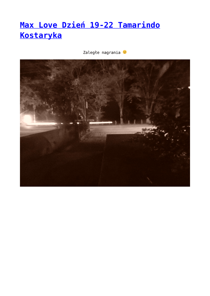 Max Love Dzień 19-22 Tamarindo Kostaryka Zaległe nagrania Rec 46 – 9:34 – dzien 19 http://maxlove.eu/blog/wp-content/uploads/2014/02/REC46-19.mp3 max love REC46 19 – aby ściagnąć plik kliknij prawym przyciskiem i wybierz „zapisz jako…” – „save as…” – o bifazie snu – sytuacja w bazie – oczy widzenie w nocy – o gromadzeniu danych i edycji rec 47 – 5:11 – dzień 19 http://maxlove.eu/blog/wp-content/uploads/2014/02/REC47-19.mp3 max love REC47 19 – aby ściagnąć plik kliknij prawym przyciskiem i wybierz „zapisz jako…” – „save as…” – o realizacji planów – komu warto ujawniać swoje plany – „intymność” problemów w relacji rec 49 – 4:58 – dzień 20 http://maxlove.eu/blog/wp-content/uploads/2014/02/REC49-20.mp3 max love REC49 20 – aby ściagnąć plik kliknij prawym przyciskiem i wybierz „zapisz jako…” – „save as…” – coachingowa metoda pompy przerwa i od ok 3minuty – wszystko jest niczym rec 50 – 5:27 – dzień 20 http://maxlove.eu/blog/wp-content/uploads/2014/02/REC50-20.mp3 max love REC50 20 – aby ściagnąć plik kliknij prawym przyciskiem i wybierz „zapisz jako…” – „save as…” – brak szaleństwa w życiu – „zahamowane” kraje 3ciego świata – „bezhamulcowe” duże miasta – nagrody od świata rec 52 – 1:17 – dzien 21 http://maxlove.eu/blog/wp-content/uploads/2014/02/REC52-21.mp3 max love REC52 21 – aby ściagnąć plik kliknij prawym przyciskiem i wybierz „zapisz jako…” – „save as…” – o wyjedzie na ometepe, nikaragua rec 53 – 6:24 – dzien 21 http://maxlove.eu/blog/wp-content/uploads/2014/02/REC53-21.mp3 max love REC53 21 – aby ściagnąć plik kliknij prawym przyciskiem i wybierz „zapisz jako…” – „save as…” – o pośpiechu – napięcie zawęża postrzeganie – rozluźnienie = szersza świadomość – jak zobaczyć przestrzeń rozwiązań – jak działa rozwiązywanie „problemów” na podstawie podobieństw matrixów – otwartość w odbieraniu przekazów rec 55 – 0:34 – dzień 21 http://maxlove.eu/blog/wp-content/uploads/2014/02/REC55-21.mp3 max love REC55 21 – aby ściagnąć plik kliknij prawym przyciskiem i wybierz „zapisz jako…” – „save as…” – Kayah i Bregovic w Kostaryce rec 60 – 1:28 – dzień 22 http://maxlove.eu/blog/wp-content/uploads/2014/02/REC60-22.mp3 max love REC60 22 – aby ściagnąć plik kliknij prawym przyciskiem i wybierz „zapisz jako…” – „save as…” – jadę do Nikaragua rec 62 – 4:54 (dość głośne nagranie) http://maxlove.eu/blog/wp-content/uploads/2014/02/REC62-22.mp3 max love REC62 22 – aby ściagnąć plik kliknij prawym przyciskiem i wybierz „zapisz jako…” – „save as…” – w autobusie o krajobrazach – o autobusie kostorykańskim – wszędzie jest to samo – jakie ma być miejsce od życia by Max Love 333 Spodobało się? Udostepnij na facebooku Dziękuję <3 <3 <3