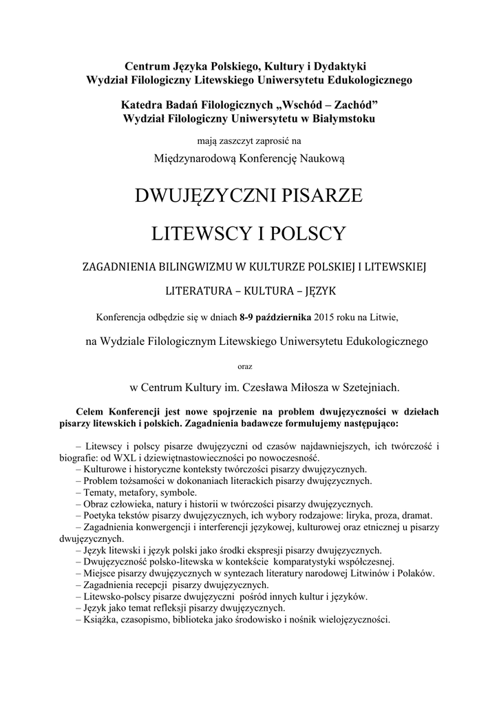Centrum Języka Polskiego, Kultury i Dydaktyki Wydział Filologiczny Litewskiego Uniwersytetu Edukologicznego Katedra Badań Filologicznych „Wschód – Zachód” Wydział Filologiczny Uniwersytetu w Białymstoku mają zaszczyt zaprosić na Międzynarodową Konferencję Naukową DWUJĘZYCZNI PISARZE LITEWSCY I POLSCY ZAGADNIENIA BILINGWIZMU W KULTURZE POLSKIEJ I LITEWSKIEJ LITERATURA – KULTURA – JĘZYK Konferencja odbędzie się w dniach 8-9 października 2015 roku na Litwie, na Wydziale Filologicznym Litewskiego Uniwersytetu Edukologicznego oraz w Centrum Kultury im. Czesława Miłosza w Szetejniach. Celem Konferencji jest nowe spojrzenie na problem dwujęzyczności w dziełach pisarzy litewskich i polskich. Zagadnienia badawcze formułujemy następująco: – Litewscy i polscy pisarze dwujęzyczni od czasów najdawniejszych, ich twórczość i biografie: od WXL i dziewiętnastowieczności po nowoczesność. – Kulturowe i historyczne konteksty twórczości pisarzy dwujęzycznych. – Problem tożsamości w dokonaniach literackich pisarzy dwujęzycznych. – Tematy, metafory, symbole. – Obraz człowieka, natury i historii w twórczości pisarzy dwujęzycznych. – Poetyka tekstów pisarzy dwujęzycznych, ich wybory rodzajowe: liryka, proza, dramat. – Zagadnienia konwergencji i interferencji językowej, kulturowej oraz etnicznej u pisarzy dwujęzycznych. – Język litewski i język polski jako środki ekspresji pisarzy dwujęzycznych. – Dwujęzyczność polsko-litewska w kontekście komparatystyki współczesnej. – Miejsce pisarzy dwujęzycznych w syntezach literatury narodowej Litwinów i Polaków. – Zagadnienia recepcji pisarzy dwujęzycznych. – Litewsko-polscy pisarze dwujęzyczni pośród innych kultur i języków. – Język jako temat refleksji pisarzy dwujęzycznych. – Książka, czasopismo, biblioteka jako środowisko i nośnik wielojęzyczności. Języki konferencji: litewski, polski, angielski, rosyjski. Opłata konferencyjna wynosi 100 euro (pokrywa koszty organizacyjne, koszty wyżywienia podczas konferencji, przejazdów autokarem i wycieczki). Uczestnicy przyjeżdżają na własny koszt oraz opłacają zakwaterowanie. Proponujemy Państwu dwa hotele: Hotel Uniwersytecki (Vivulskio 36) – pokój o wyższym standardzie (około 30 euro od osoby), pokój zwykły (około 15 euro od osoby). Śniadanie nie jest przewidziane. Hotel „Ecotel” (Sluckio 7) – pokój jednoosobowy (około 30 euro), pokój dwuosobowy (około 36 euro), pokój trzyosobowy (około 45 euro) ze śniadaniem. W czasie Konferencji przewidziany jest wyjazd do Szetejń, gdzie drugiego dnia będą kontynuowane obrady. Osoby zgłaszające się na konferencję będziemy prosić o przygotowanie krótkiego streszczenia po polsku, które przełożymy na język litewski. Materiały Konferencji zostaną opublikowane w tomie Naukowej Serii Wydawniczej „Colloquia Orientalia Bialostocensia” w 2016 roku w Białymstoku jako recenzowana, punktowana monografia zbiorowa. Zapraszamy do udziału w Konferencji! Zgłoszenia z Polski i innych krajów prosimy nadsyłać do 20 maja 2015 roku na adres mailowy: [email protected] Zgłoszenia z Litwy prosimy nadsyłać do 20 maja 2015 roku na adres mailowy: [email protected] Serdecznie czekamy w Wilnie i Szetejniach! Prof. Jarosław Ławski Komitet Naukowy Konferencji: Prof. dr Gintautas Kundrotas – Przewodniczący (LUE, Wilno) Doc. dr Žydronė Kolevinskienė (LUE, Wilno) Doc. dr Irena Masojć (LUE, Wilno) Prof. dr Sigutė Radzevičienė (LUE, Wilno) Doc. dr Dainius Vaitiekūnas (LUE, Wilno) Prof. Mieczysław Jackiewicz (UWM, Olsztyn) Prof. Aleksander Fiut (UJ, Kraków) Prof. Halina Krukowska (UwB, Białystok) Prof. Michał Kuziak (UW, Warszawa) Prof. Agnieszka Czajkowska (AJD, Częstochowa) Prof. Andrzej Baranow Komitet Organizacyjny Konferencji: Prof. Jarosław Ławski – Przewodniczący (KBF „W-Z”, Uniwersytet w Białymstoku) Prof. Andrzej Baranow – Przewodniczący (LUE, Wilno) Dr Henryka Sokołowska – Kierownik Centrum Języka Polskiego, Kultury i Dydaktyki (LUE, Wilno) Doc. dr Barbara Dwilewicz (LUE, Wilno) Doc. dr Romuald Naruniec (LUE, Wilno) Doc. dr Halina Turkiewicz (LUE, Wilno) Dr hab. Anna Wydrycka – Zakład Literatury Pozytywizmu i Młodej Polski UwB Mgr Monika Jurkowska – Wydział Filologiczny UwB – Sekretarz Konferencji Mgr Piotr Drozdowski – Wydział Filologiczny UwB – Sekretarz Konferencji Dr Łukasz Zabielski – Książnica Podlaska im. Łukasza Górnickiego w Białymstoku Dr Anna Janicka – Wydział Filologiczny Uniwersytetu w Białymstoku