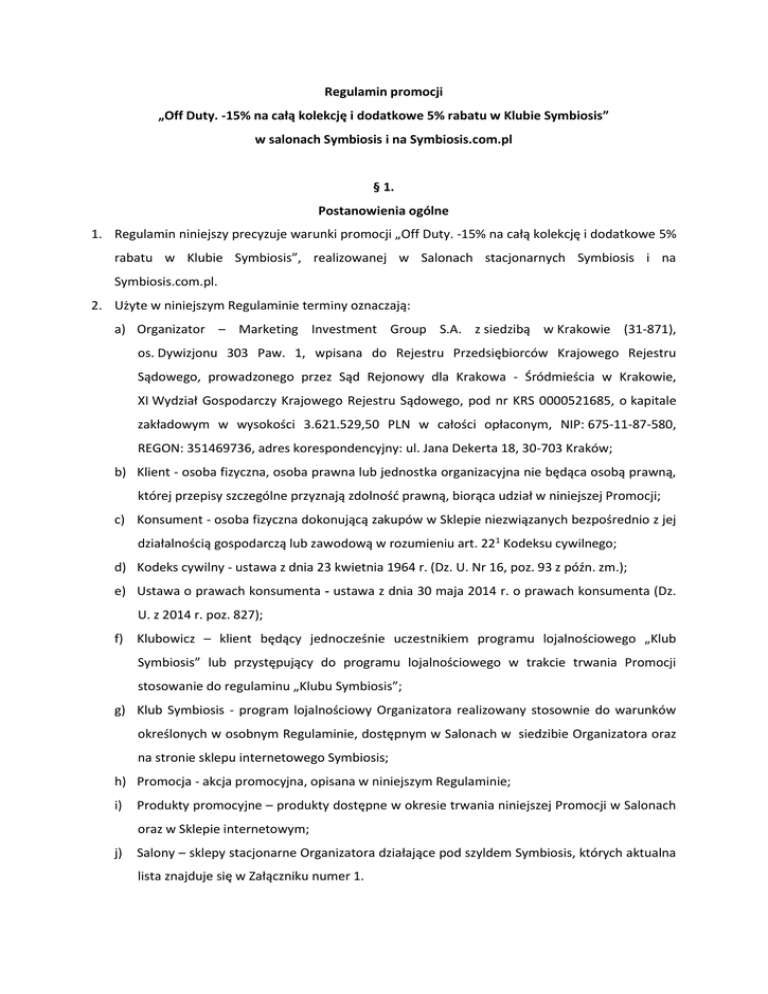 Regulamin promocji „Off Duty. -15% na całą kolekcję i dodatkowe 5% rabatu w Klubie Symbiosis” w salonach Symbiosis i na Symbiosis.com.pl § 1. Postanowienia ogólne 1. Regulamin niniejszy precyzuje warunki promocji „Off Duty. -15% na całą kolekcję i dodatkowe 5% rabatu w Klubie Symbiosis”, realizowanej w Salonach stacjonarnych Symbiosis i na Symbiosis.com.pl. 2. Użyte w niniejszym Regulaminie terminy oznaczają: a) Organizator – Marketing Investment Group S.A. z siedzibą w Krakowie (31-871), os. Dywizjonu 303 Paw. 1, wpisana do Rejestru Przedsiębiorców Krajowego Rejestru Sądowego, prowadzonego przez Sąd Rejonowy dla Krakowa - Śródmieścia w Krakowie, XI Wydział Gospodarczy Krajowego Rejestru Sądowego, pod nr KRS 0000521685, o kapitale zakładowym w wysokości 3.621.529,50 PLN w całości opłaconym, NIP: 675-11-87-580, REGON: 351469736, adres korespondencyjny: ul. Jana Dekerta 18, 30-703 Kraków; b) Klient - osoba fizyczna, osoba prawna lub jednostka organizacyjna nie będąca osobą prawną, której przepisy szczególne przyznają zdolność prawną, biorąca udział w niniejszej Promocji; c) Konsument - osoba fizyczna dokonującą zakupów w Sklepie niezwiązanych bezpośrednio z jej działalnością gospodarczą lub zawodową w rozumieniu art. 221 Kodeksu cywilnego; d) Kodeks cywilny - ustawa z dnia 23 kwietnia 1964 r. (Dz. U. Nr 16, poz. 93 z późn. zm.); e) Ustawa o prawach konsumenta - ustawa z dnia 30 maja 2014 r. o prawach konsumenta (Dz. U. z 2014 r. poz. 827); f) Klubowicz – klient będący jednocześnie uczestnikiem programu lojalnościowego „Klub Symbiosis” lub przystępujący do programu lojalnościowego w trakcie trwania Promocji stosowanie do regulaminu „Klubu Symbiosis”; g) Klub Symbiosis - program lojalnościowy Organizatora realizowany stosownie do warunków określonych w osobnym Regulaminie, dostępnym w Salonach w siedzibie Organizatora oraz na stronie sklepu internetowego Symbiosis; h) Promocja - akcja promocyjna, opisana w niniejszym Regulaminie; i) Produkty promocyjne – produkty dostępne w okresie trwania niniejszej Promocji w Salonach oraz w Sklepie internetowym; j) Salony – sklepy stacjonarne Organizatora działające pod szyldem Symbiosis, których aktualna lista znajduje się w Załączniku numer 1. k) Sklep internetowy - sklep internetowy Organizatora prowadzony pod adresem: http://www.symbiosis.com.pl/ l) Regulamin – niniejszy dokument wraz z załącznikami. §2 Zasady i czas trwania Promocji 1. Promocja obowiązuje w Salonach w okresie od dnia 7 stycznia 2017 r. do dnia 8 stycznia 2017 r. 2. Promocja obowiązuje w Sklepie internetowym w okresie od dnia 6 stycznia 2017 r. do dnia 8 stycznia 2017 r. 3. W ramach promocji Organizator umożliwia wszystkim Klientom, którzy w okresie jej trwania dokonają w Salonie lub w Sklepie internetowym zakupu Produktów promocyjnych, uzyskanie rabatu w wysokości 15% (słownie: piętnaście procent) od aktualnej ceny zakupionego Produktu promocyjnego. W Sklepie internetowym ceny z uwzględnieniem wyżej wskazanego rabatu widoczne są obok Produktów promocyjnych. 4. Wskazany rabat nie łączy się z innymi akcjami promocyjnymi Organizatora za wyjątkiem rabatu wynikającego z Regulaminu „Klub Symbiosis”. Maksymalna wysokość rabatu, jaki może uzyskać Klubowicz w niniejszej Promocji wynosi 20% (słownie: dwadzieścia procent). 5. Chęć przystąpienia do Promocji w Salonie należy zgłosić przed wystawieniem dokumentu fiskalnego. § 3. Zasady zwrotu i wymiany Produktów promocyjnych zakupionych w Sklepie internetowym 1. Zgodnie z art. 27 Ustawy o prawach konsumenta Konsumentowi przysługuje prawo do odstąpienia od Umowy Sprzedaży Produktów promocyjnych bez podania jakiejkolwiek przyczyny w terminie 14 (słownie: czternastu) dni od dnia w którym Konsument wszedł w posiadanie Produktów promocyjnych lub w którym wskazana przez Konsumenta osoba trzecia inna niż Kurier weszła w posiadanie Produktów promocyjnych. 2. Konsument ponosi odpowiedzialność za zmniejszenie wartości Produktu promocyjnego będące wynikiem korzystania z niego w sposób wykraczający poza konieczny do stwierdzenia charakteru, cech i funkcjonowania Produktu. 3. Ponad uprawnienia Konsumenta, o których mowa w § 3. ust 1 niniejszego Regulaminu Sprzedawca przyznaje wszystkim Klientom dodatkową umowną możliwość odstąpienia od Umowy Sprzedaży bez podawania przyczyn poprzez złożenie właściwego oświadczenia Sprzedawcy na piśmie w terminie do 30 dni od daty wejścia w posiadanie Produktów promocyjnych przez Klienta, pod warunkiem że zwracane Produkty są w stanie niezmienionym, chyba że zmiana była konieczna w granicach zwykłego zarządu. 4. W terminie 30 dni (słownie: trzydziestu) od dnia otrzymania Produktów promocyjnych mogą one zostać wymienione na inne Produkty promocyjne w tej samej cenie, pod warunkiem że zwracane produkty są w stanie niezmienionym (brak śladów użytkowania i/lub zniszczenia), chyba że zmiana była konieczna w granicach zwykłego zarządu. §4. Zasady zwrotu oraz wymiany Produktów promocyjnych zakupionych w Salonach 1. Klientowi przysługuje prawo do odstąpienia od umowy sprzedaży Produktów promocyjnych bez podania przyczyn poprzez złożenie oświadczenia na piśmie w terminie 30 dni (słownie: trzydziestu) od dnia otrzymania Produktów promocyjnych, pod warunkiem, ze zwracane produkty znajdują się w stanie niezmienionym (brak śladów użytkowania i/lub zniszczenia), chyba że zmiana była konieczna w granicach zwykłego zarządu. 2. W przypadku odstąpienia od umowy sprzedaży w ramach niniejszej Promocji Klientowi zwracana jest tylko i wyłącznie cena rzeczywiście przez niego uiszczona za Produkty promocyjne. 3. W terminie 30 dni (słownie: trzydziestu) od dnia otrzymania Produktów promocyjnych mogą one zostać wymienione na inne Produkty promocyjne w tej samej cenie, pod warunkiem że zwracane produkty są w stanie niezmienionym (brak ś