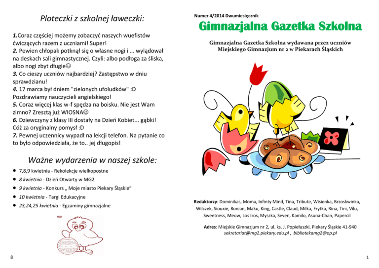 Ploteczki z szkolnej ławeczki: 1.Coraz częściej możemy zobaczyć naszych wuefistów ćwiczących razem z uczniami! Super! 2. Pewien chłopak potknął się o własne nogi i ... wylądował na deskach sali gimnastycznej. Czyli: albo podłoga za śliska, albo nogi zbyt długie 3. Co cieszy uczniów najbardziej? Zastępstwo w dniu sprawdzianu! 4. 17 marca był dniem "zielonych ufoludków" :D Pozdrawiamy nauczycieli angielskiego! 5. Coraz więcej klas w-f spędza na boisku. Nie jest Wam zimno? Zresztą już WIOSNA 6. Dziewczyny z klasy III dostały na Dzień Kobiet... gąbki! Cóż za oryginalny pomysł :D 7. Pewnej uczennicy wypadł na lekcji telefon. Na pytanie co to było odpowiedziała, że to.. jej długopis! Numer 4/2014 Dwumiesięcznik Gimnazjalna Gazetka Szkolna Gimnazjalna Gazetka Szkolna wydawana przez uczniów Miejskiego Gimnazjum nr 2 w Piekarach Śląskich Ważne wydarzenia w naszej szkole: 7,8,9 kwietnia - Rekolekcje wielkopostne 8 kwietnia - Dzień Otwarty w MG2 9 kwietnia - Konkurs „ Moje miasto Piekary Śląskie” 10 kwietnia - Targi Edukacyjne 23,24,25 kwietnia - Egzaminy gimnazjalne Redaktorzy: Dominikas, Moma, Infinty Mind, Tina, Tribute, Wisienka, Brzoskwinka, Wilczek, Siouxie, Ronian, Maku, King, Castle, Claud, Milka, Frytka, Rina, Tini, Vilu, Sweetness, Meow, Los Iros, Myszka, Seven, Kamilo, Asuna-Chan, Papercil Adres: Miejskie Gimnazjum nr 2, ul. ks. J. Popiełuszki, Piekary Śląskie 41-940 [email protected] , [email protected] 8 1 Marzenia czasem się spełniają! W tym numerze: Z okazji zbliżających się świąt Wielkanocnych W zeszłym roku w poznańskim Eskulapie odbył się koncert amerykańskiej grupy muzycznej Black Veil Brides. Miałem okazję tam być, więc postanowiłem zdać Wam relację. Pod klubem byłem ok. godz. 16:00, więc na pewno parę rzeczy mnie ominęło… Kiedy przybyłem na miejsce zrobiono zdjęcie grupowe. Później zaczęto podpisywać polską flagę, która miała być wręczona członkom zespołu. Następnie zaczęło się oczekiwanie na koncert. Gdy otworzyły się drzwi wszyscy zaczęli wchodzić, chcąc zająć jak najlepszą pozycję na dalsze chwile,więc można było się lekko zdenerwować. Całą imprezę zaczął pierwszy suport: Srawberry Blondes, a później drugi: Heaven's Basement. Spisali się na medal, a wszyscy dobrze się bawili. Po ich występie nastąpiło 30 min. oczekiwania na gwiazdy wieczoru. Nagle światła zgasły, wszyscy skandowali nazwę zespołu, aż nagle na scenę wszedł perkusista, a następnie reszta muzyków. Zaczęli od piosenki "Shadows Die",a skończyli na "In the end". Podobno kilka osób podczas koncertu zemdlało – pewnie wskutek zbyt dużej dawki wrażeńPo koncercie dużo osób czekało na swoich idoli pod klubem, ja niestety musiałem już iść. Ale przed pójściem na dworzec zrobiłem jeszcze parę zdjęć z supportem. Koncert bardzo mi się podobał, jestem szczęśliwy, gdyż spełniło się jedno z moich marzeń. Mam nadzieję, że BVB szybko wróci do Polski i ponownie przeżyję to, co stało się tamtego dnia. David Seven życzymy wszystkim kolorowych pisanek, Zielony dzień Zielony dzień Słodycz w nowej odsłonie When a man loves a woman…czyli 8 marca w naszej szkole Marzenia czasem się spełniają! Najważniejszy jest szacunek dla człowieka Osiągnięcia sportowe Ważne wydarzenia w naszej szkole Sukcesy naukowe pyszności na stole, mokrego dyngusa oraz spokoju. Redakcja GGS 2 17.03.2014 roku w naszym gimnazjum odbyło się "zielone święto". Był to dzień św. Patryka. W tym dniu uczniowie naszej szkoły ubrali się na zielono. Na korytarzach rozbrzmiewała muzyka, a niektórzy zaczęli nawet tańczyć. Dzień Świętego Patryka jest dniem wolnym od pracy w Irlandii, Irlandii Północnej, Nowej Fundlandii i Labradorze oraz na Montserrat. Najważniejszą tradycją obchodów dnia św. Patryka jest noszenie ubrań w kolorze zielonym. Zieleń to narodowy kolor Irlandii, nawiązujący do trawiastego krajobrazu wyspy i symbolizujący koniczynę przypisywaną tradycyjnie świętemu Patrykowi. Irlandczycy w wielu miastach organizują festyny i uliczne pochody, w których dominuje właśnie zieleń i irlandzka muzyka. Uczniowie żartowali, że jest to "ostatnia dyskoteka w tym roku szkolnym". Bardzo spodobały mi się obchody tego święta w naszej szkole. Myślę, że nie tylko mnie. Szczególnie, że dodatkową atrakcją i bonusem dla ZIELONYCH było zwolnienie w tym dniu od pytania na lekcjach… Rina 7 When a man loves a woman…czyli 8 marca w naszej szkole Niedawno, czyli ósmego marca był Dzień Kobiet. Niestety odbyło się to w sobotę, więc chłopcy z naszej szkoły musieli zorganizować go w piątek. Dziewczyny z klasy If były mile zaskoczone niespodzianką ze strony klasy sportowej. Sportowcy z pierwszej klasy nie chcą pozwolić, aby dziewczyny schudły, dlatego też słodko uczcili ich święto. Prosto i zwięźle złożyli życzenia, a później rozdali im słynne batoniki PRINCESSA. Wychowawca klasy żeńskiej wdzięczny był chłopakom, gdyż zajadające dziewczyny w końcu były cicho. Sam wychowawca klasy poczęstował dziewczyny w poniedziałek, na informatyce, lizakami. Mimo panujących zasad w pracowni, nie potrafiły one oprzeć się smacznie wyglądającym słodkościom. Za to dziewczyny z klasy III otrzymały w prezencie m.in. gąbki. Zgadujemy, że przydadzą się one do pożyczania ich chłopakom, a już szczególnie po WF'ie… Dzień Kobiet pozwala płci żeńskiej na bezwarunkowe ,,rządzenie światem”. W tym dniu mężczyźni starają się o względy kobiet i robią wszystko, by im się przypodobać. To święto pozwala 6 kobietom poczuć się ważniejszymi niż zwykle i chyba tylko wtedy (przynajmniej niektóre) usłyszą „KOCHAM CIĘ” z ust chłopaka, a nie przeczytają tego tylko na facebook'u. Tini i Vilu Jak być dobrym przyjacielem/ przyjaciółką ? Każdy chciałby mieć swojego przyjaciela. Wielu z nas nie ma żadnych znajo