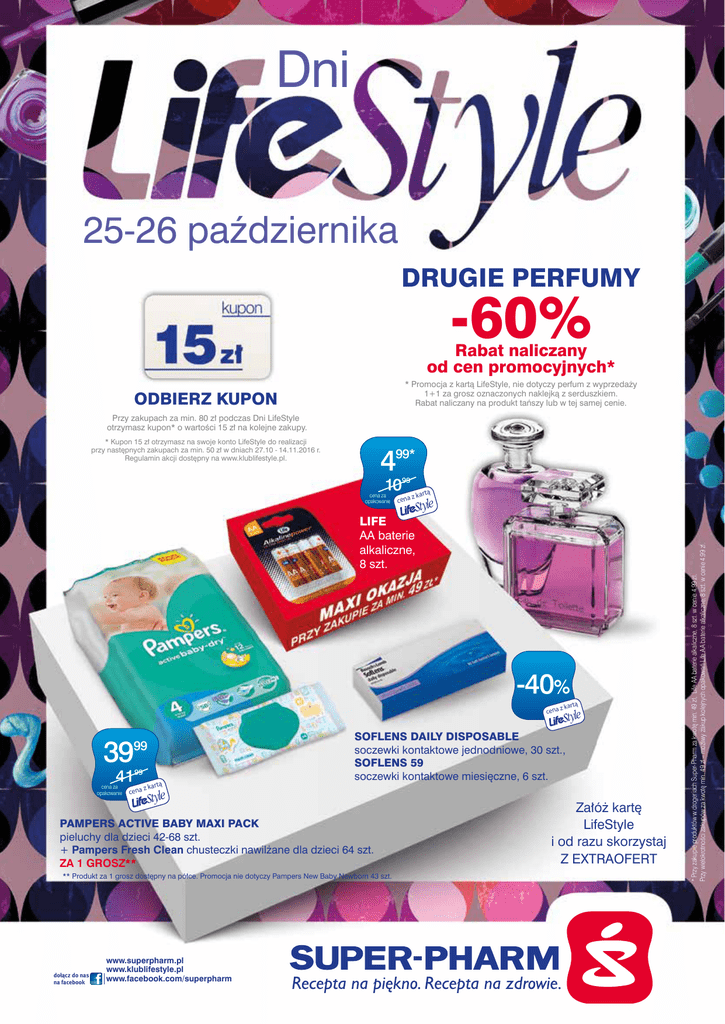 Dni 25-26 października DRUGIE PERFUMY -60% Rabat naliczany od cen promocyjnych* * Promocja z kartą LifeStyle, nie dotyczy perfum z wyprzedaży 1+1 za grosz oznaczonych naklejką z serduszkiem. Rabat naliczany na produkt tańszy lub w tej samej cenie. ODBIERZ KUPON Przy zakupach za min. 80 zł podczas Dni LifeStyle otrzymasz kupon* o wartości 15 zł na kolejne zakupy. * Kupon 15 zł otrzymasz na swoje konto LifeStyle do realizacji przy następnych zakupach za min. 50 zł w dniach 27.10 - 14.11.2016 r. Regulamin akcji dostępny na www.klublifestyle.pl. 499* z cena kartą LIFE AA baterie alkaliczne, 8 szt. -40% z cena 39 99 4199 cena za opakowanie z cena kartą SOFLENS DAILY DISPOSABLE soczewki kontaktowe jednodniowe, 30 szt., SOFLENS 59 soczewki kontaktowe miesięczne, 6 szt. PAMPERS ACTIVE BABY MAXI PACK pieluchy dla dzieci 42-68 szt. + Pampers Fresh Clean chusteczki nawilżane dla dzieci 64 szt. ZA 1 GROSZ** ** Produkt za 1 grosz dostępny na półce. Promocja nie dotyczy Pampers New Baby Newborn 43 szt. dołàcz do nas na facebook www.superpharm.pl www.klublifestyle.pl www.facebook.com/superpharm kartą Załóż kartę LifeStyle i od razu skorzystaj Z EXTRAOFERT * Przy zakupie produktów w drogeriach Super-Pharm za kwotę min. 49 zł, Life AA baterie alkaliczne, 8 szt. w cenie 4.99 zł. Przy wielokrotności zakupów za kwotę min. 49 zł – możliwy zakup kolejnych opakowań Life AA baterie alkaliczne, 8 szt. w cenie 4.99 zł. 1099 cena za opakowanie OFERTA WAŻNA WE WTOREK 25.10.2016 r. kosmetyki do pielęgnacji twarzy i ciała kosmetyki do makijażu kosmetyki do makijażu kosmetyki do pielęgnacji twarzy i ciała kosmetyki do pielęgnacji ciała i włosów kosmetyki do pielęgnacji twarzy, ciała i włosów* kosmetyki do pielęgnacji twarzy i ciała* kosmetyki do pielęgnacji twarzy i ciała * Nie dotyczy serii AHS i Derma Spa. * Nie dotyczy mini produktów i zestawów. kosmetyki do pielęgnacji i oczyszczania twarzy żele pod prysznic i antyperspiranty dla mężczyzn kosmetyki do pielęgnacji i stylizacji włosów produkty do higieny jamy ustnej* * Nie dotyczy zestawów, miniproduktów szczoteczek bateryjnych oraz pena wybielającego. produkty do golenia i po goleniu* kosmetyki do pielęgnacji włosów * Nie dotyczy wkładów. kosmetyki do pielęgnacji i stylizacji włosów produkty do stylizacji włosów produkty do pielęgnacji stóp wszystkie produkty * Nie dotyczy kremu przeciwgrzybiczego 15 ml. A partner for people. For life. produkty do stylizacji włosów ręczniki kuchenne, papiery toaletowe odświeżacze powietrza, olejki zapachowe, dyfuzery, saszetki i kadzidełka kosmetyki do pielęgnacji twarzy, ciała i włosów, do makijażu oraz suplementy diety* * Nie dotyczy pieluch i dermokosmetyków. ciśnieniomierze, termometry, inhalatory oraz inny sprzęt medyczny produkty do higieny intymnej dla kobiet suplementy diety wspomagające prawidłowe funkcjonowanie organizmu* suplementy diety wspomagające prawidłowe funkcjonowanie organizmu* * Nie dotyczy produktów dla sportowców. orzeszki, bakalie, snacki i batony zbożowe * Nie dotyczy toników. * Promocja -50% na produkty marek pokazanych na tej stronie obowiązuje wyłącznie 25.10.2016 r. (lub do wyczerpania zapasów) w drogeriach i perfumeriach Super-Pharm, nie dotyczy aptek. Promocje nie łączą się i nie dotyczą zestawów. Limit zakupowy produktów promocyjnych, przypadający na jednego klienta (kartę LifeStyle), wynosi po 5 sztuk produktów z każdej promocji przez cały okres trwania akcji promocyjnej (z wyłączeniem Vichy, gdzie limit na jednego klienta wynosi 2 szt.). W czasie trwania akcji nie obowiązuje formularz Promocyjnej Ceny Gwarantowanej (PCG). W przypadku wyczerpania zapasów nie ma możliwości nabycia produktów w cenach promocyjnych w późniejszym terminie. Regulamin promocji dostępny na stronie www.klublifestyle.pl. OFERTA WAŻNA W ŚRODĘ 26.10.2016 r. kosmetyki do pielęgnacji twarzy i makijażu* * Promocja nie dotyczy kosmetyków do pielęgnacji ciała i włosów, limit na jednego klienta wynosi 2 szt. kosmetyki do pielęgnacji i oczyszczania twarzy i ciała* * Nie dotyczy produktów do higieny jamy ustnej oraz mini produktów. kosmetyki do makijażu kosmetyki do pielęgnacji twarzy, ciała i włosów kosmetyki do pielęgnacji twarzy i ciała kosmetyki do pielęgnacji twarzy, ciała i włosów* kosmetyki do pielęgnacji twarzy i ciała* kosmetyki do pielęgnacji twarzy i ciała * Nie dotyczy serii AHS i Derma Spa. * Nie dotyczy mini produktów i zestawów. kosmetyki do pielęgnacji i oczyszczania twarzy kosmetyki do pielęgnacji włosów kosmetyki do pielęgnacji i stylizacji włosów produkty do higieny jamy ustnej* * Nie dotyczy zestawów, miniproduktów szczoteczek bateryjnych oraz pena wybielającego. produkty do golenia i po goleniu* kosmetyki do pielęgnacji włosów * Nie dotyczy wkładów. kosmetyki do pielęgnacji i stylizacji włosów produkty do stylizacji włosów produkty do pielęgnacji stóp wszystkie produkty * Nie dotyczy kremu przeciwgrzybiczego 15 ml. A partner for people. For life. produkty do stylizacji włosów ręczniki kuchenne, papiery toaletowe odświeżacze powietrza, olejki zapachowe, dyfuzery, saszetki i kadzidełka kosmetyki do pielęgnacji twarzy, ciała i włosów, do makijażu oraz suplementy diety* * Nie dotyczy pieluch i dermokosmetyków. ciśnieniomierze, termometry, inhalatory oraz inny sprzęt medyczny produkty do higieny intymnej dla kobiet suplementy diety wspomagające prawidłowe funkcjonowanie organizmu* suplementy diety wspomagające prawidłowe funkcjonowanie organizmu* * Nie dotyczy produktów dla sportowców. orzeszki, bakalie, snacki i batony zbożowe * Nie dotyczy toników. * Promocja -50% na produkty marek pokazanych na tej stronie obowiązuje wyłącznie 26.10.2016 r. (lub do wyczerpania zapasów) w drogeriach i perfumeriach Super-Pharm, nie dotyczy aptek. Promocje nie łączą się i nie dotyczą zestawów. Limit zakupowy produktów promoc
