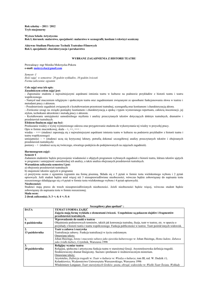 Rok szkolny – 2011 / 2012 Tryb stacjonarny Wyższa Szkoła Artystyczna Rok I, kierunek: malarstwo, specjalność: malarstwo w scenografii, kostium i rekwizyt sceniczny Aktywne Studium Plastyczne Technik Teatralno-Filmowych Rok I, specjalność: charakteryzacja i perukarstwo WYBRANE ZAGADNIENIA Z HISTORII TEATRU Prowadzący: mgr Monika Mokrzycka-Pokora e-mail: [email protected] Semestr: I Ilość zajęć w semestrze: 20 godzin wykładów, 10 godzin ćwiczeń Forma zaliczenia: egzamin Cele zajęć oraz ich opis: Zasadniczym celem zajęć jest: - Zapoznanie studenta z najważniejszymi aspektami istnienia teatru w kulturze na podstawie przykładów z historii teatru i teatru współczesnego. - Namysł nad znaczeniem religijnym i społecznym teatru oraz zagadnieniami związanymi ze sposobami funkcjonowania słowa w teatrze i metodami pracy z aktorem. - Przedstawienie zagadnień związanych z kształtowaniem przestrzeni teatralnej, scenografią oraz kostiumem i charakteryzacją aktora. - Zwrócenie uwagi na związki pomiędzy kostiumem i charakteryzacją a epoką i typem wystawianego repertuaru, całością inscenizacji, jej stylem, technikami aktorskimi i metodą pracy z aktorem. - Kształtowanie umiejętności samodzielnego myślenia i analizy przeczytanych tekstów dotyczących doktryn teatralnych, dramatów i przedstawień teatralnych. Efektem finalnym zajęć ma być: Przekazanie wiedzy z wyżej wymienionego zakresu oraz przygotowanie studenta do wykorzystania tej wiedzy w przyszłej pracy. Opis w formie znacznikowej, skala – +, ++, +++ : wiedza – +++ (studenci zapoznają się z najważniejszymi aspektami istnienia teatru w kulturze na podstawie przykładów z historii teatru i teatru współczesnego) umiejętności – + (studenci uczą się krytycznej lektury, potrafią dokonać szczegółowej analizy przeczytanych tekstów i obejrzanych przedstawień teatralnych) postawy – + (studenci uczą się twórczego, otwartego podejścia do podejmowanych na zajęciach zagadnień). Harmonogram zajęć: Semestr I Zadaniem studentów będzie przyswojenie wiadomości z objętych programem wybranych zagadnień z historii teatru, lektura tekstów ujętych w programie i umiejętność samodzielnej ich analizy, a także analiza obejrzanych przedstawień teatralnych. Warunkiem zaliczenia semestru I jest: a) obejrzenie przedstawień teatralnych b) znajomość tekstów ujętych w programie c) pozytywna ocena z egzaminu (egzamin ma formę pisemną. Składa się z 5 pytań w formie testu wielokrotnego wyboru i 2 pytań opisowych. Jeśli student będzie miał więcej niż 3 nieusprawiedliwione nieobecności, wówczas będzie zobowiązany do napisania testu rozszerzonego składającego się z 6 pytań w formie testu wielokrotnego wyboru i 4 pytań opisowych). Nieobecności: Studenci mają prawo do trzech nieusprawiedliwionych nieobecności. Jeżeli nieobecności będzie więcej, wówczas student będzie zobowiązany do napisania testu w formie rozszerzonej. Skala ocen: 2 (brak zaliczenia); 3; 3 +; 4; 4 +; 5; 6 DATA 1. 6 października 2. 13 października 3. 20 października Szczegółowy plan spotkań* : TEMAT I FORMA ZAJĘĆ Zajęcia mają formę wykładu z elementami ćwiczeń. Uzupełnione są pokazem slajdów i fragmentów przedstawień teatralnych. Wprowadzenie do nauki o teatrze Objaśnienie podstawowych terminów, takich jak konwencja teatralna, iluzja, teatr w teatrze, etc. w oparciu o przykłady z historii teatru i teatru współczesnego. Funkcja publiczności w teatrze. Teatr pośród innych widowisk. Teatr a zabawa i rozrywka Teatralizacja zabawy. Funkcja teatralizacji w życiu codziennym. Omawiane teksty: Johan Huizinga, Istota i znaczenie zabawy jako zjawiska kulturowego w: Johan Huizinga, Homo ludens. Zabawa jako źródło kultury, Czytelnik, Warszawa 1998 Religijny wymiar teatru Religijna, społeczna i artystyczna funkcja teatru w starożytnej Grecji. Arystotelesowska definicja tragedii. Średniowieczny dramat liturgiczny. Sacrum i profanum w średniowiecznym misterium. Omawiane teksty: Arystoteles, Definicja tragedii w: Teatr w kulturze w: Wiedza o kulturze, tom III, red. W. Dudzik i L. Kolankiewicz, Wydawnictwo Uniwersytetu Warszawskiego, Warszawa 1996 Włodzimierz Lengauer, Teatr starożytnych Greków: poeta, obrzęd, widowisko w: Wielki Teatr Świata. Wykłady 4. 27 października 5. 3 listopada 6. 10 listopada 7. 17 listopada 8. 24 listopada 9. 1 grudnia 10. 8 grudnia 11. 5 stycznia 12. 12 stycznia 13. 19 stycznia 14. 26 stycznia 30 stycznia – 5 lutego 13 – 19 lutego otwarte na scenie przy Wierzbowej, Teatr Narodowy, Warszawa 2003 Słowo w teatrze Teatr elżbietańskiej Anglii jako teatr do słuchania. Omawiane teksty: William Szekspir, Hamlet (wiele wydań) Społeczny wymiar teatru Teatr Moliera. Cyrulik sewilski Pierre’a Beaumarchais i Wielka Rewolucja Francuska. Omawiane teksty: Molier, Don Juan (wiele wydań) Społeczny wymiar teatru Dziady Adama Mickiewicza w reżyserii Kazimierza Dejmka i polski Marzec’68. Teatr Jana Klaty. Omawiane spektakle: H. na podstawie Hamleta Williama Szekspira, reż. Jan Klata, Teatr Wybrzeże w Gdańsku Przestrzeń teatralna Krąg i scena pudełkowa. Przestrzeń tragedii klasycznej. Przestrzeń naturalistyczna. Przestrzeń symboliczna – projekty scenograficzne Adolphe’a Appi. Pusta przestrzeń Petera Brooka. Omawiane teksty: Adolphe Appia, Żywa przestrzeń w: Adolphe Appia, Dzieło sztuki żywej i inne prace, WaiF, Warszawa 1974 Scenografia Kierunki plastyczne na scenie – ekspresjonizm, konstruktywizm, kubizm. Ludowość na scenie. Kostium i rekwizyt Włoska commedia dell’arte. Pojęcie maski. Omawiane teksty: Allardyce Nicoll, Komedia sprawności w: Allardyce Nicoll, W świecie Arlekina, PIW, Warszawa 1967 Kostium i rekwizyt Prace scenograficzne Małgorzaty Szczęśniak. Omawiane spektakle: Hanoch Levin, Krum, reż. Krzysztof Warlikowski, TR Warszawa, Narodowy Stary Teatr im. Heleny Modrzejewskiej w Krakowie Aktor Metoda aktorska Kons